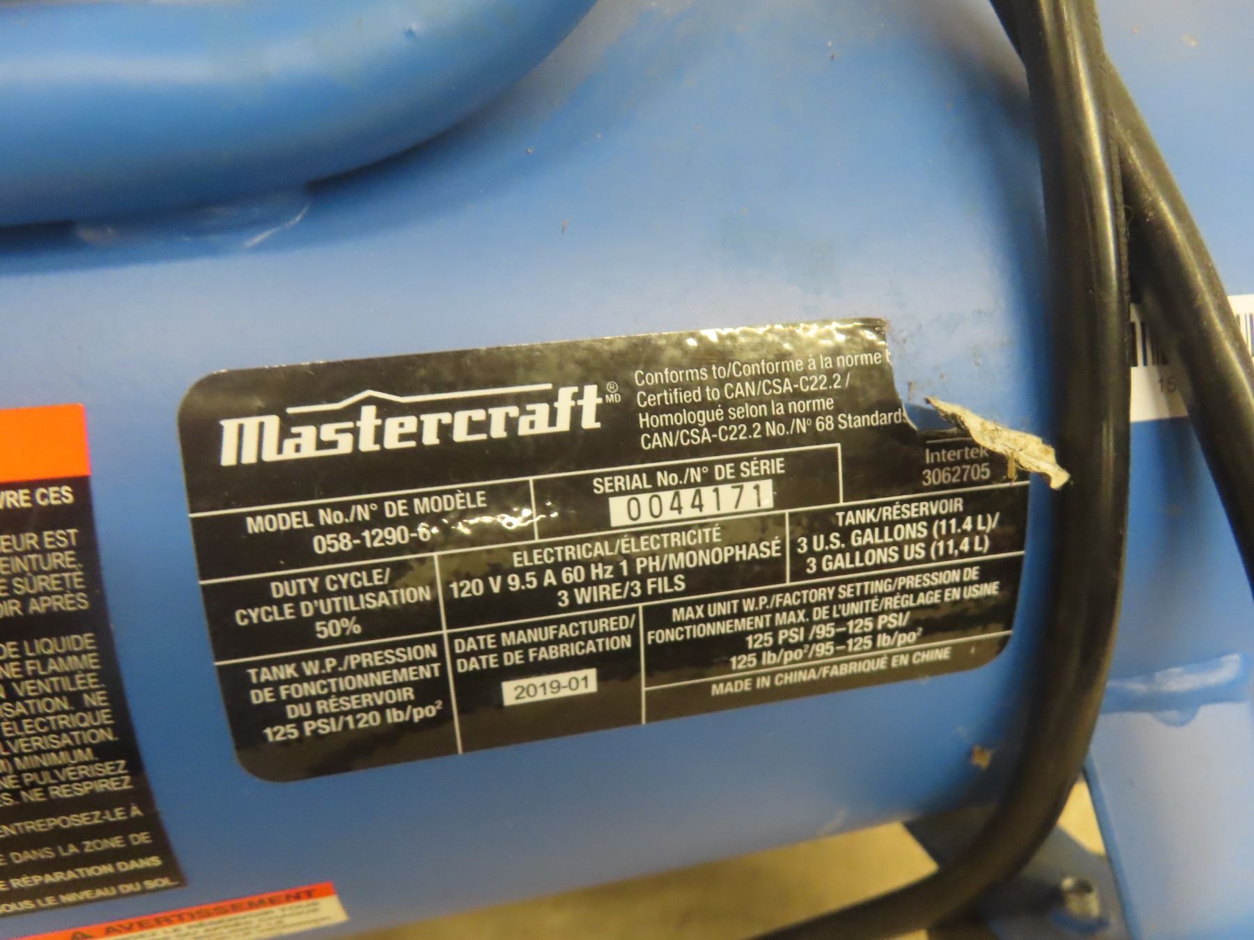 Mastercraft 1 hp 3 Gallon Air Compressor
