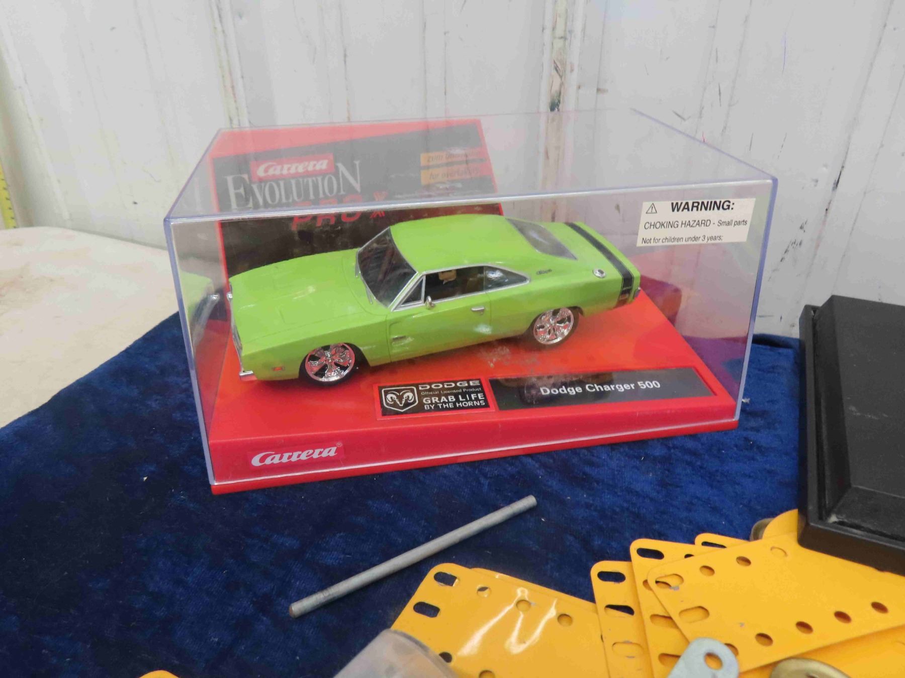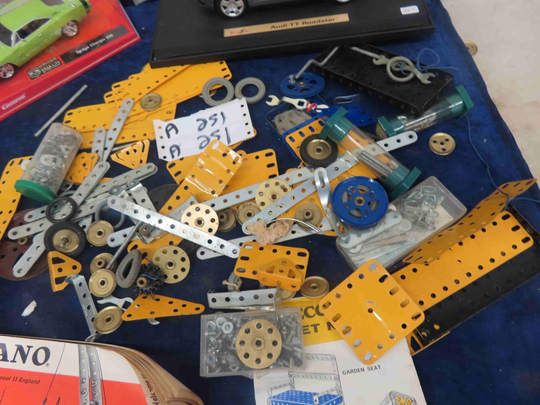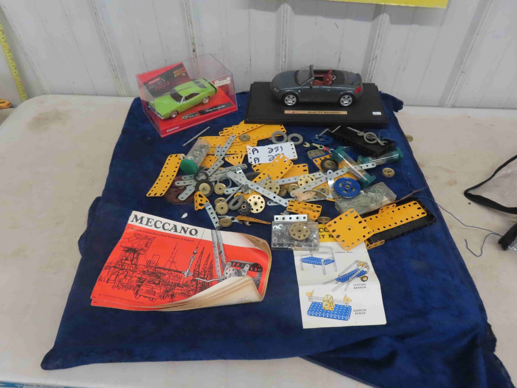 Meccano Pieces and Set of Instructions & 2 Die Cast Cars ; Dodge 500 + Audi Roadster