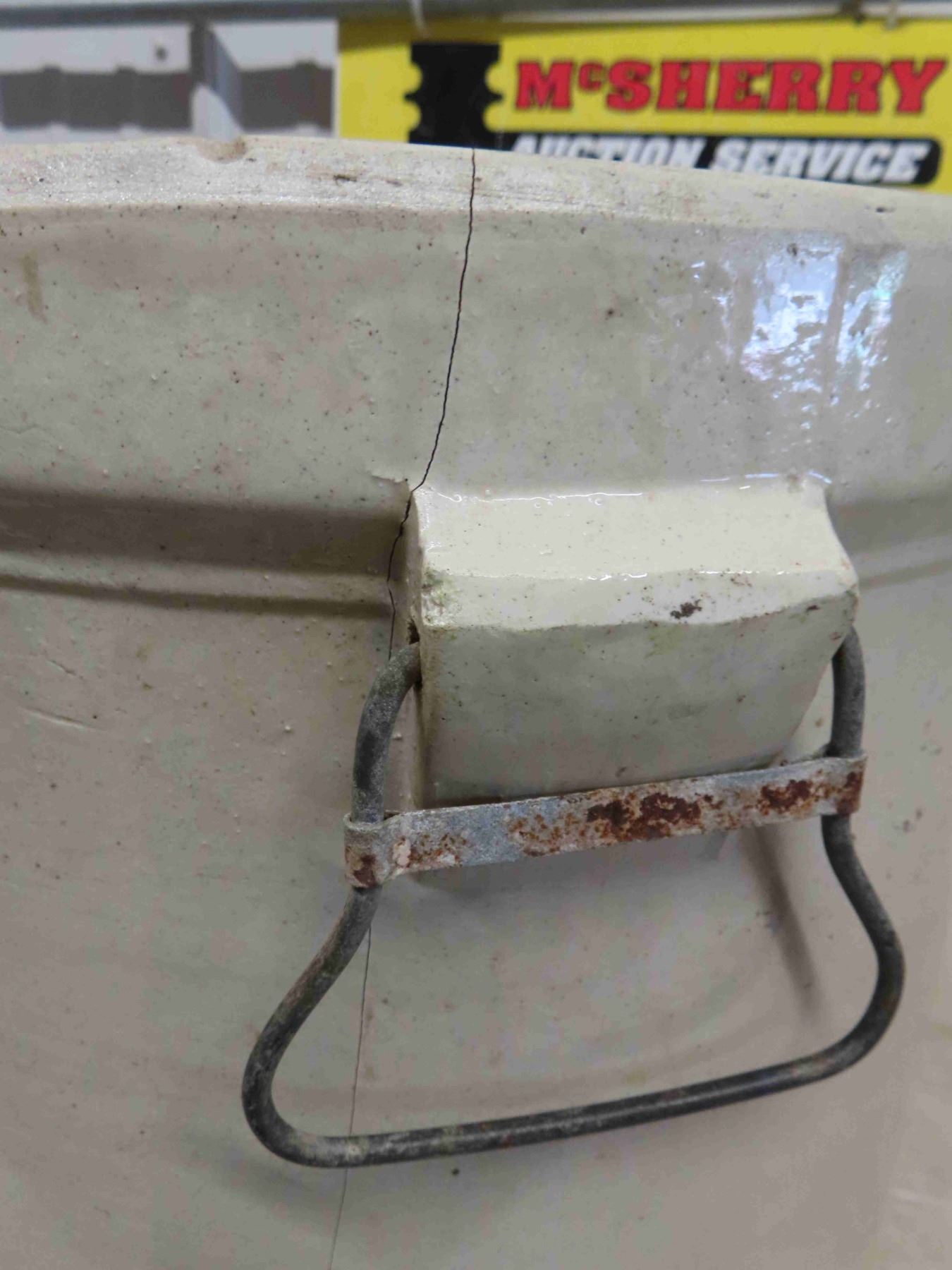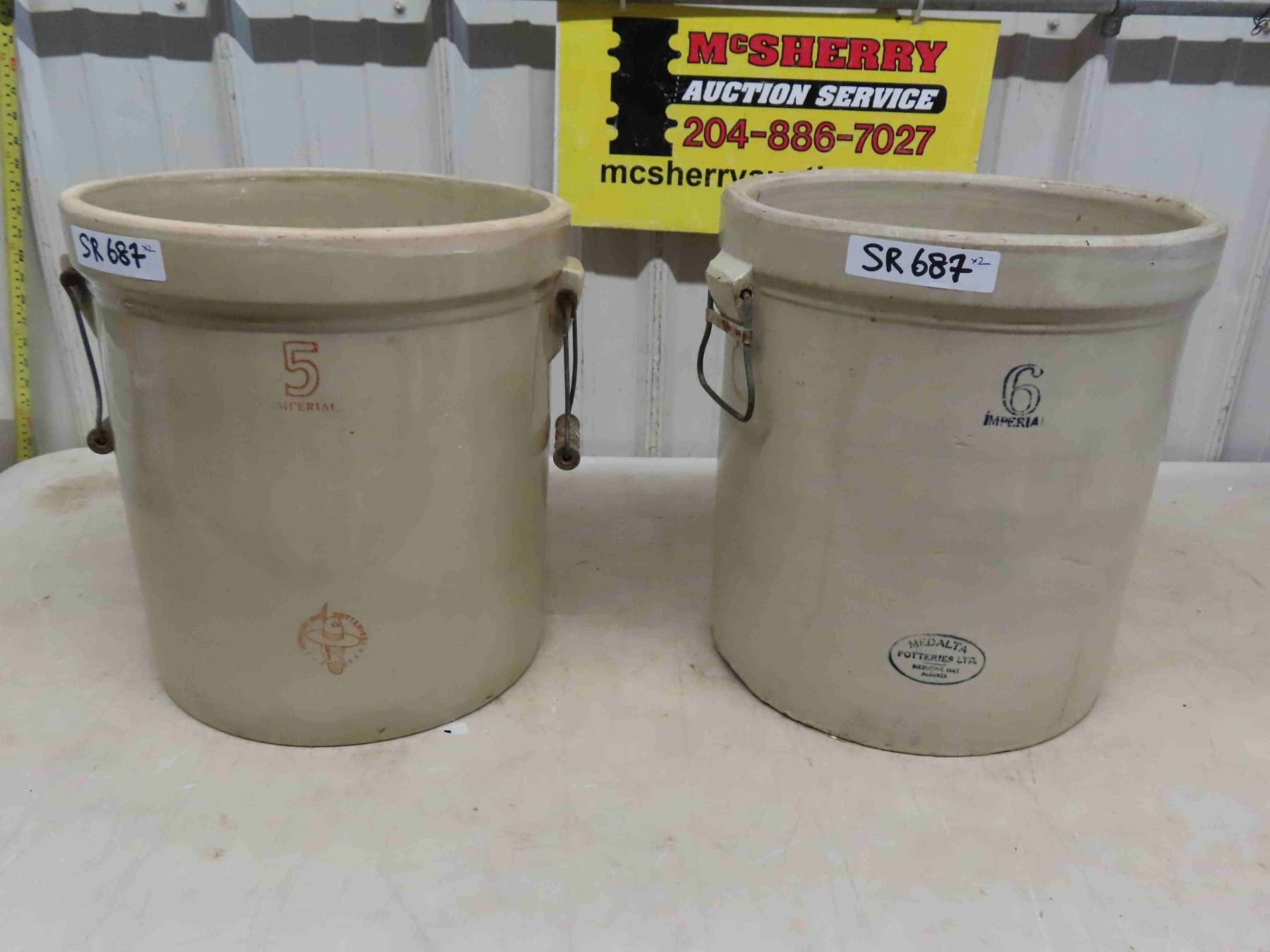 Medicine Hat Potteries 5 Gal Crock with Good Handles, 6 Gal Medalta Crock with Chip on Bottom