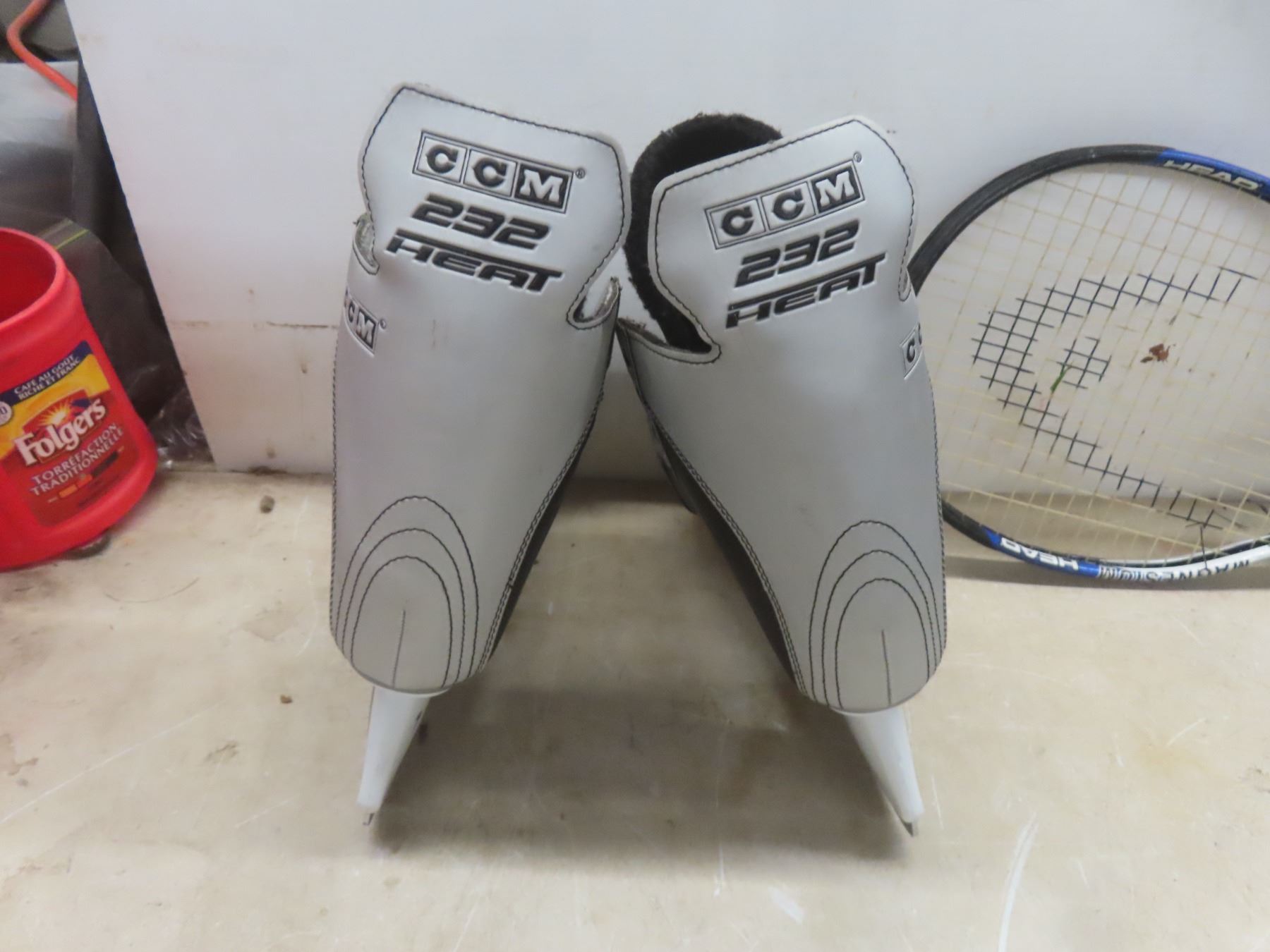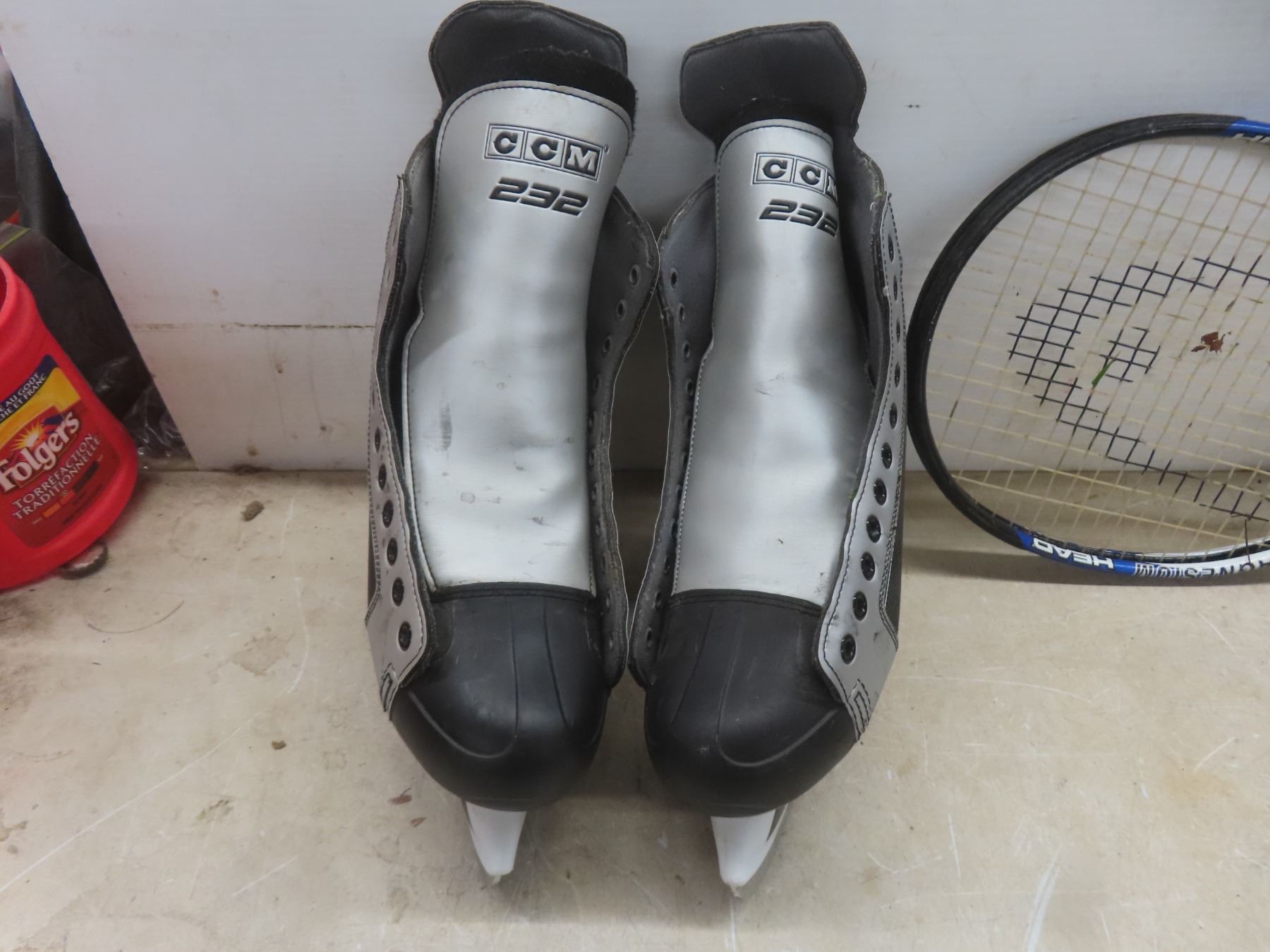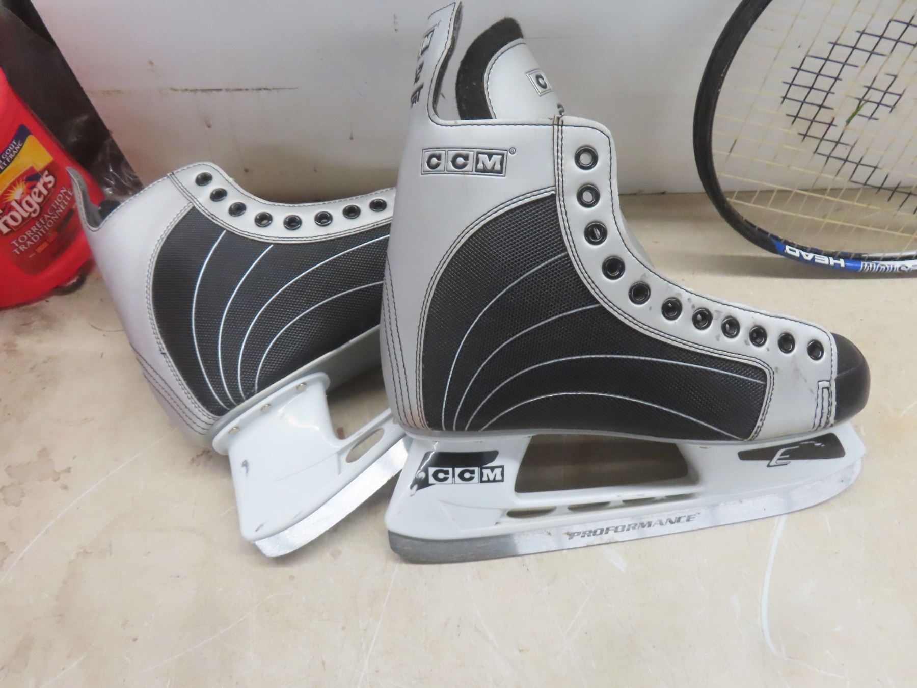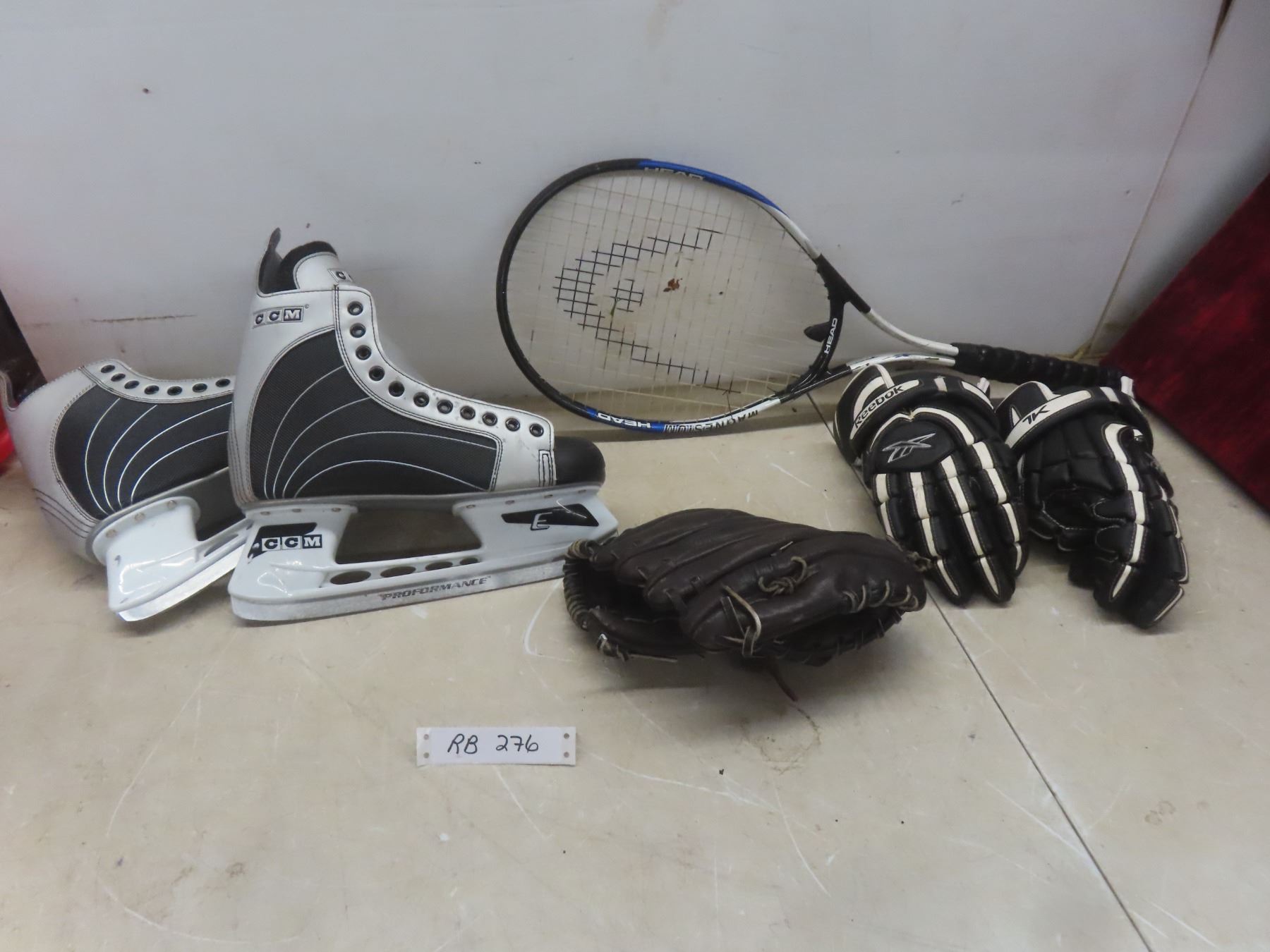 Men’s Sports Lot: CCM Skates Size 11, Reebok Hockey Gloves, Tennis Racket, and Baseball Glove