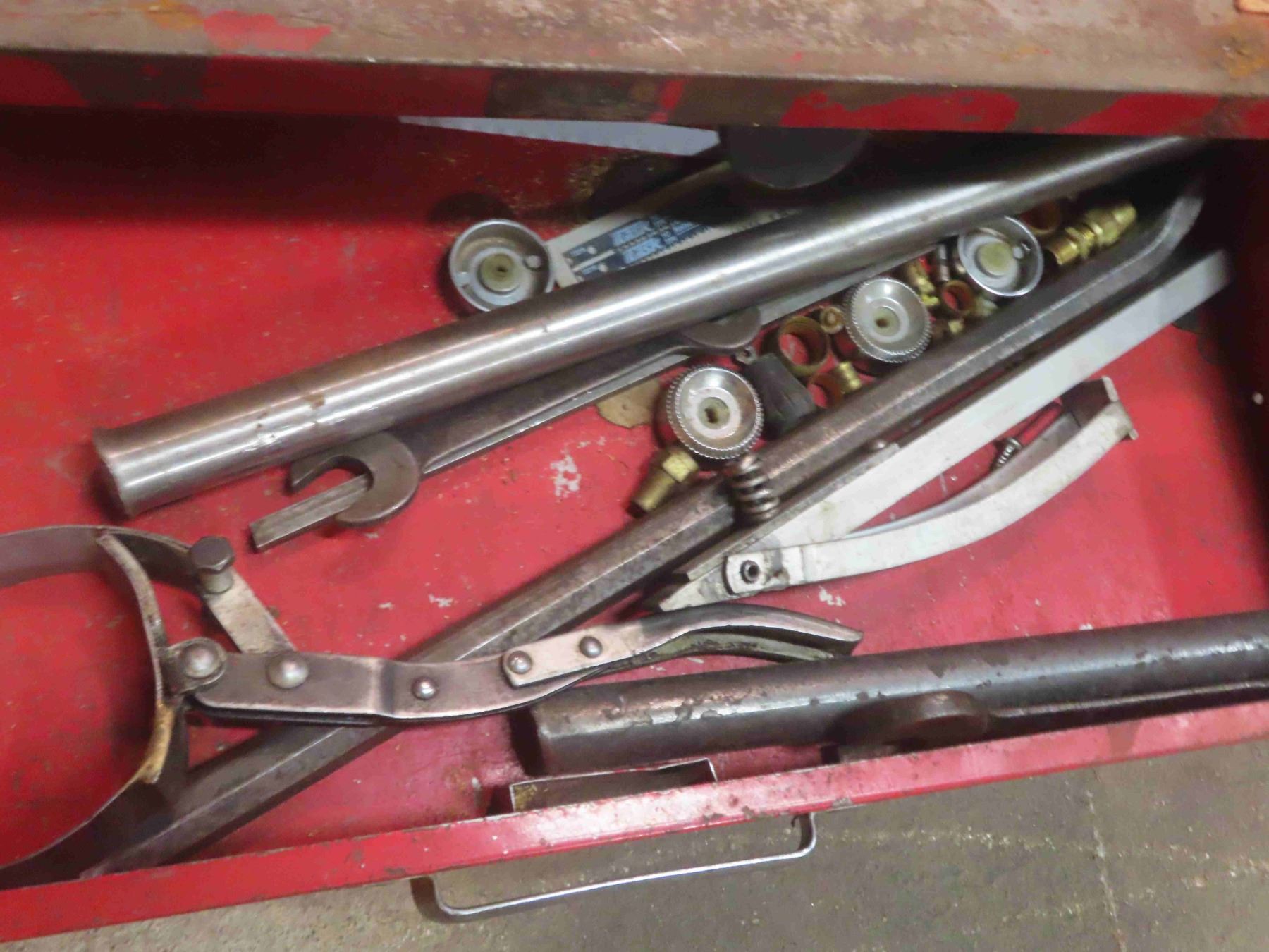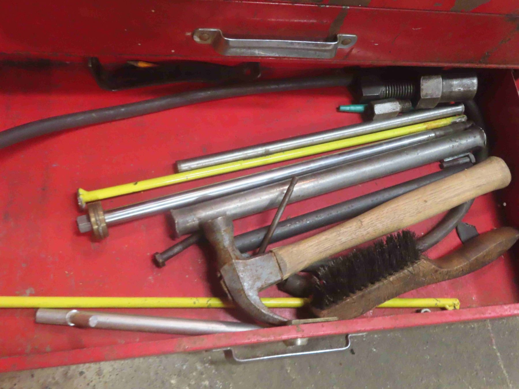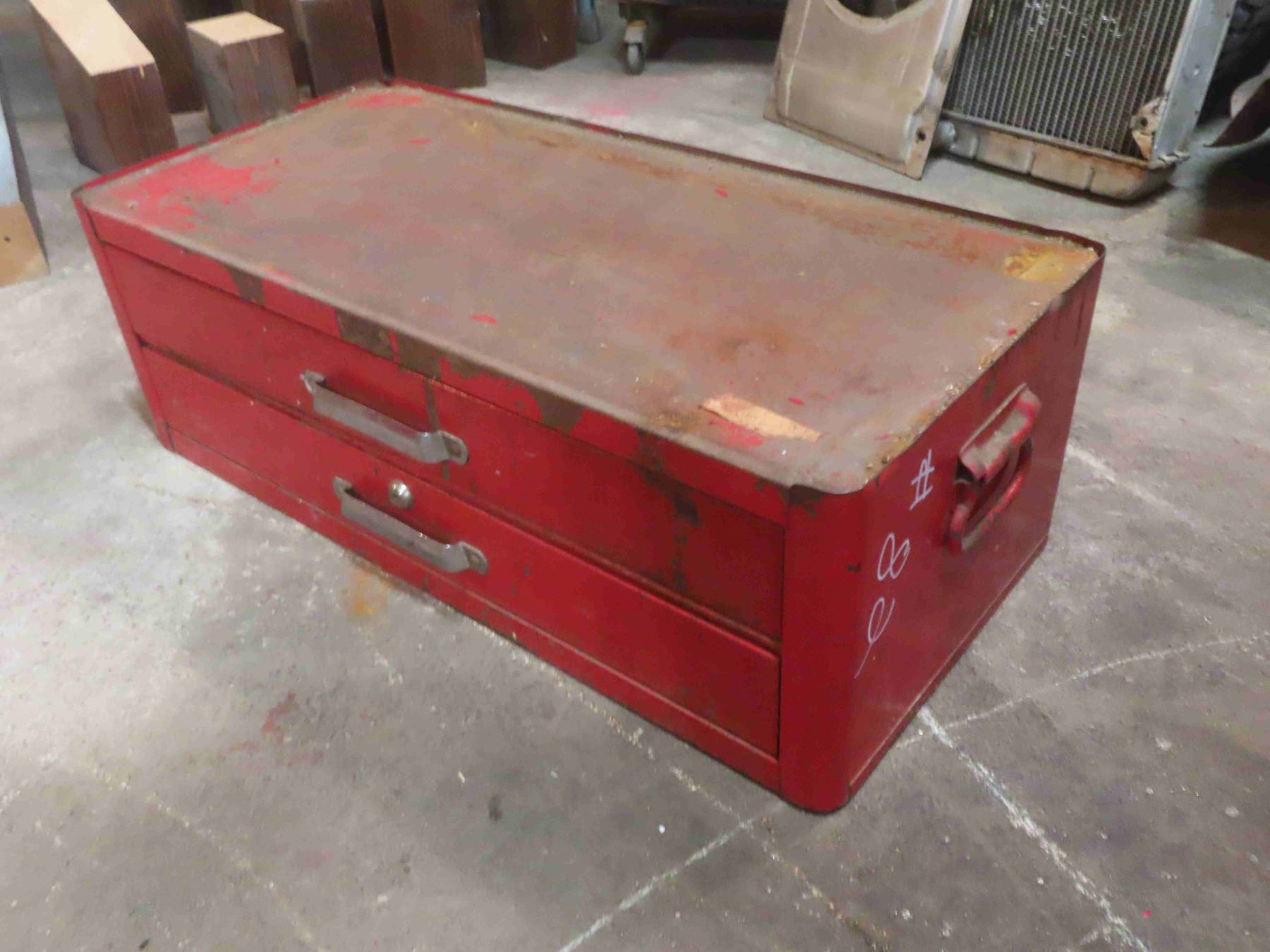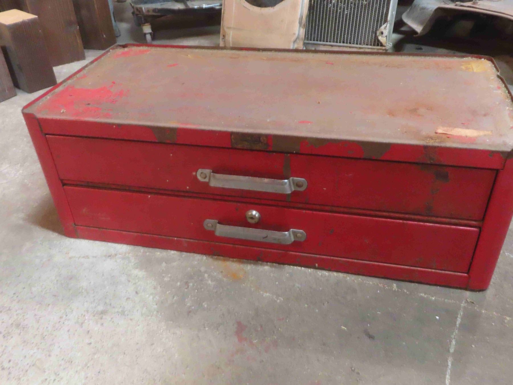 Metal 2 Drawer Center Piece Tool Cabinet 9'' Tall x 26 1/2'' Wide x 12'' Deep with Tools ; Hammers, Bolts, Filter Wrench, Wrecking Bar