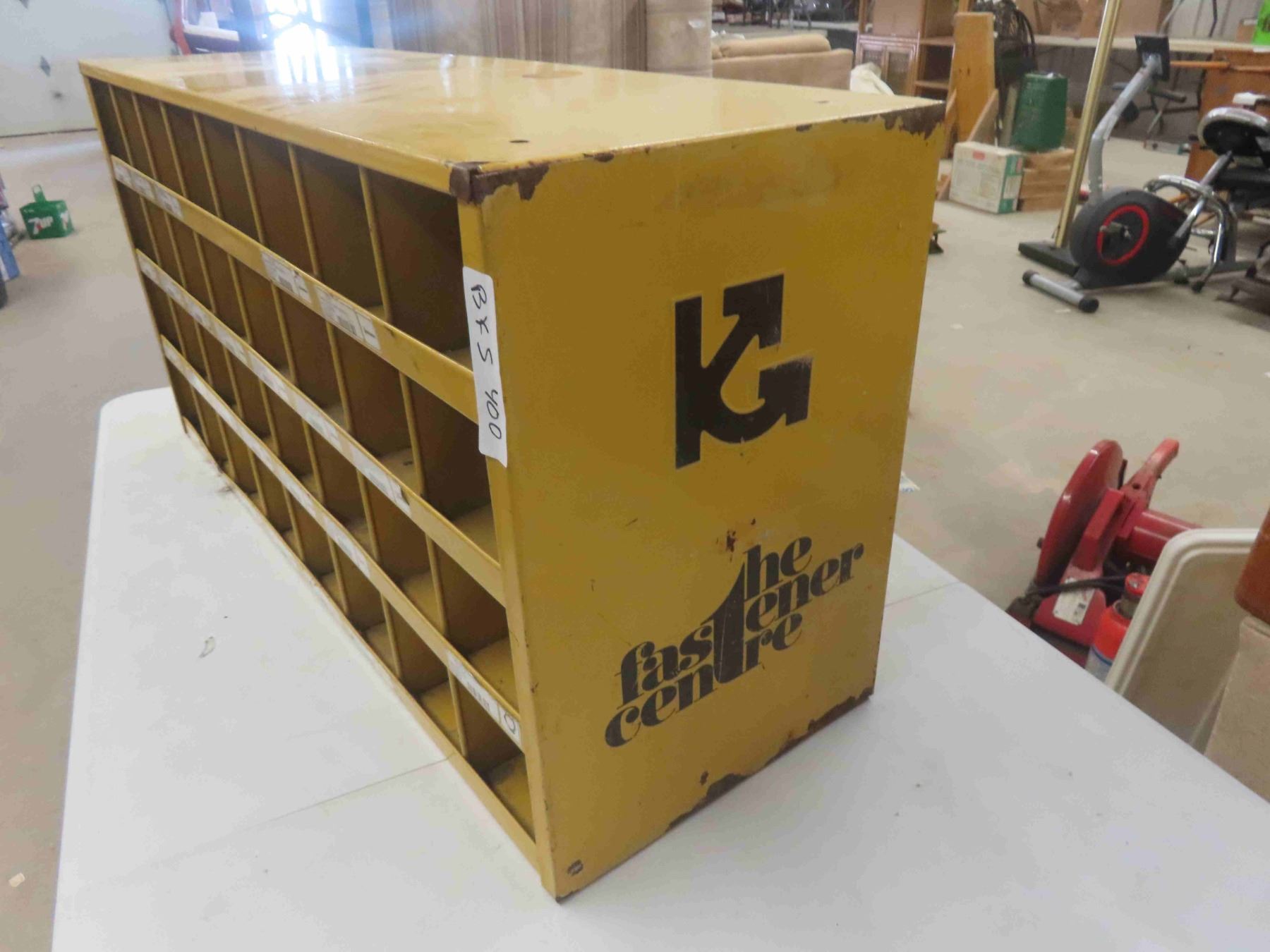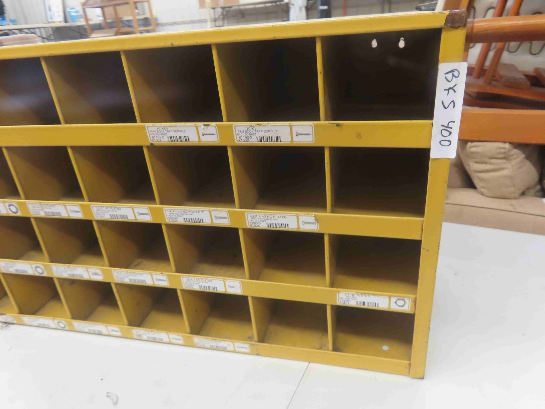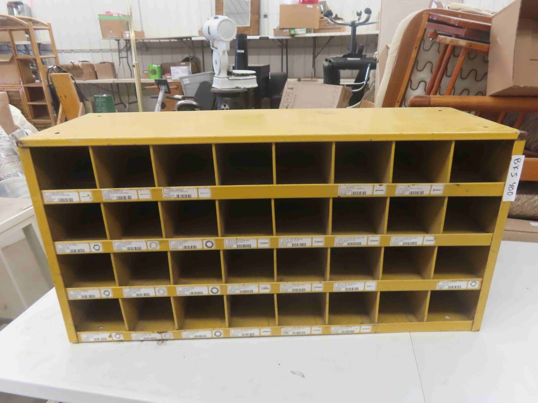 Metal 24-Pigeon Bolt Bin with Advertising. 17 1/2'' x 35'' x 12''