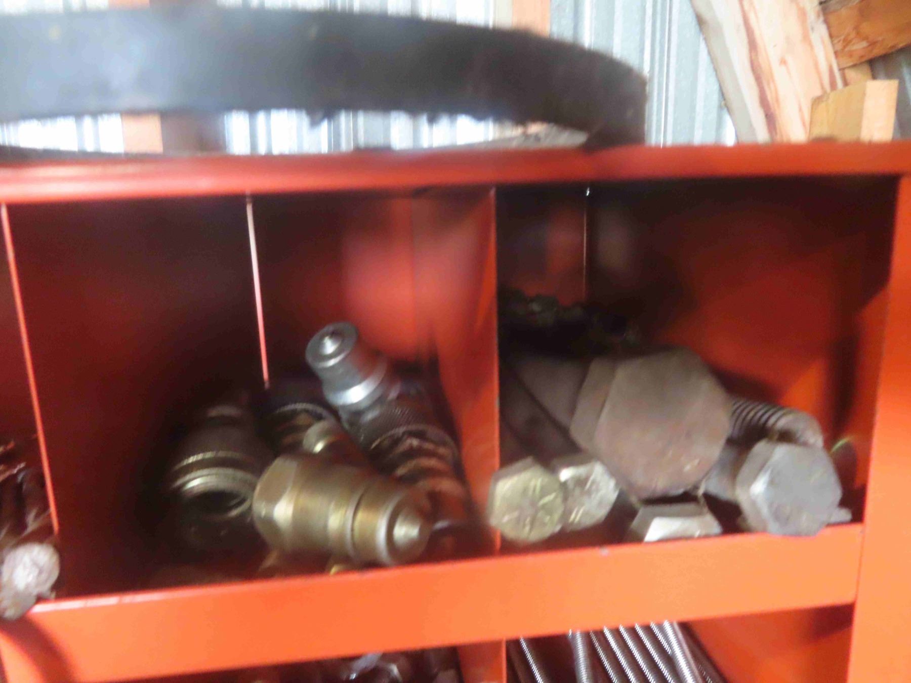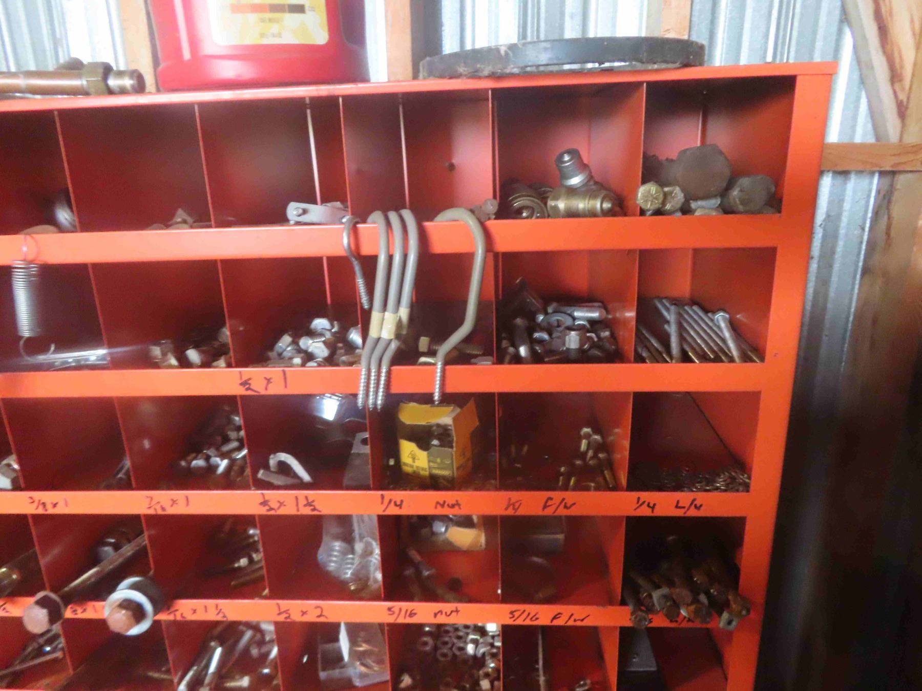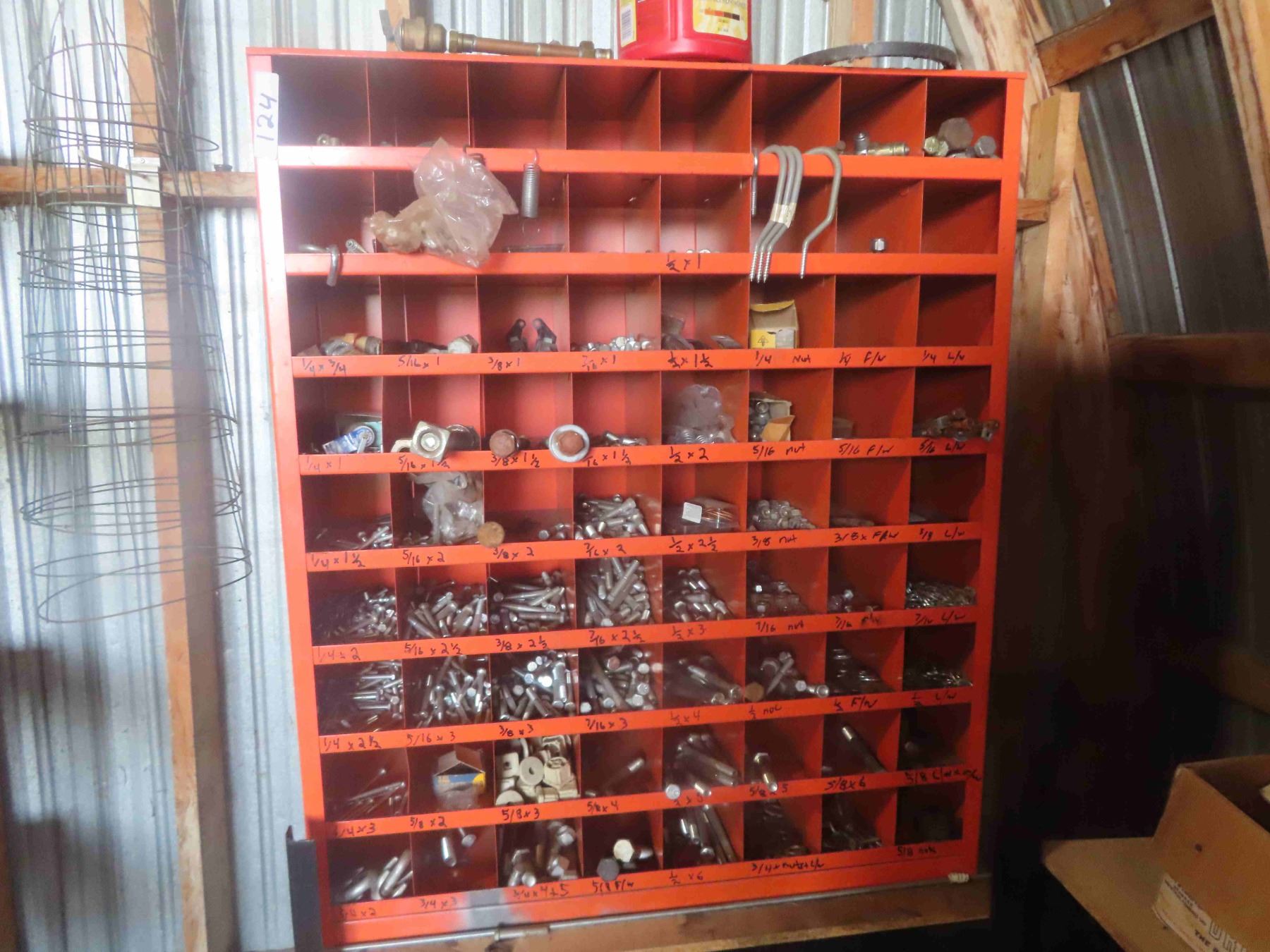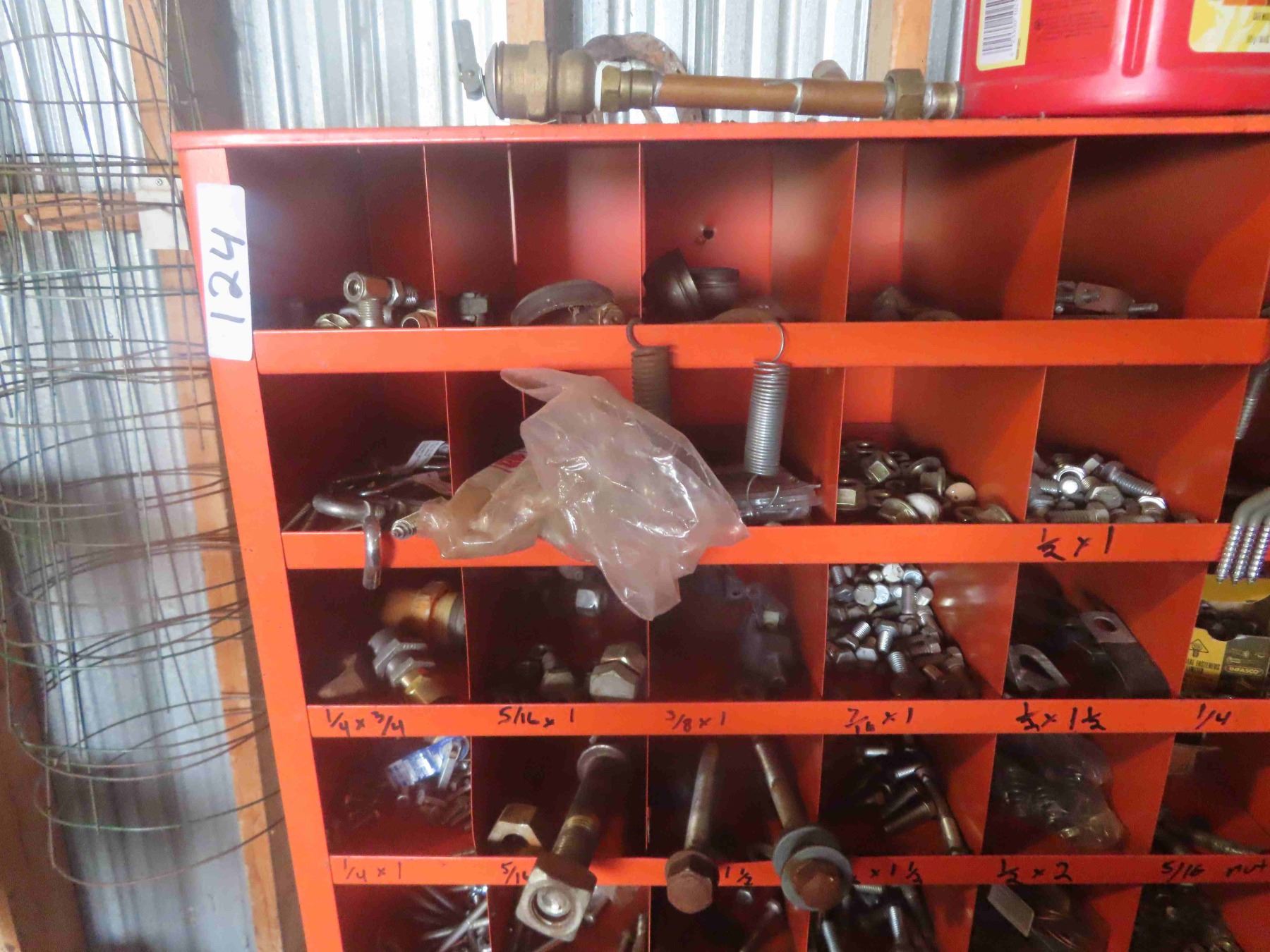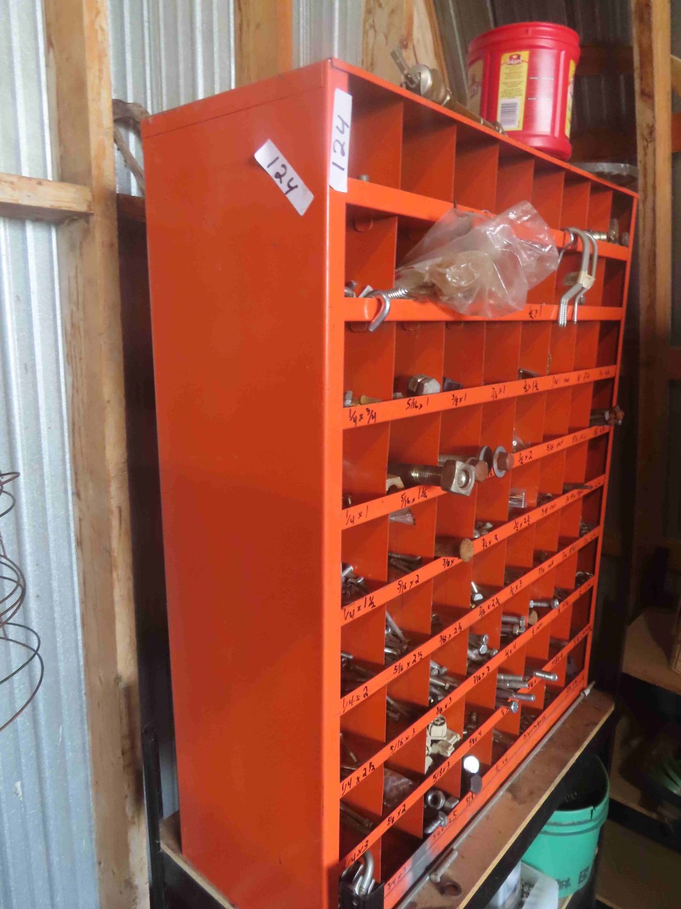 Metal Bolt Bin with 72 Pigeon Holes 42'' x 35.5'' x 12'' with Bolts, Nuts, Washers, Cable Clamps, Hydraulic Fittings, Plus