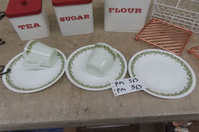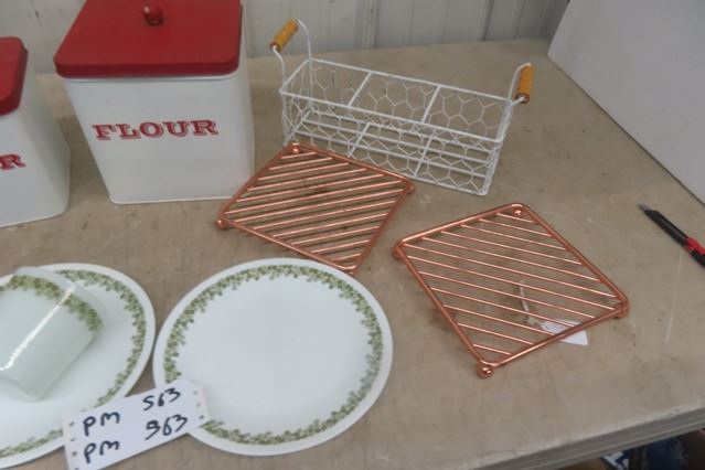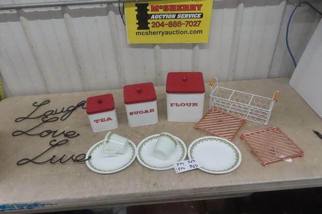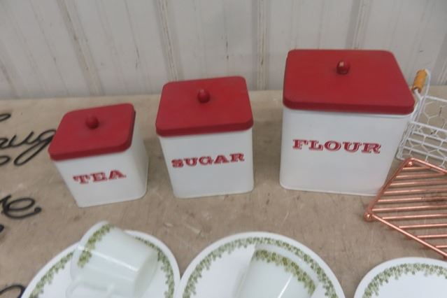 Metal Canister Set, some Correl, Trivet, Slogan Cast Iron