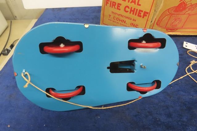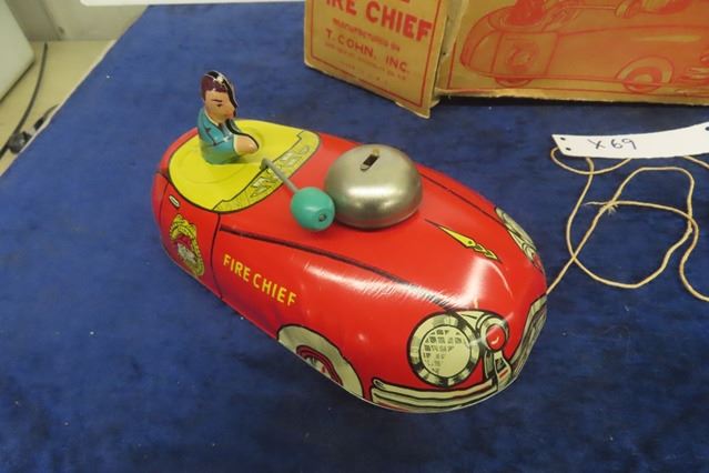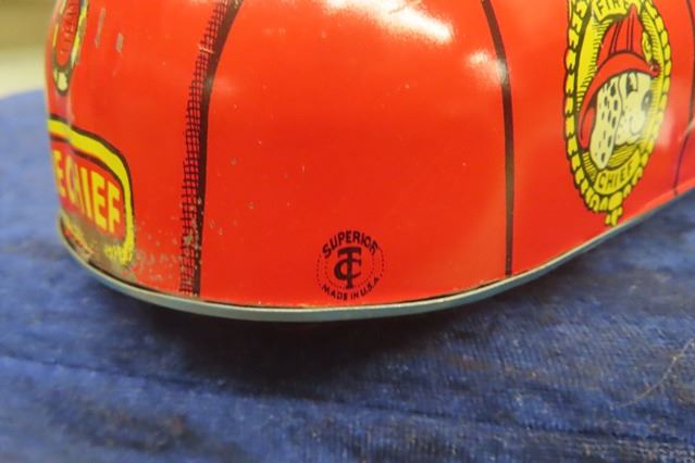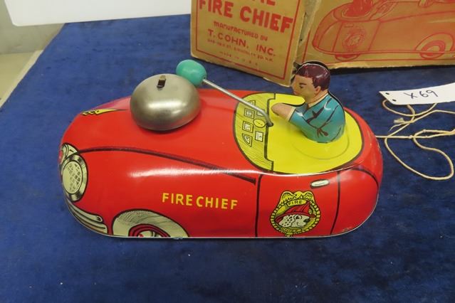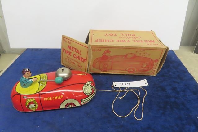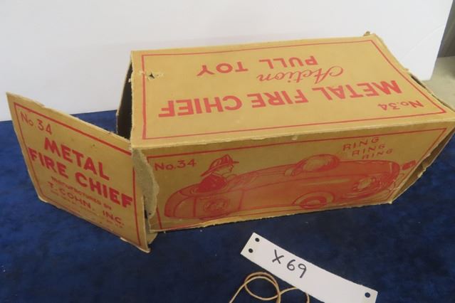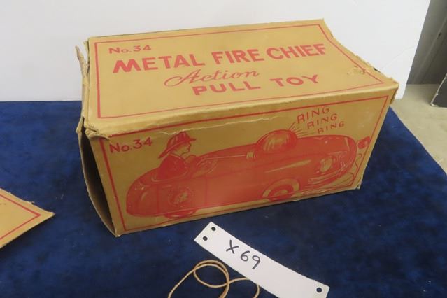 Metal Fire Chief Action Pull Toy in Original Box T.Cohn - Made in USA - End Flap is Off