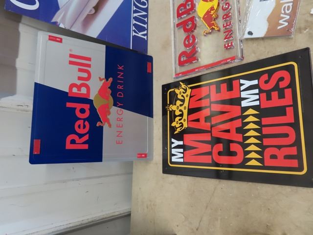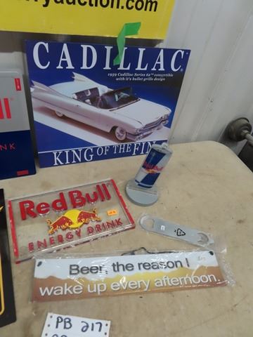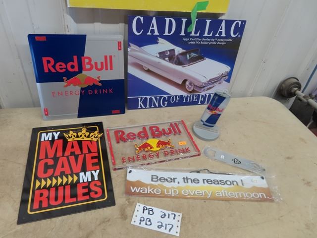 Metal Red Bull Sign, Cadillac Sign, Metal Man Cave Sign Plus More