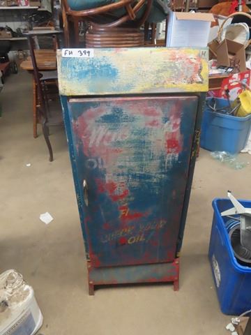 Metal Service Station Cabinet- Has Decals but painted over - Hinges need mending 42" x 17" x 12"