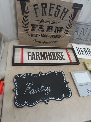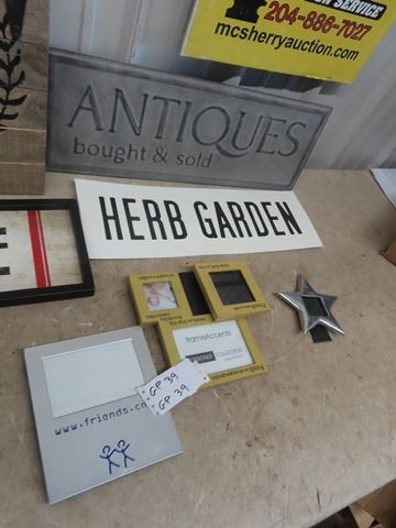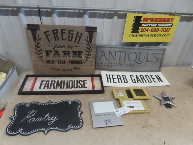 Metal Sign 'Antiques' , Wooden 'Farm' Sign, Picture Frames