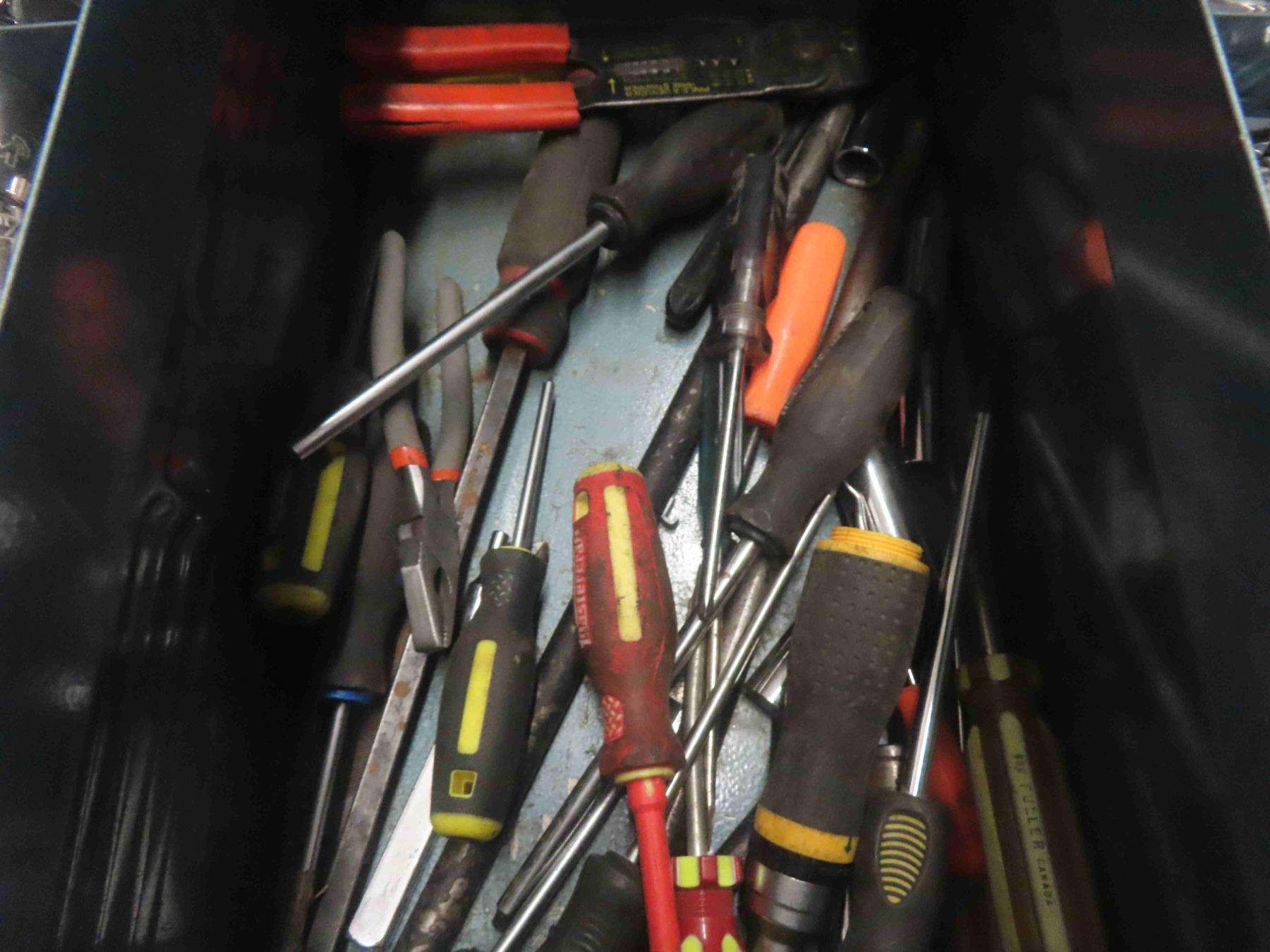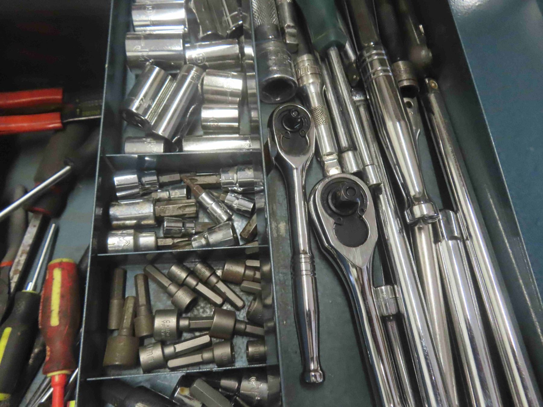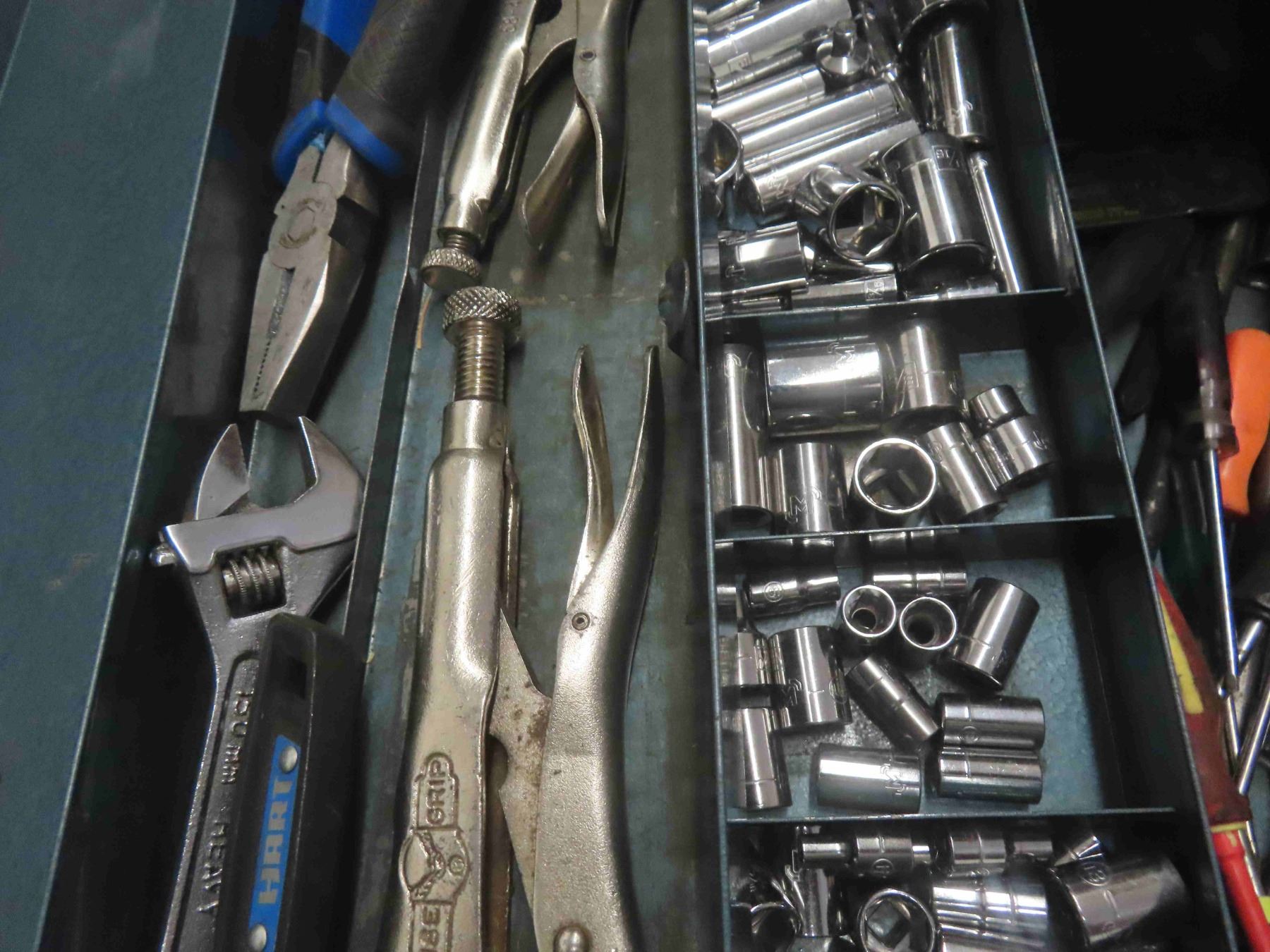 Metal Tool Box Full of 1/4'', 3/8'' + 1/2'' Socket Sets, Air Tools, Ball Pin Hammer, Screwdrivers, Vice Grips, Crescent Wrenches & More