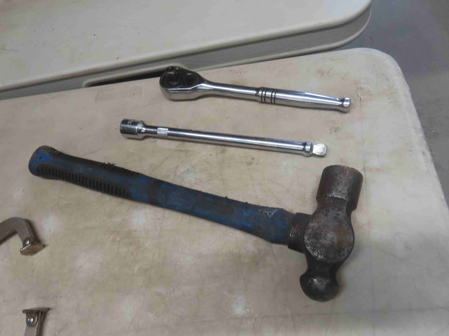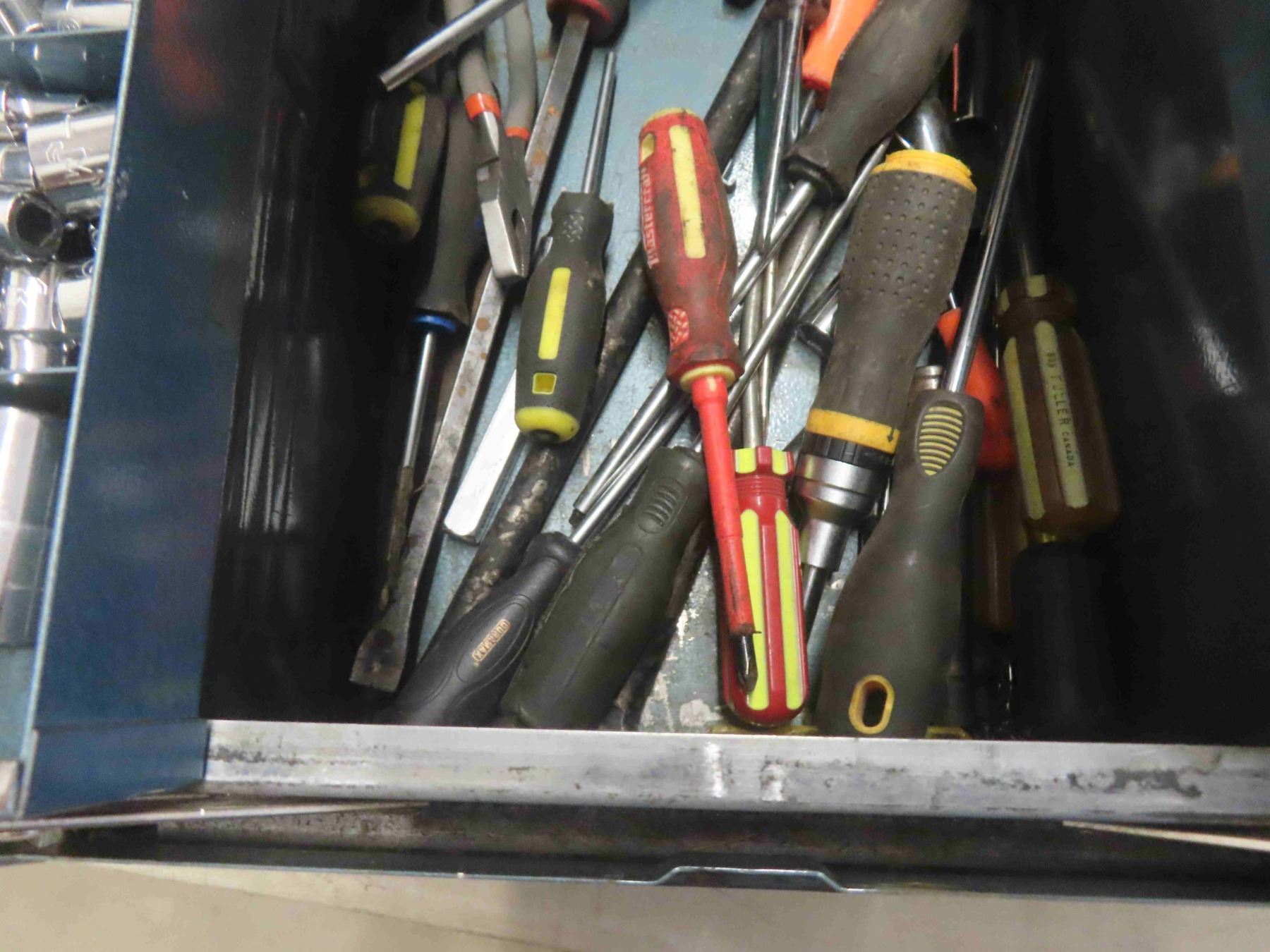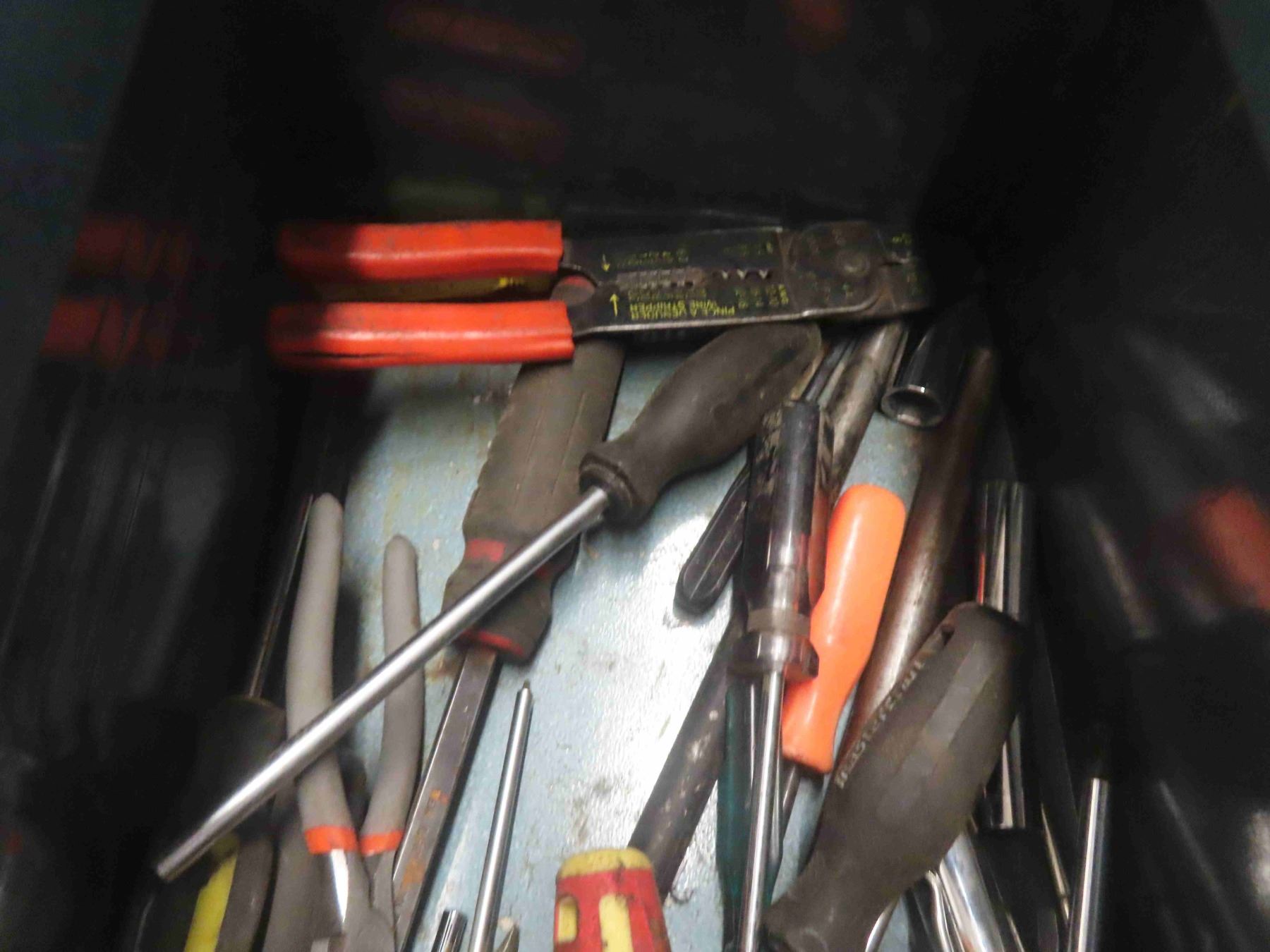 Metal Tool Box Full of 1/4'', 3/8'' + 1/2'' Socket Sets, Air Tools, Ball Pin Hammer, Screwdrivers, Vice Grips, Crescent Wrenches & More