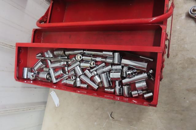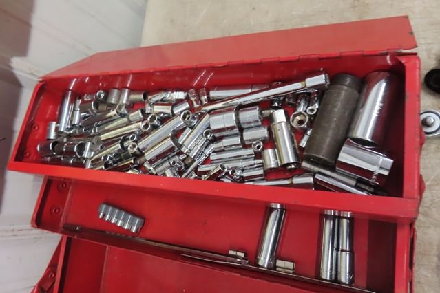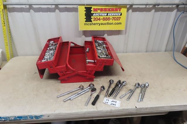 Metal Tool Box with Sockets + 12 Ratchets, Extensions ; 1/4", 3/8", 1/2"