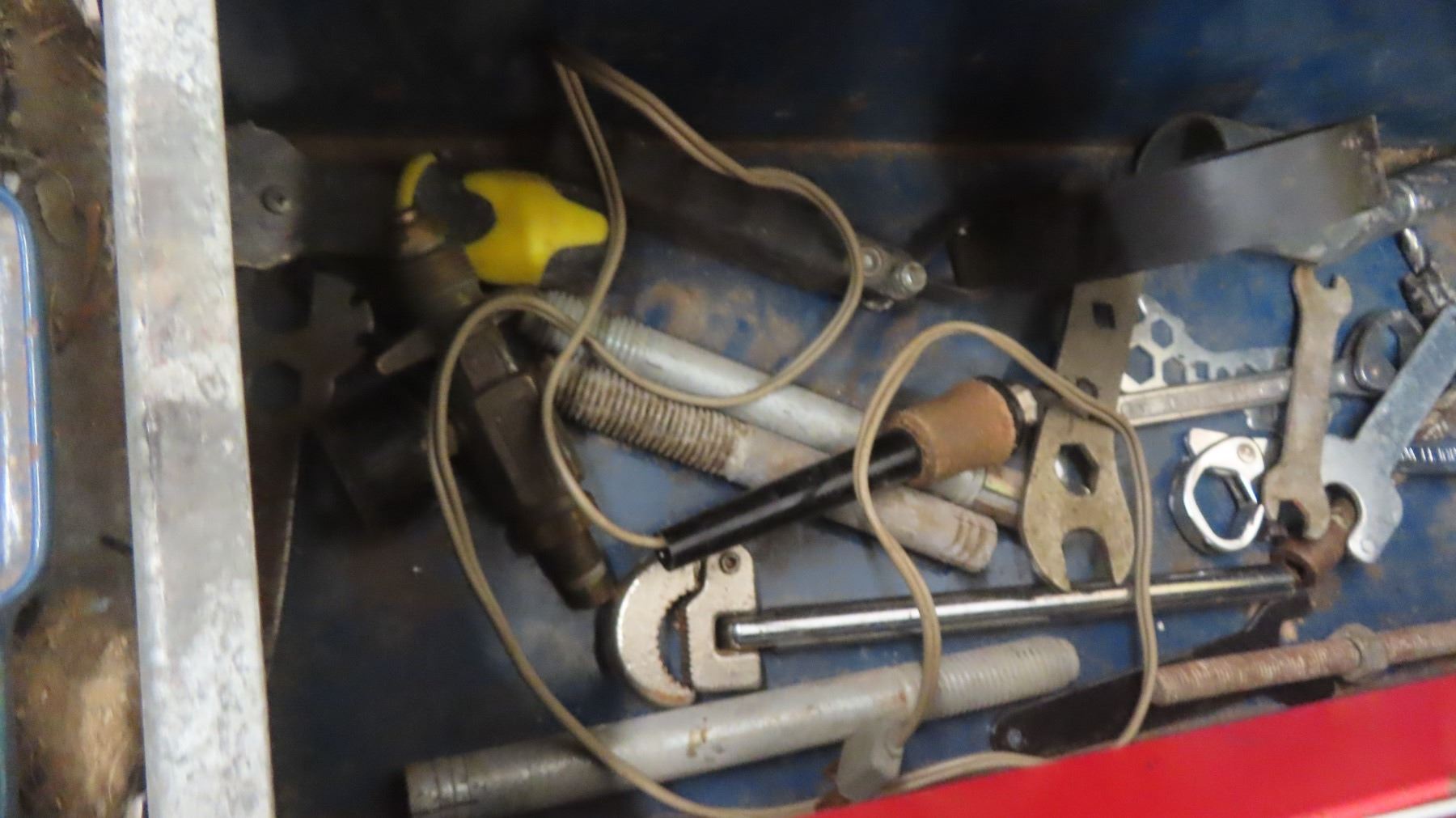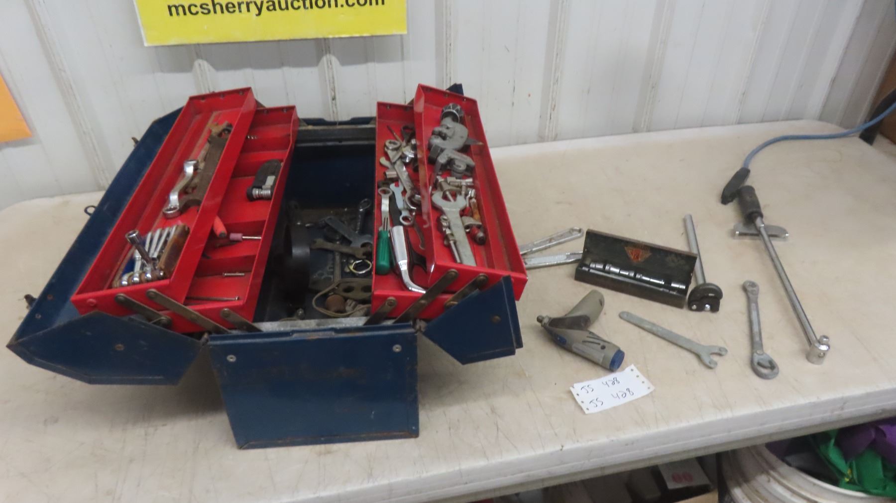 Metal Tool Box with Tools: Wrenches, Pipe Cutters, Various Wrenches,