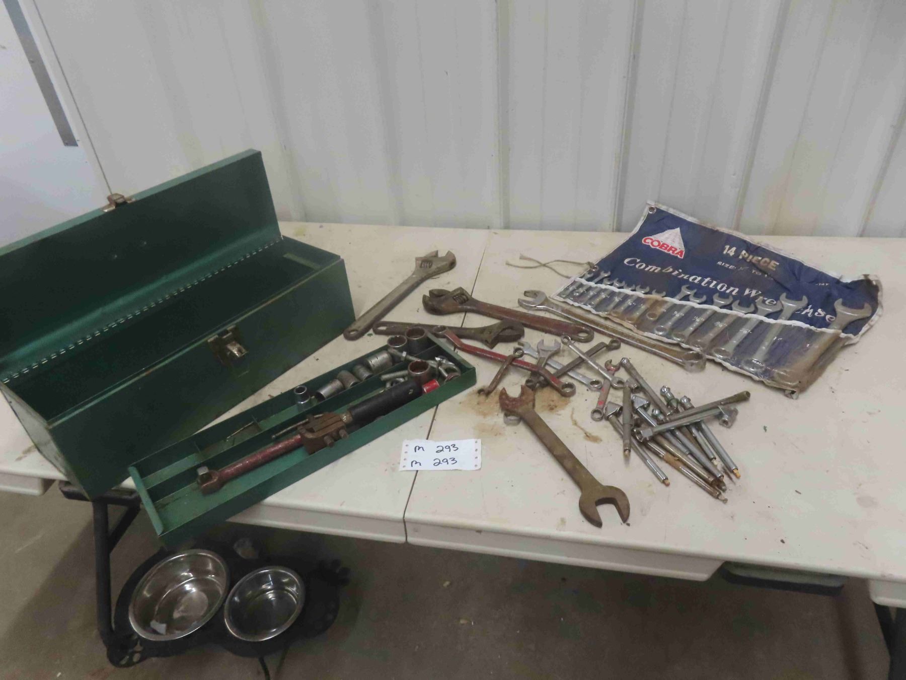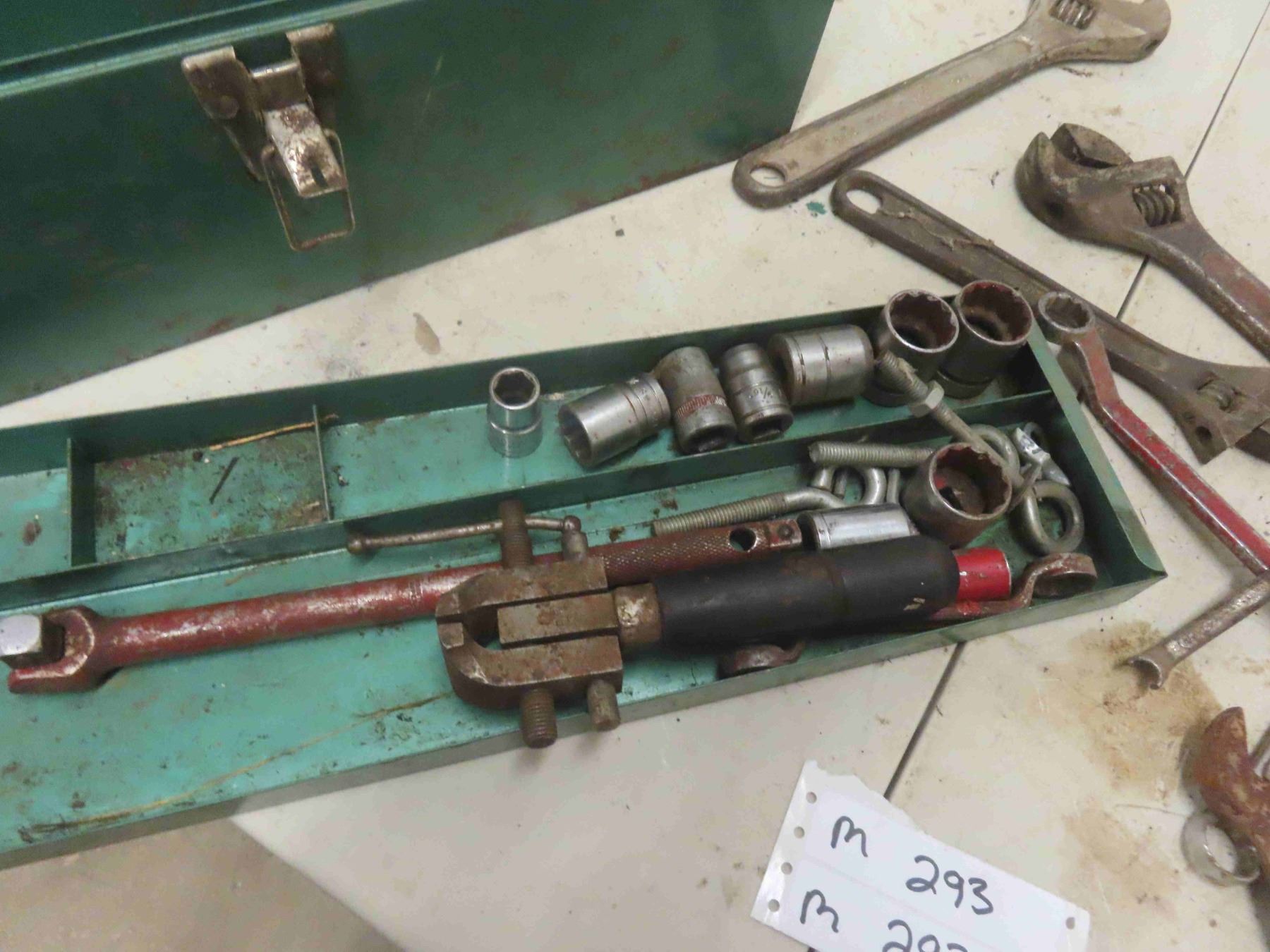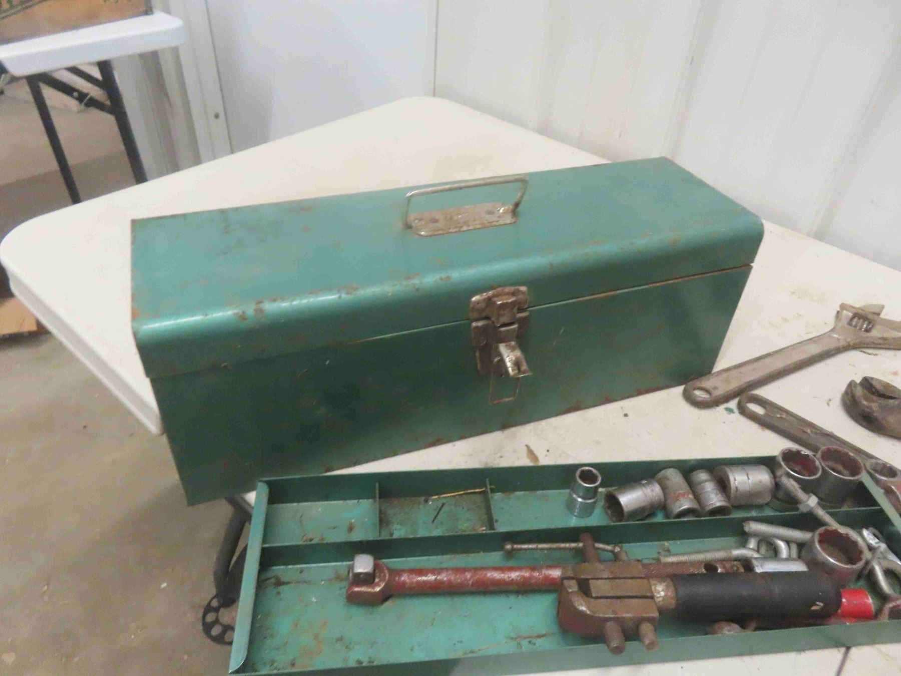 Metal Tool Box with Wrenches, Some Sockets & Air Gauges