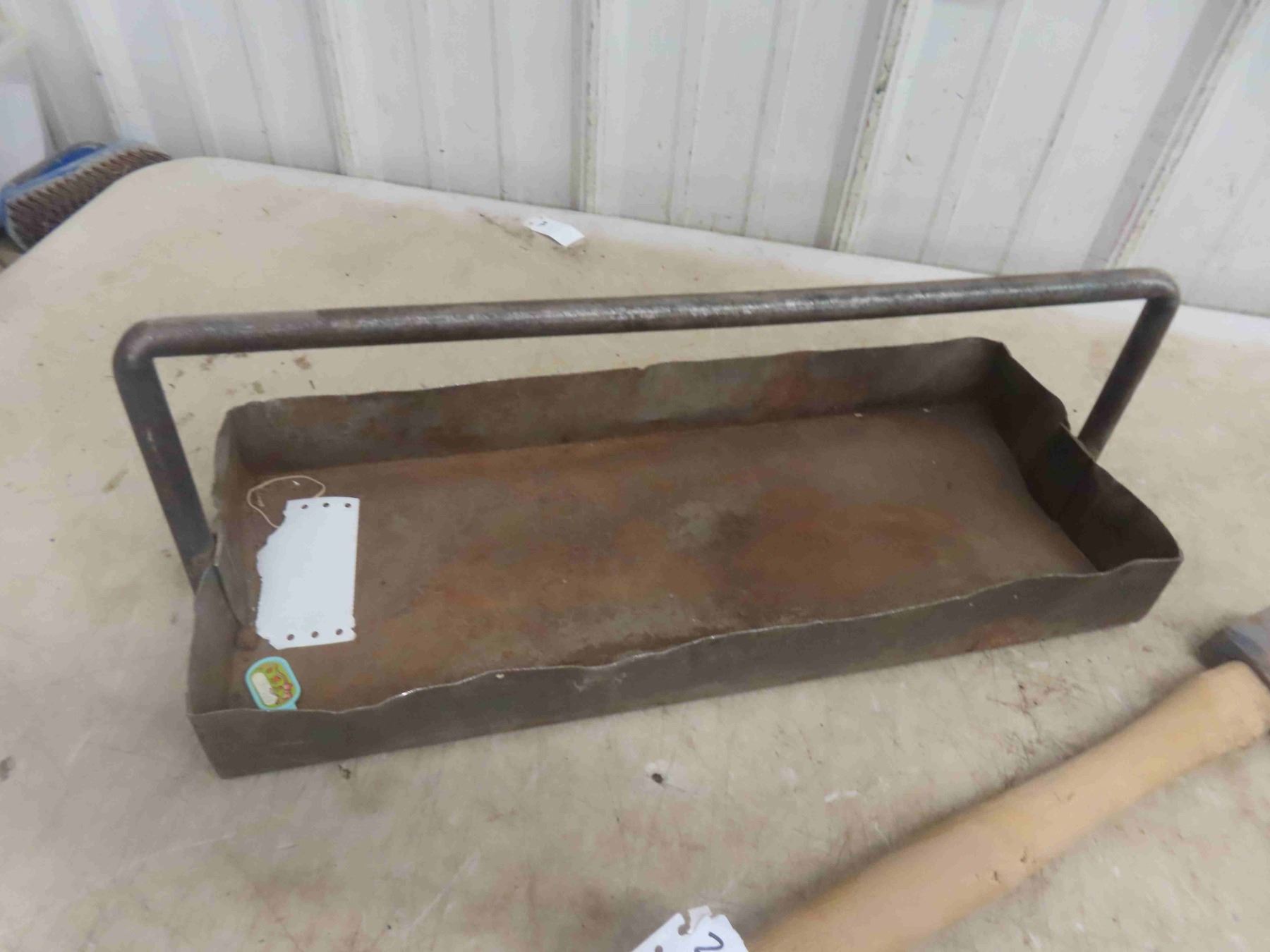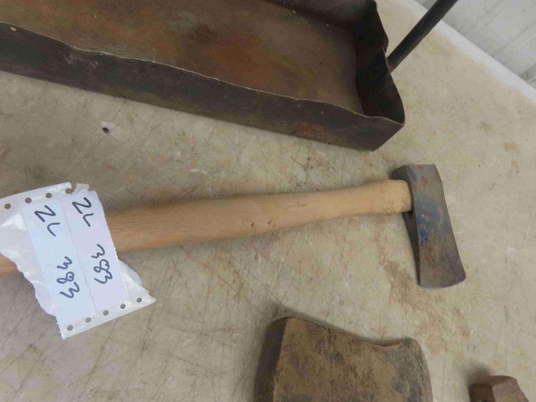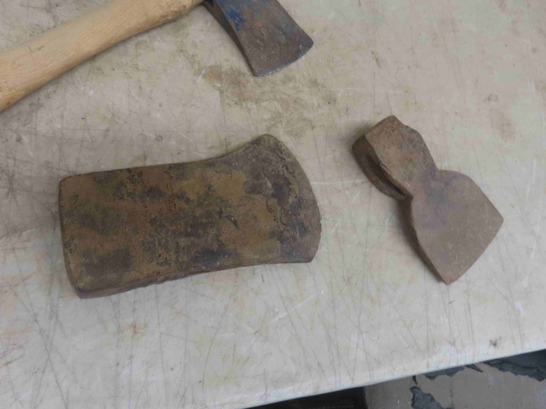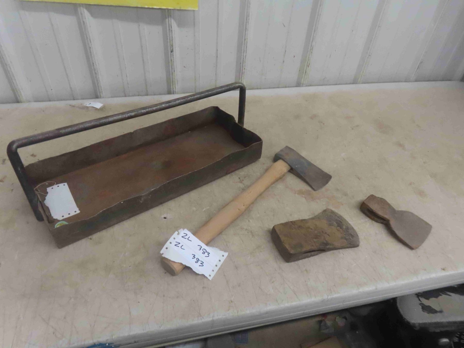 Metal Tool Tray, Hatchet & 2 Axe Heads