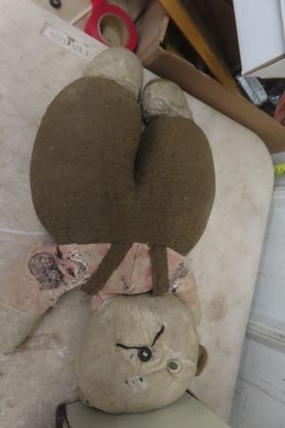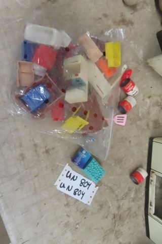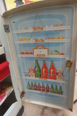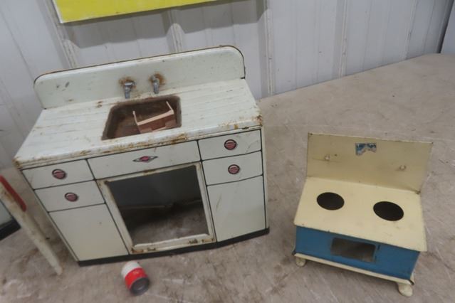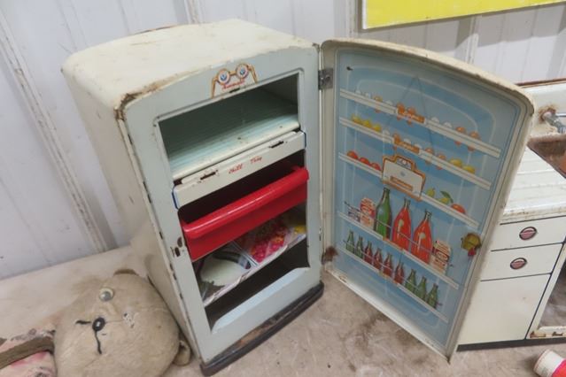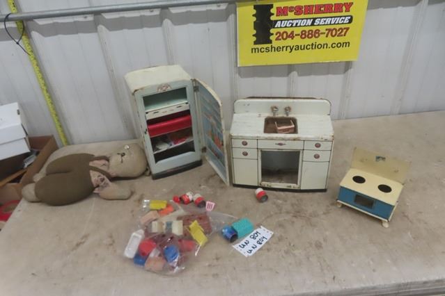 Metal Toy Fridge, Sink, Stove, Plastic Doll Furniture + Old Doll Plush