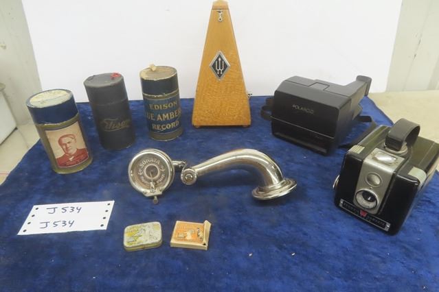 Metronome, 3 Edison Cylinders, Sonata Tone Drum, Polaroid + Brownie Cameras