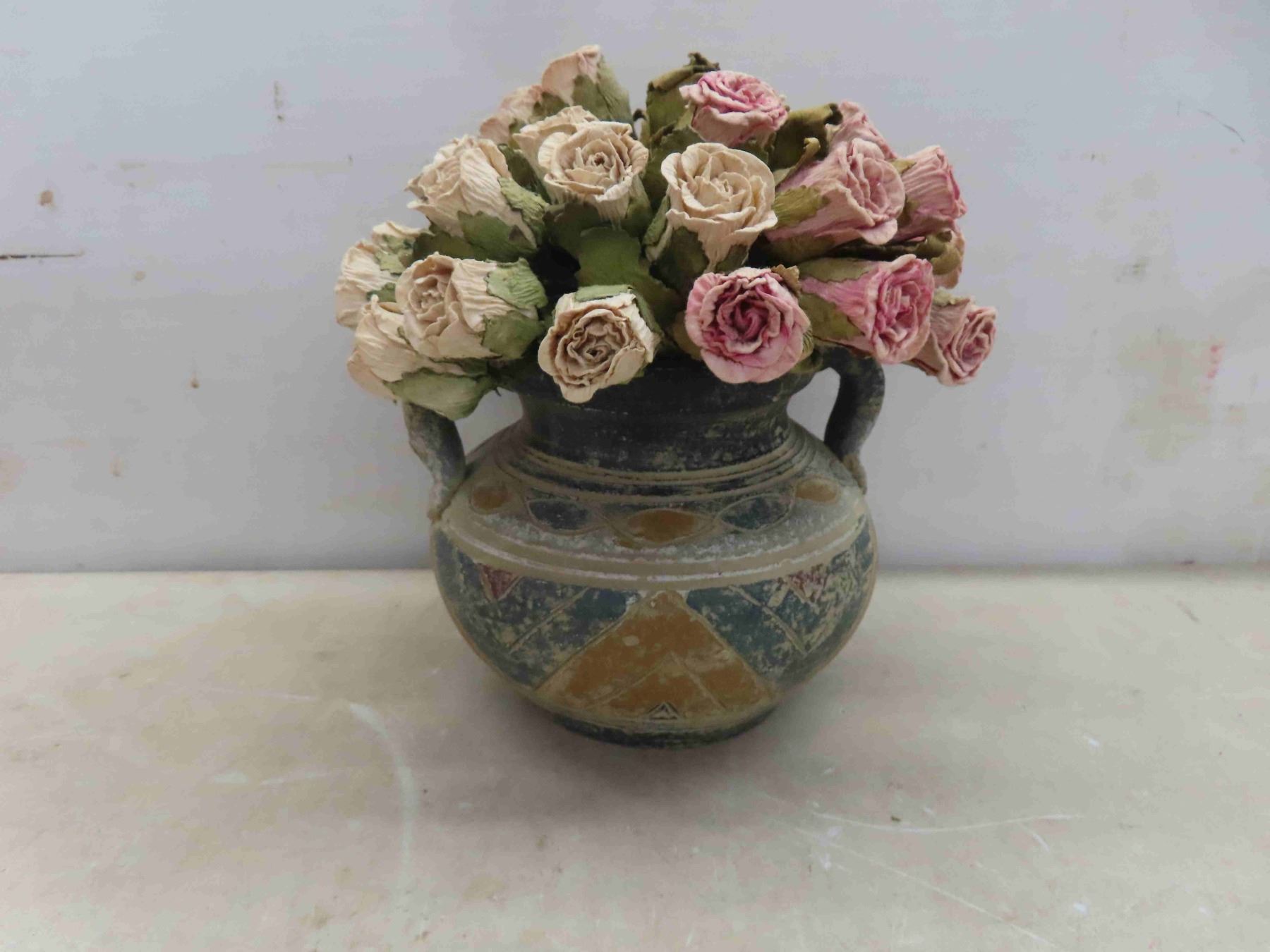Mexican Style Vase with Silk Roses, 3pce Candle on Wood Base, Vintage Buttons on Cards & More