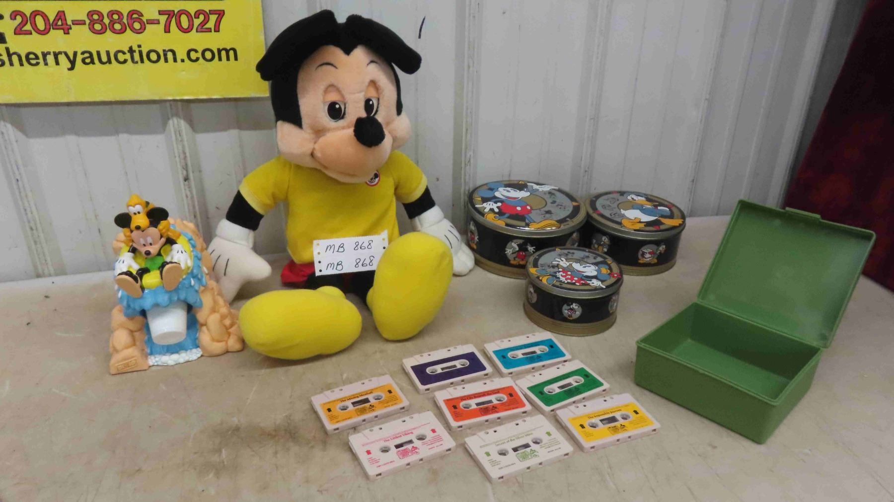 Mickey Mouse Items : Dixie Cup Holder , 3 Tins , 1980s Talking Mickey Mouse Doll with Tapes