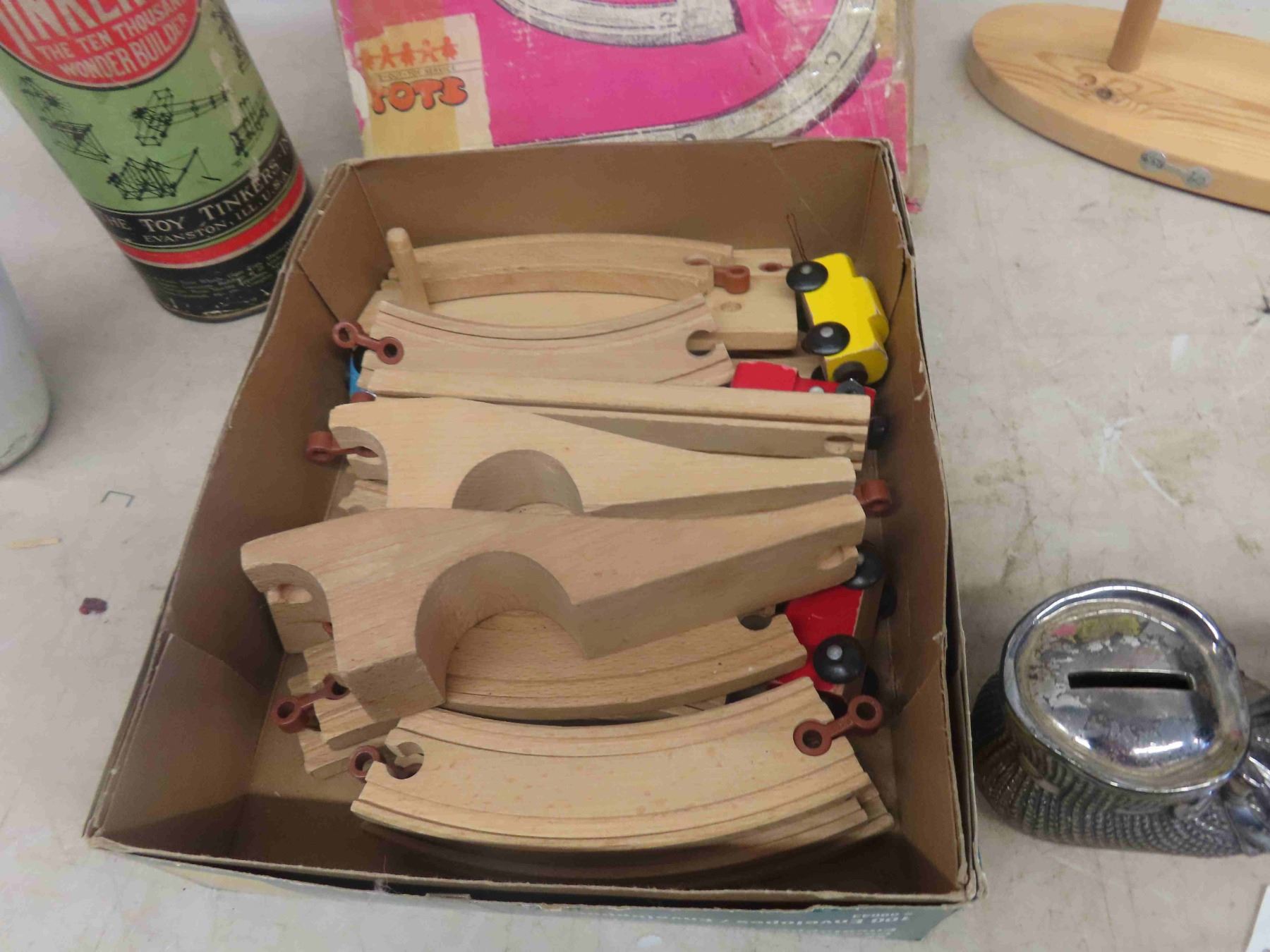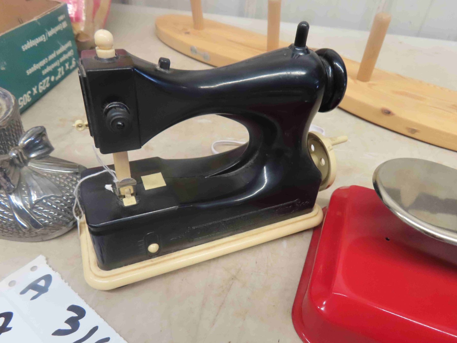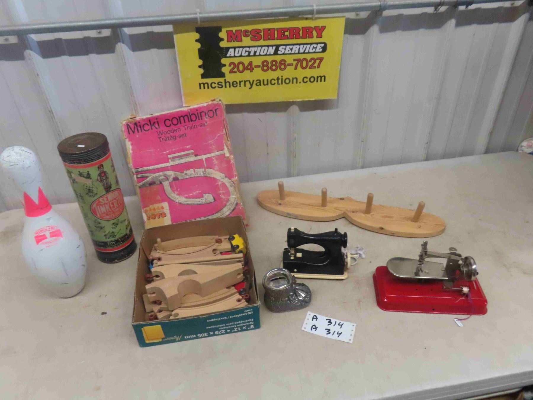 Micki Combinor Wood Train Set, Tinker Toy Builder, Bowling Pins, 2 Mini Childrens Sewing Machine, plus more