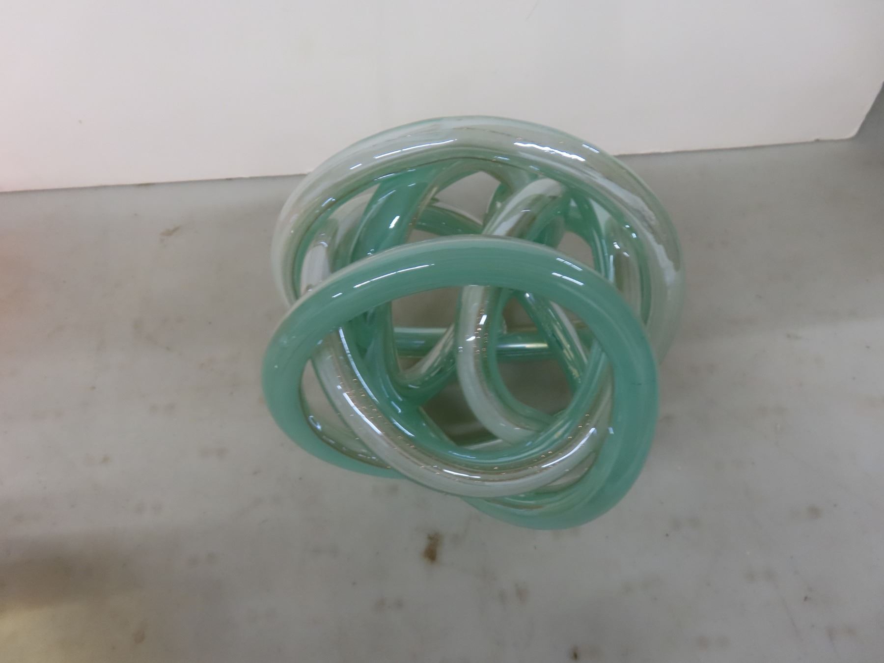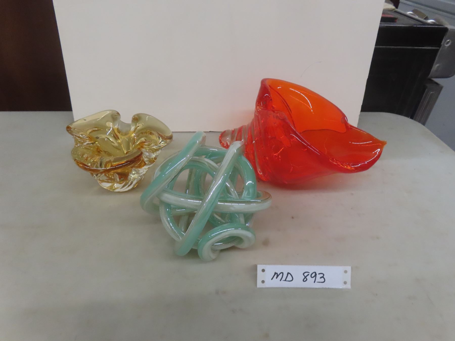 Mid Century Modern Art Glass - Orange Sea-Shell Dish 8" x 11", Amber Ash Tray, and Hand-Blown Murano-Style 6" Knot Sculpture
