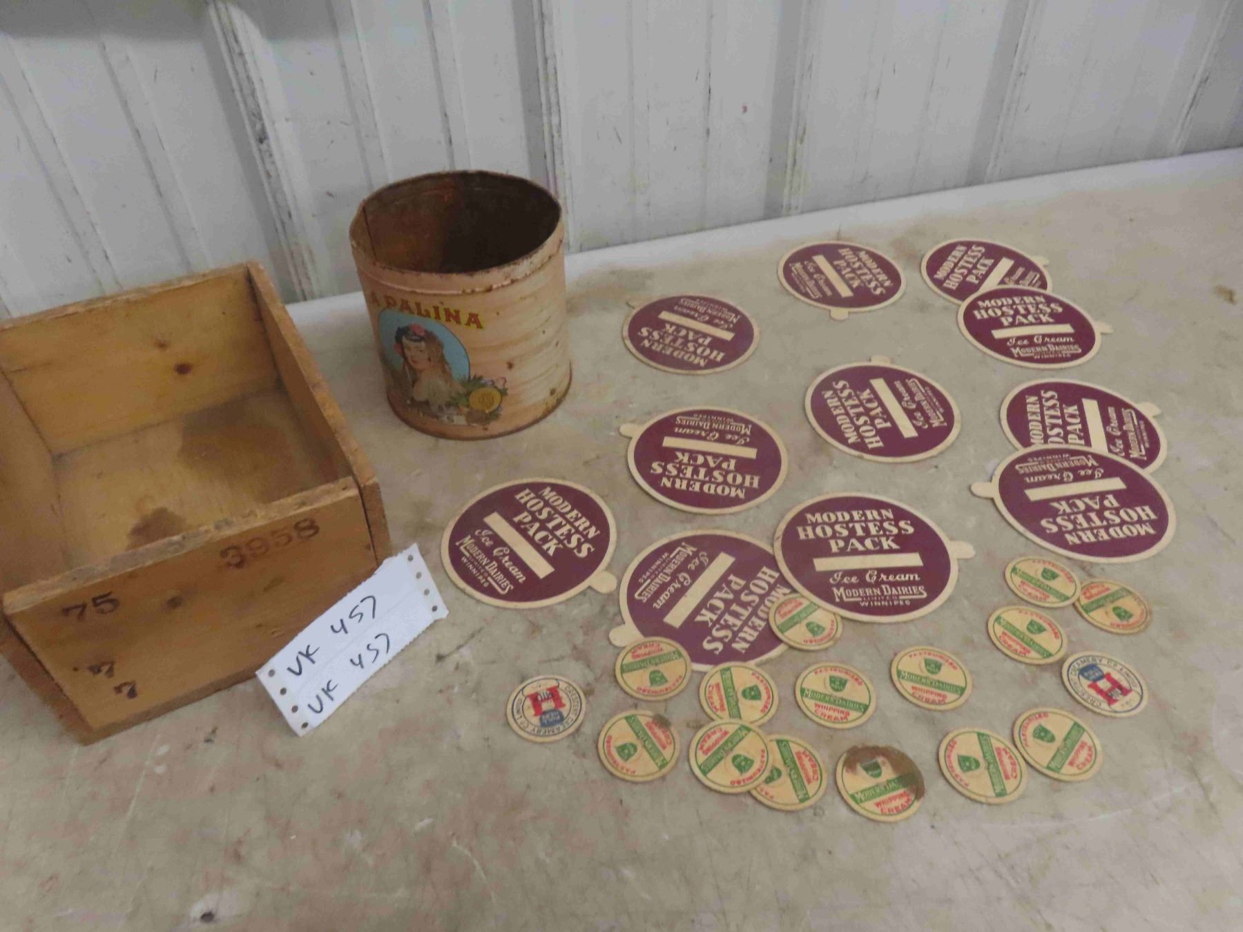 Milk Bottle Topper Lids , Ice Cream Topper Lids , Rusty Tobacco Can , Wood Box