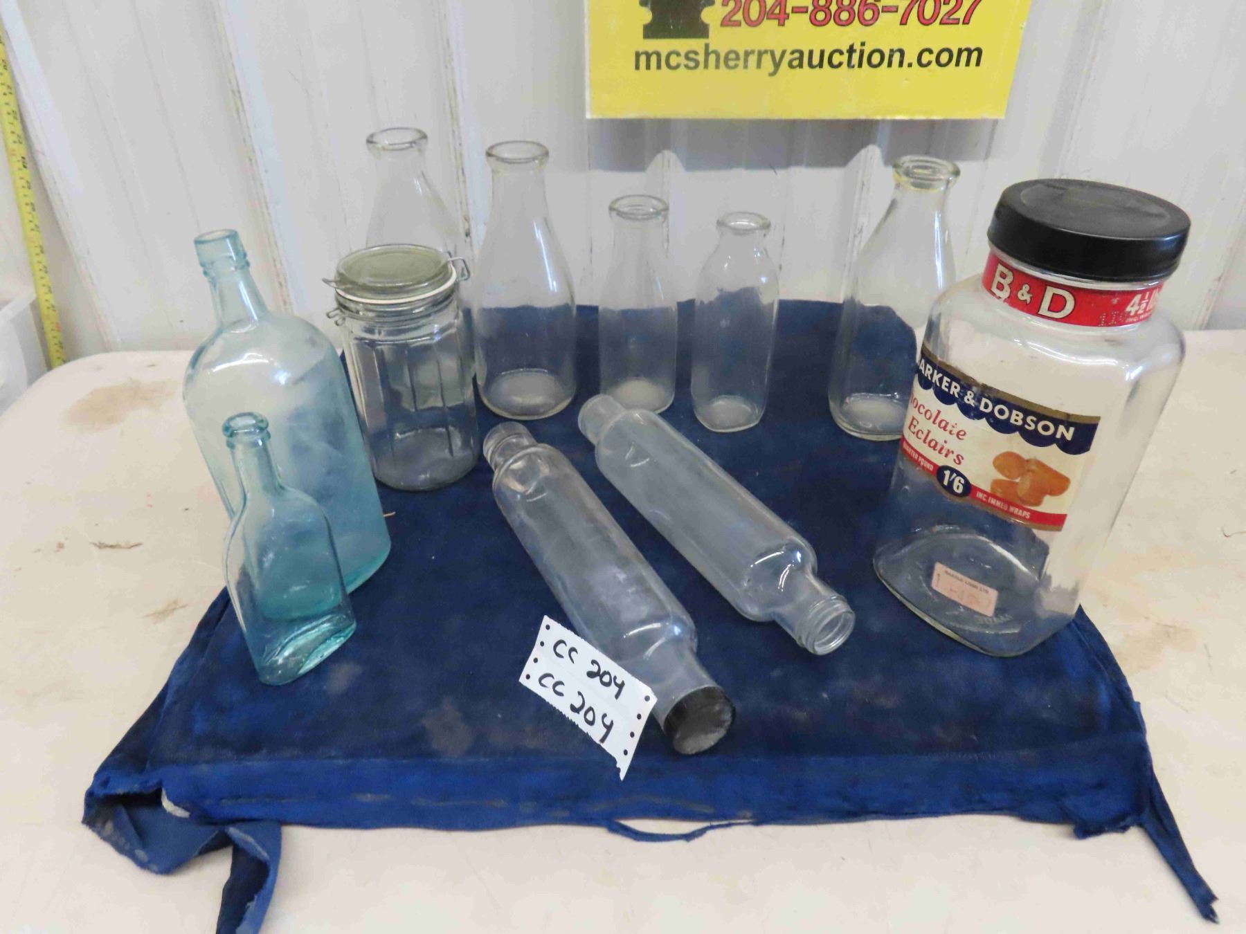 Milk Bottles, Glass Rolling Pins, Canister, B+D Jar