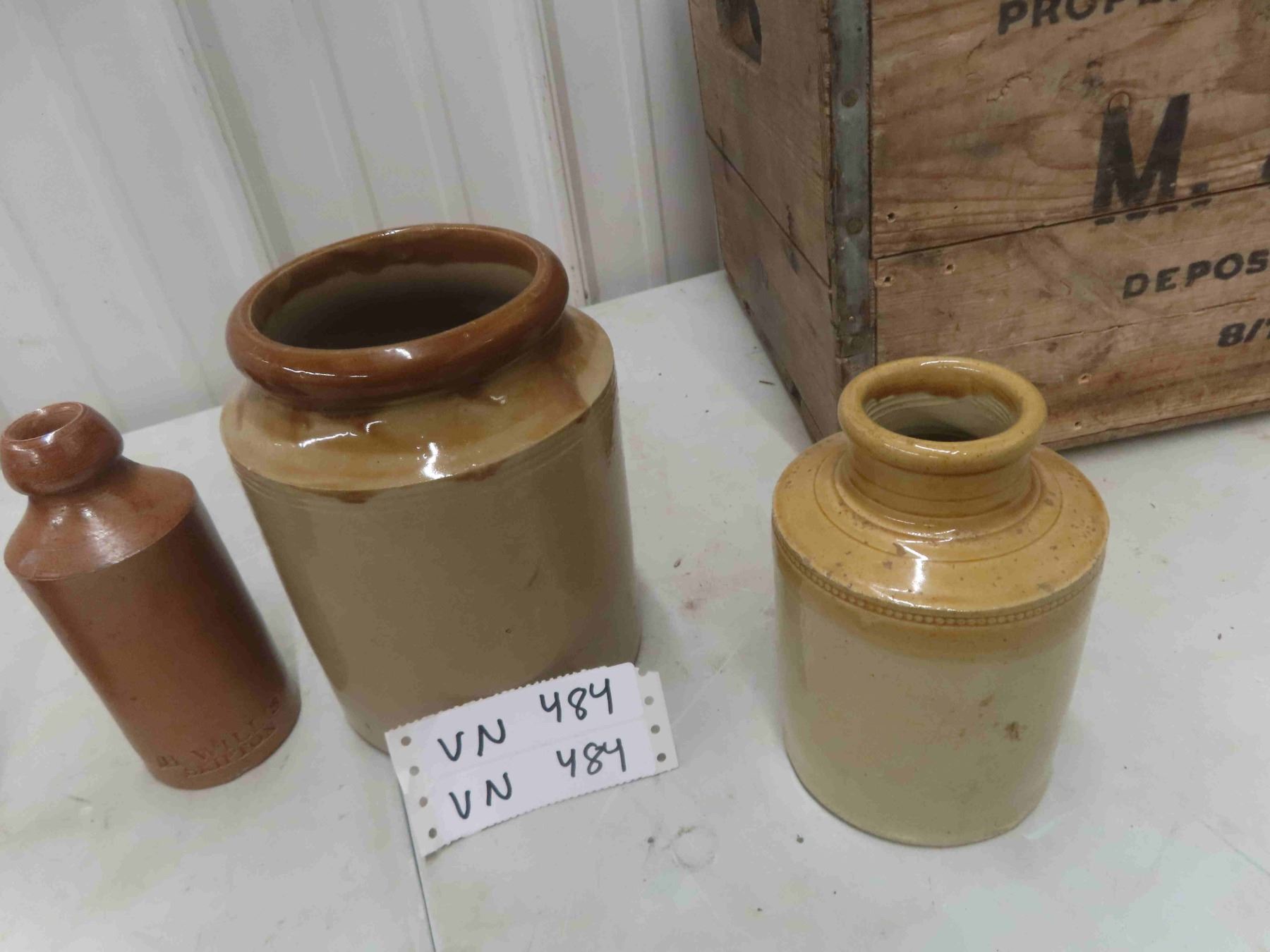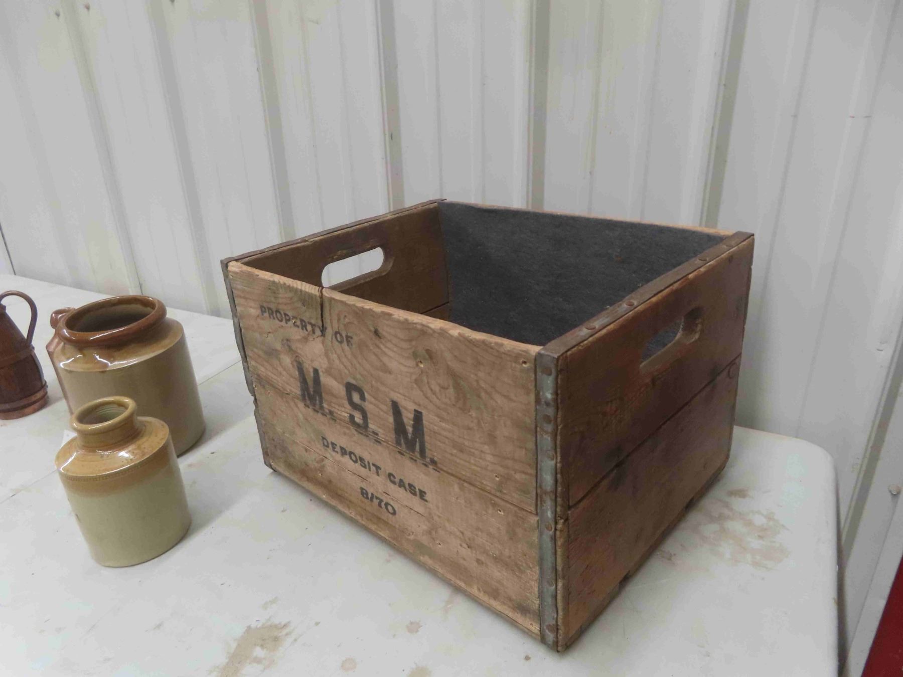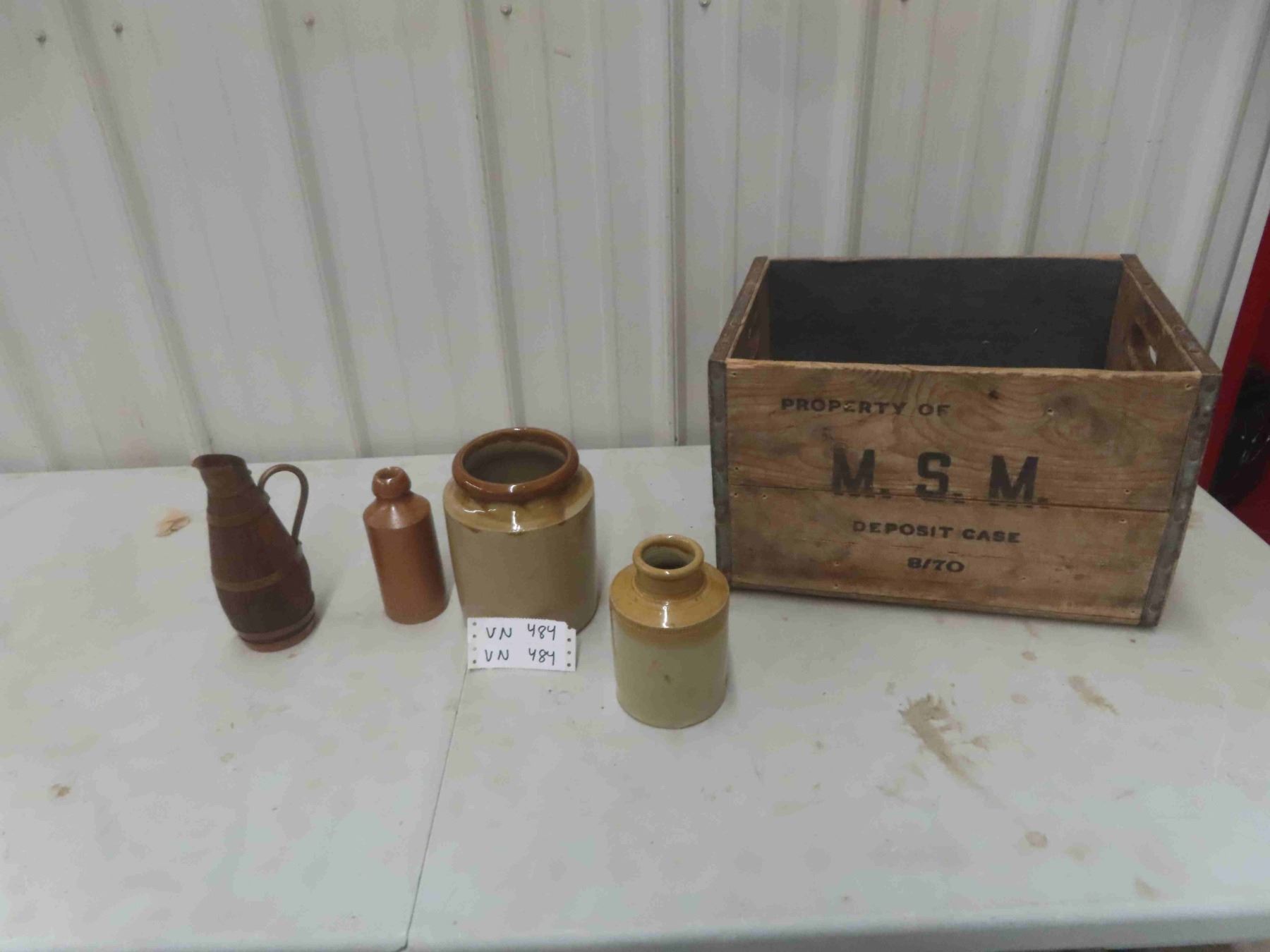 Milk Crate , Bottle, 2 Stoneware, Wood + Copper Pitcher