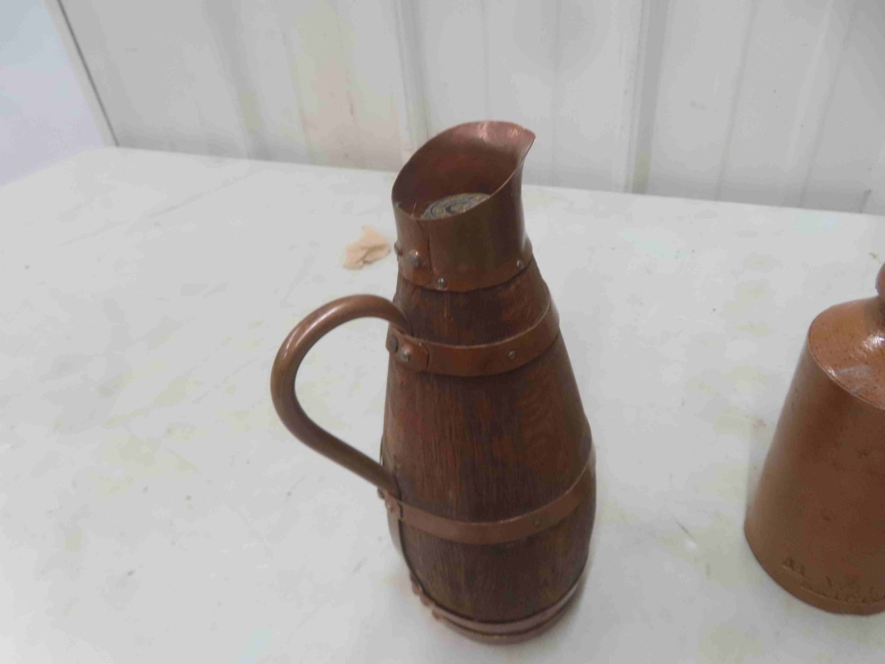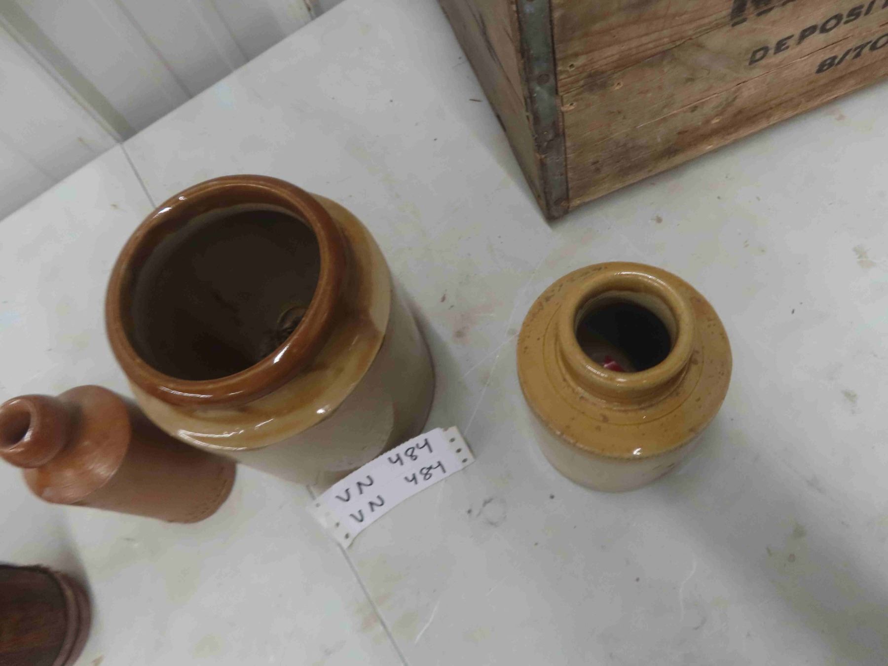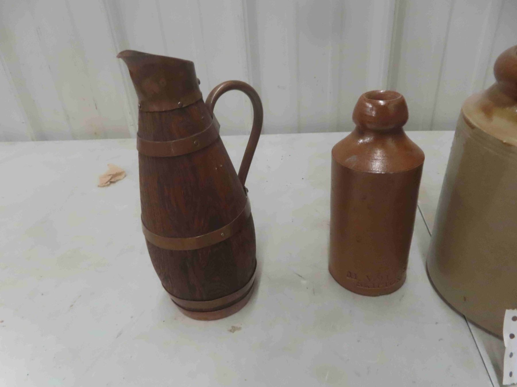 Milk Crate , Bottle, 2 Stoneware, Wood + Copper Pitcher