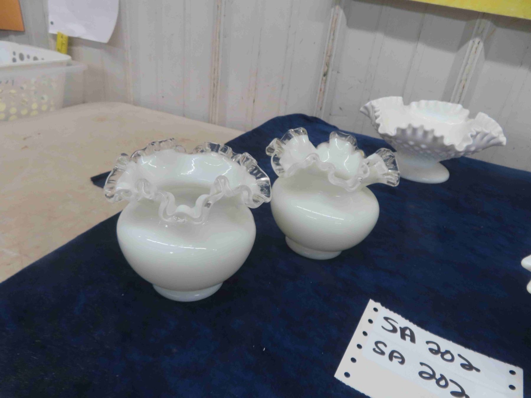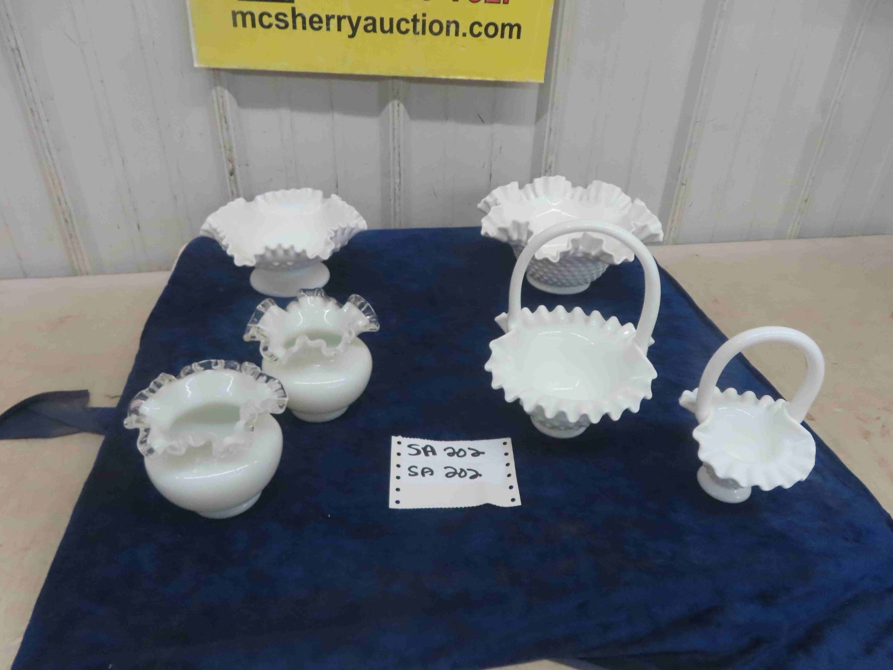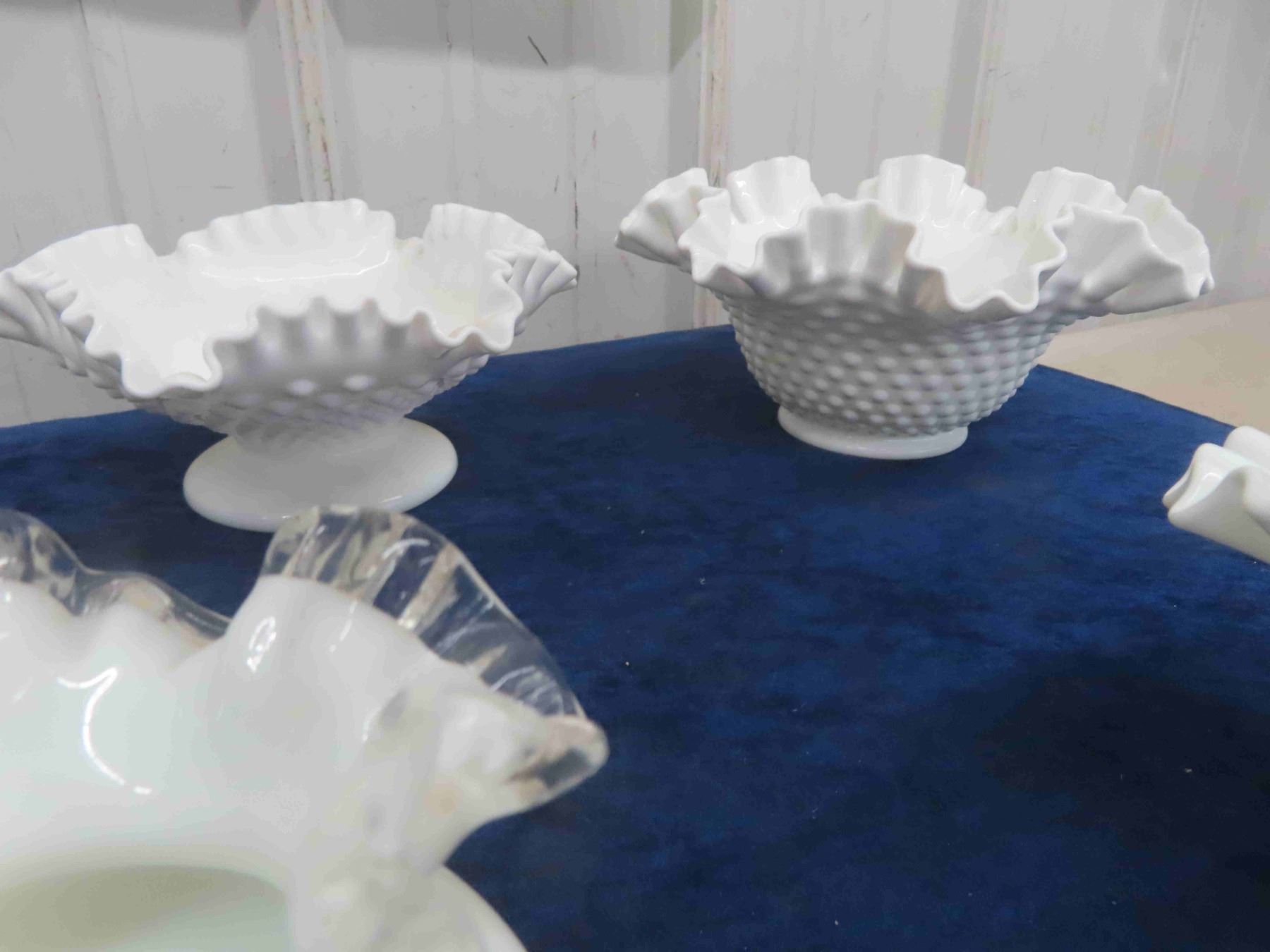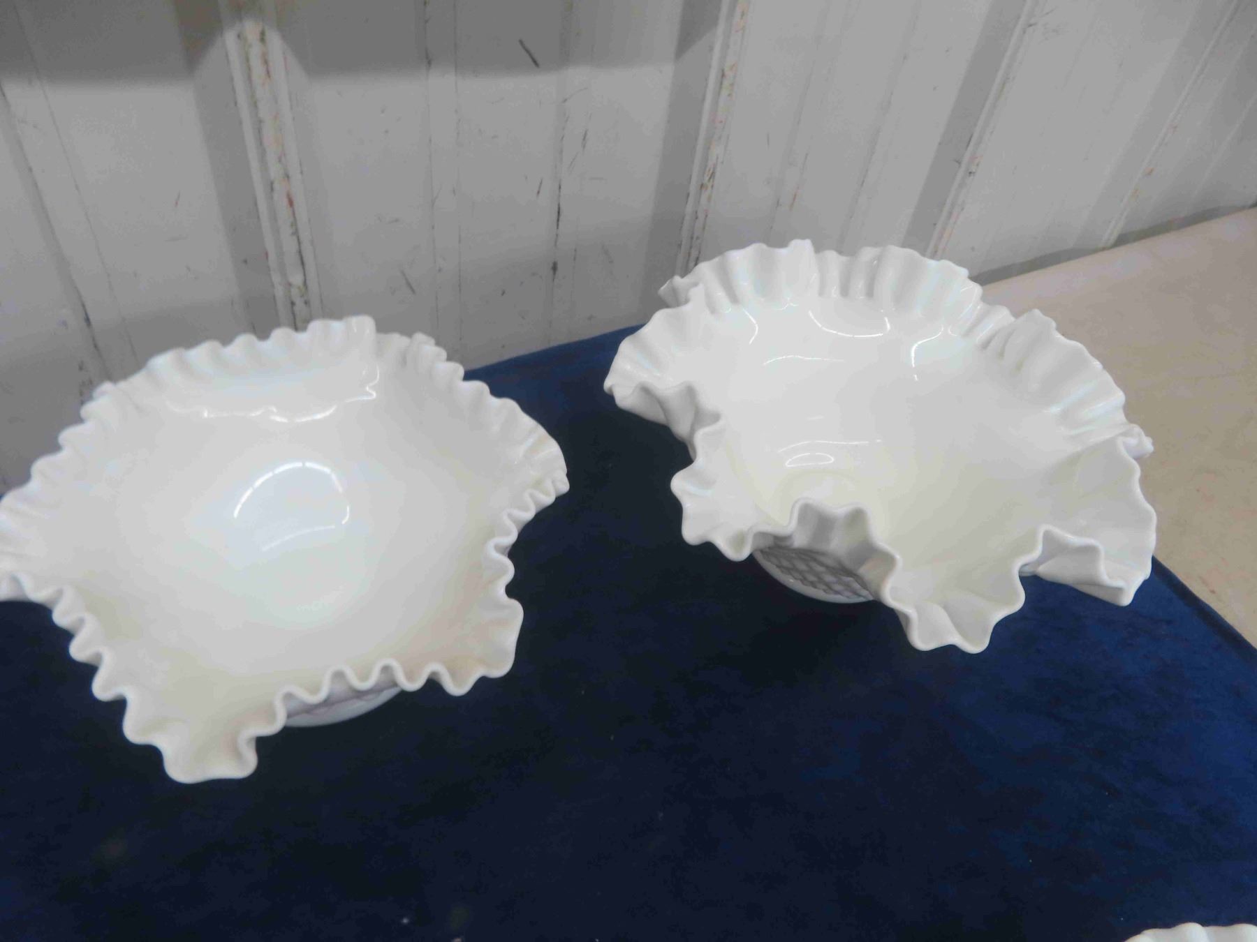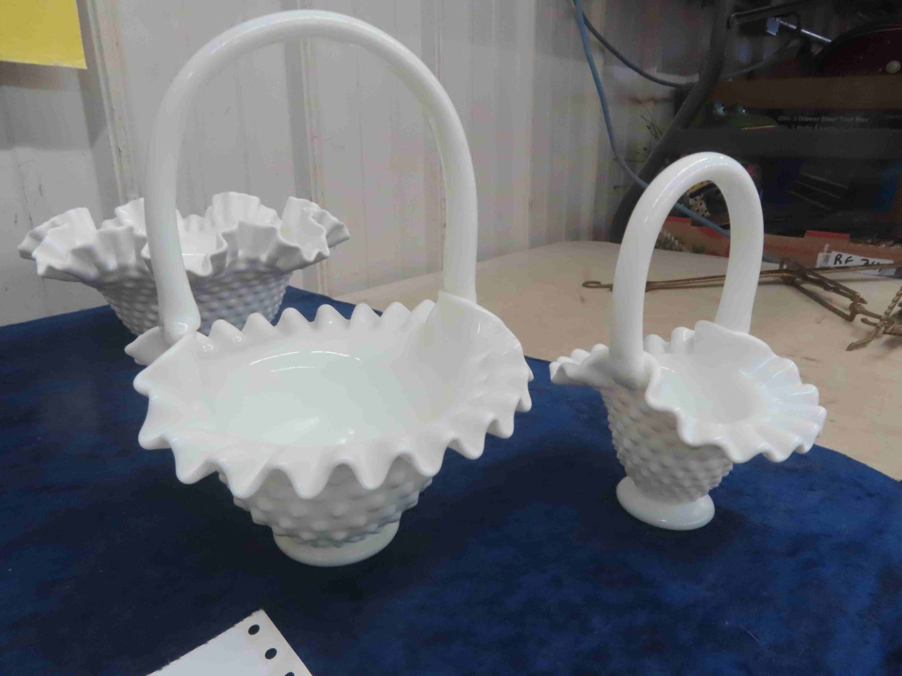 Milk Glass Ruffled Edge Dish, 2 Fenton, 2 Bridal Baskets