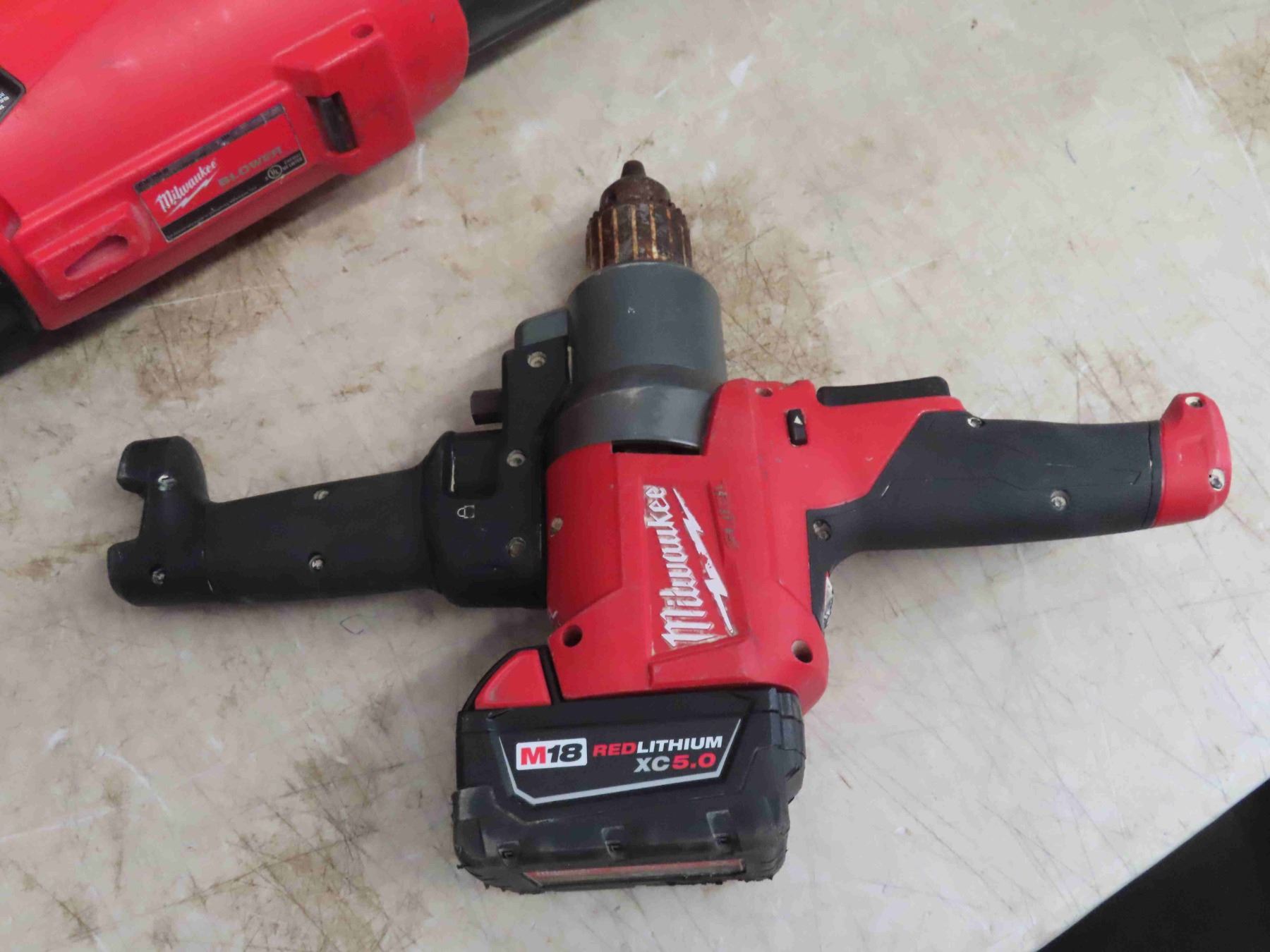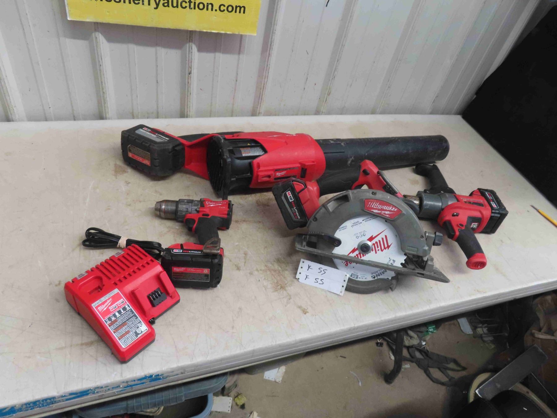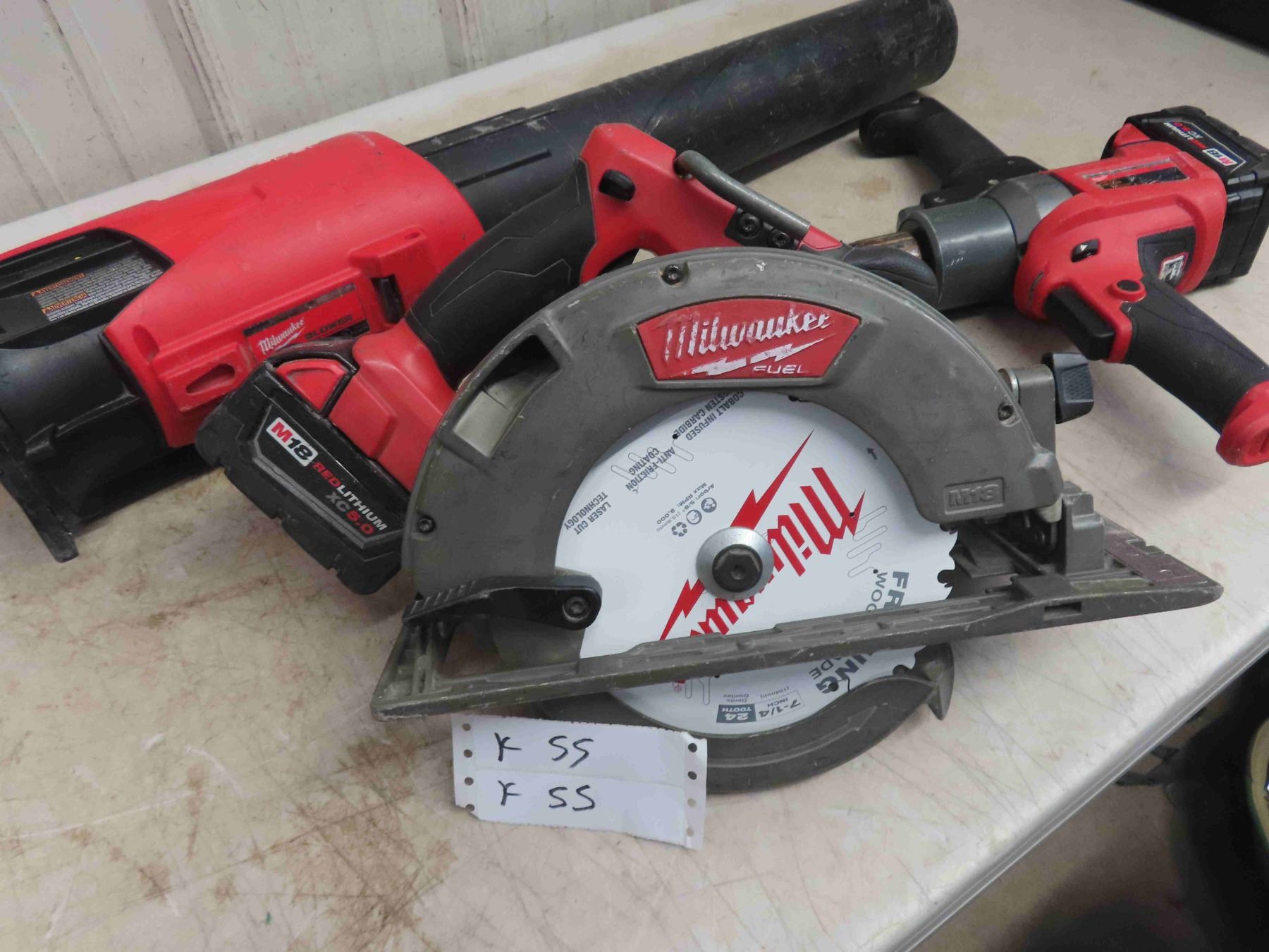 Milwaukee (4) 18V Tools : Circular Saw, 1/2'' Hammer Drill, 1/2'' Mud Mixer, Blower, 4 Batteries, 1 Charger, All Working.