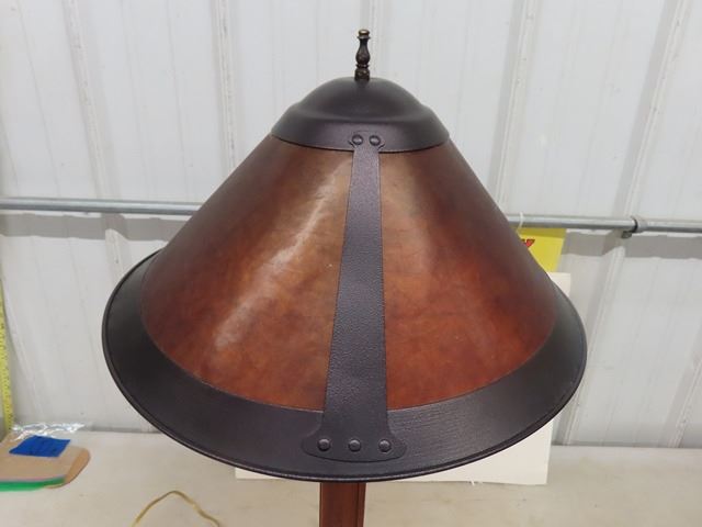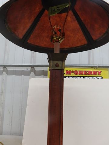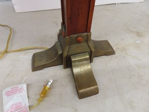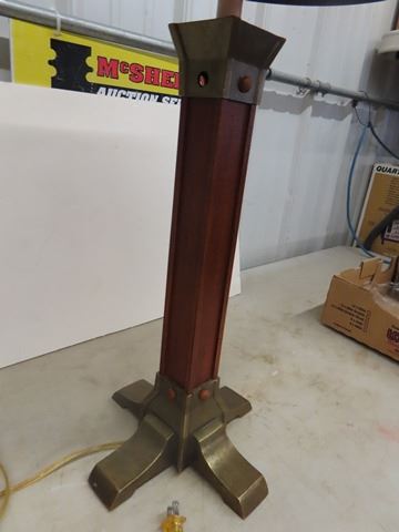 Mission style lamp with Micah like shade. The base of the lamp is wood and brass while the shade is the amber style glass that is so typical of the Arts and Crafts Movement. It approximately 24”x12”