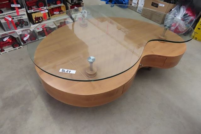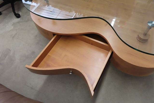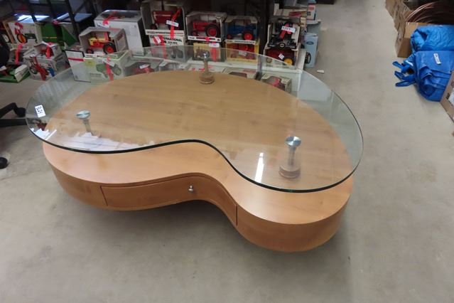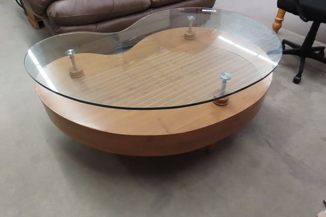 Modern Kidney Bean Shaped Wood with Raised Glass Top Coffee Table 21" x 35" x 51.5"