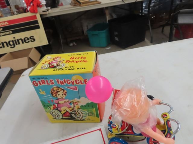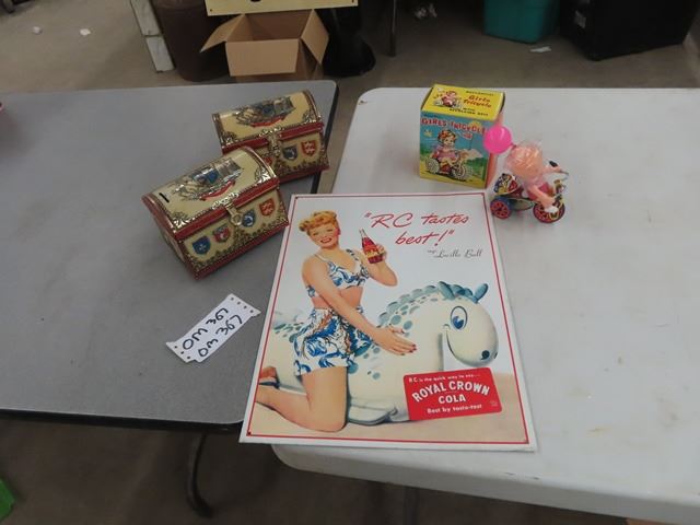 Modern Metal RC Sign with Lucille Ball, Metal Wind up Tricycle with Box & 2 TIns