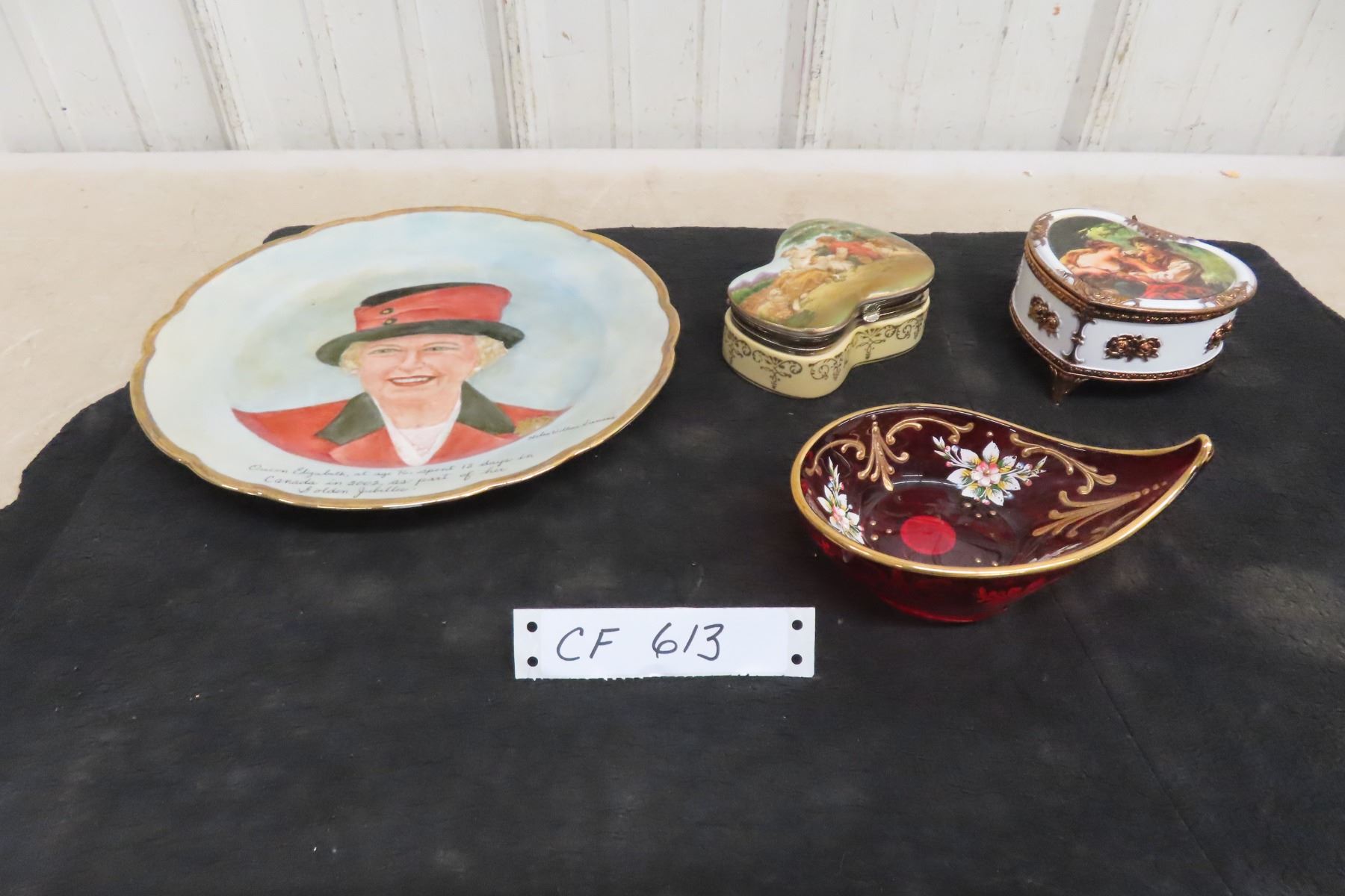 Murano Glass Dish, Musical Heart Shaped Box, Queen Elizabeth Plate +