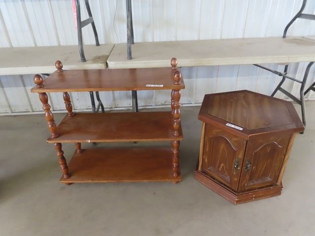 (NY) Wooden Shelf 29" x 32" x 14" & End Table 20" x 22" Rd, Bird Bath, & Planters