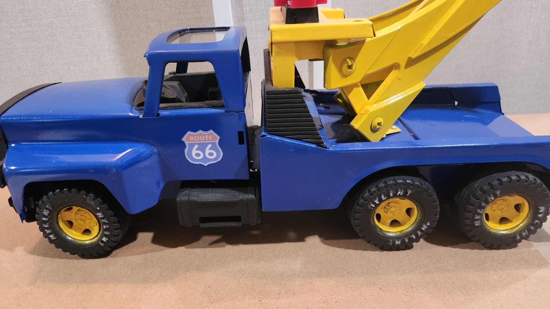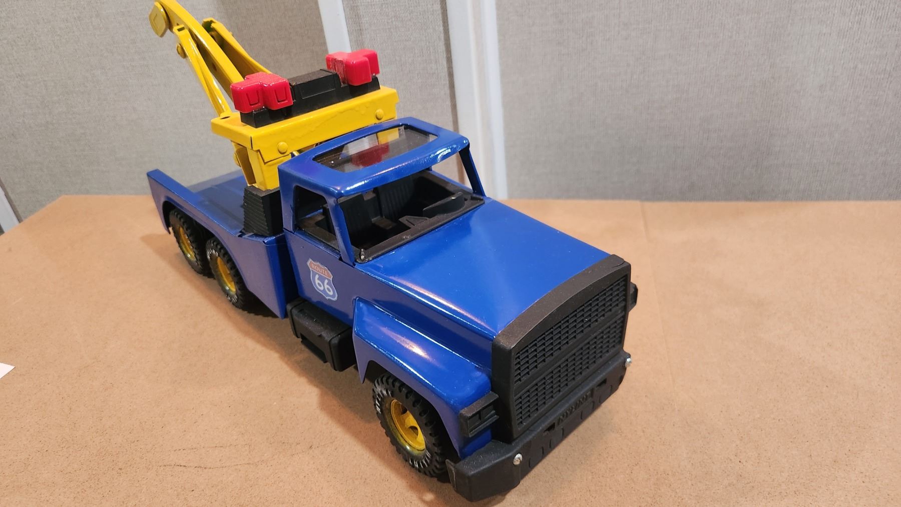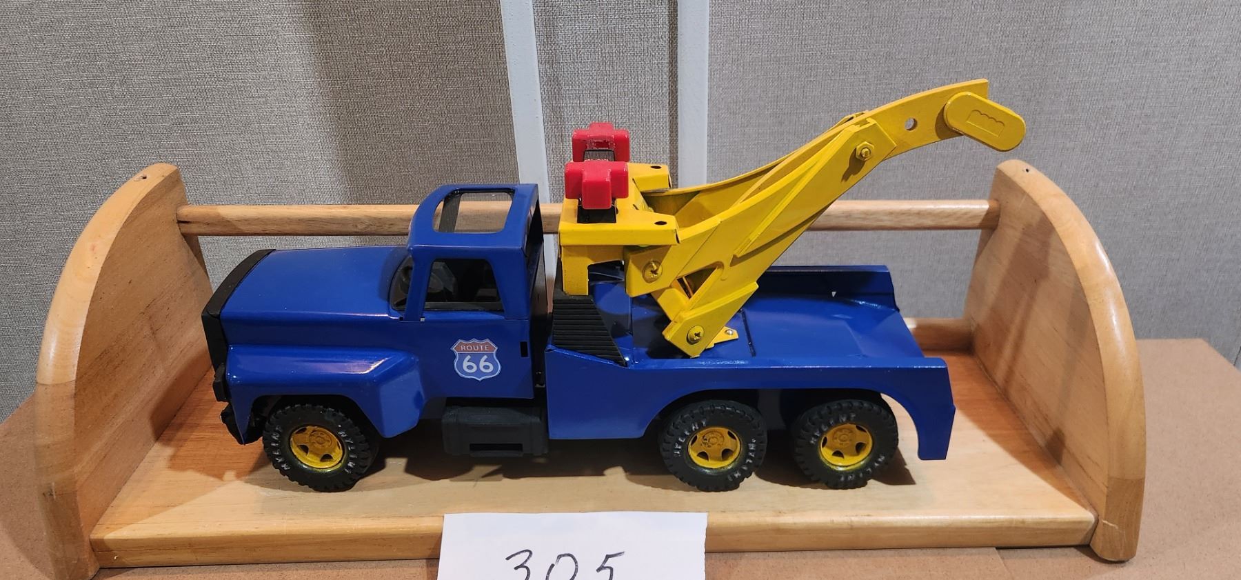 NYLINT 16" ROUTE 66 TOW TRUCK/WRECKER WITH WOOD DISPLAY SHELF.