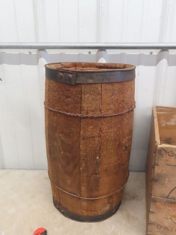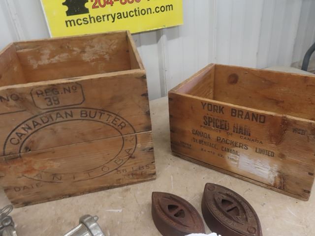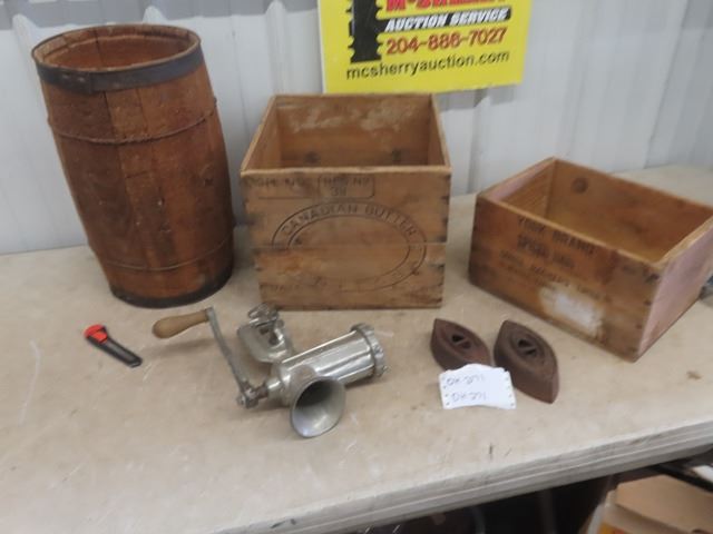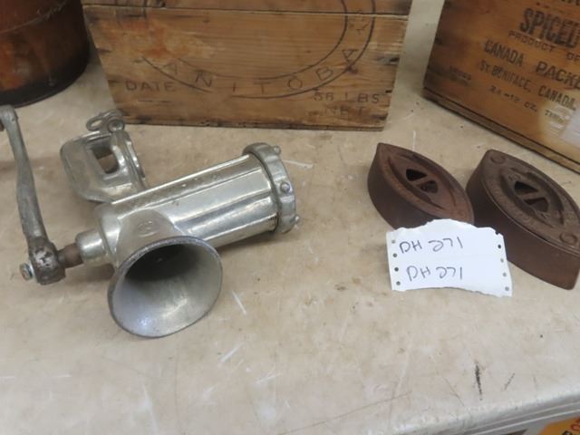 Nail Keg, 2 Wooden Crates, Meat Grinders, Sad Irons