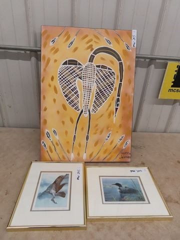 Native Painting on Canvas, Lewis Jakamura, & 2 Prints by Luke Raffin
