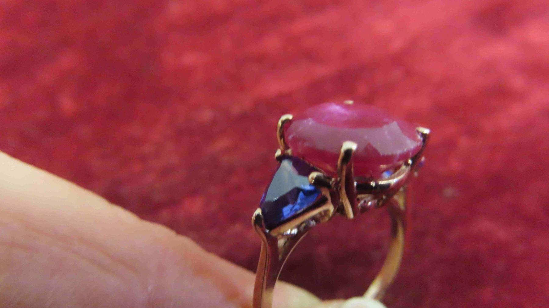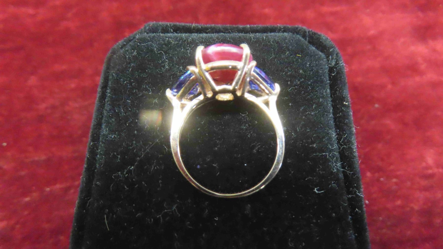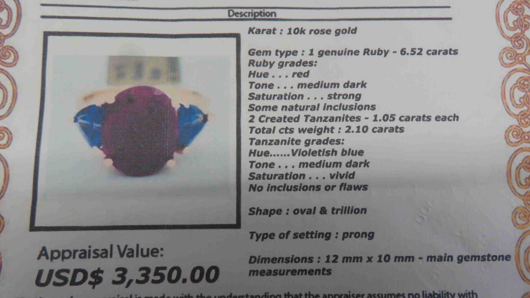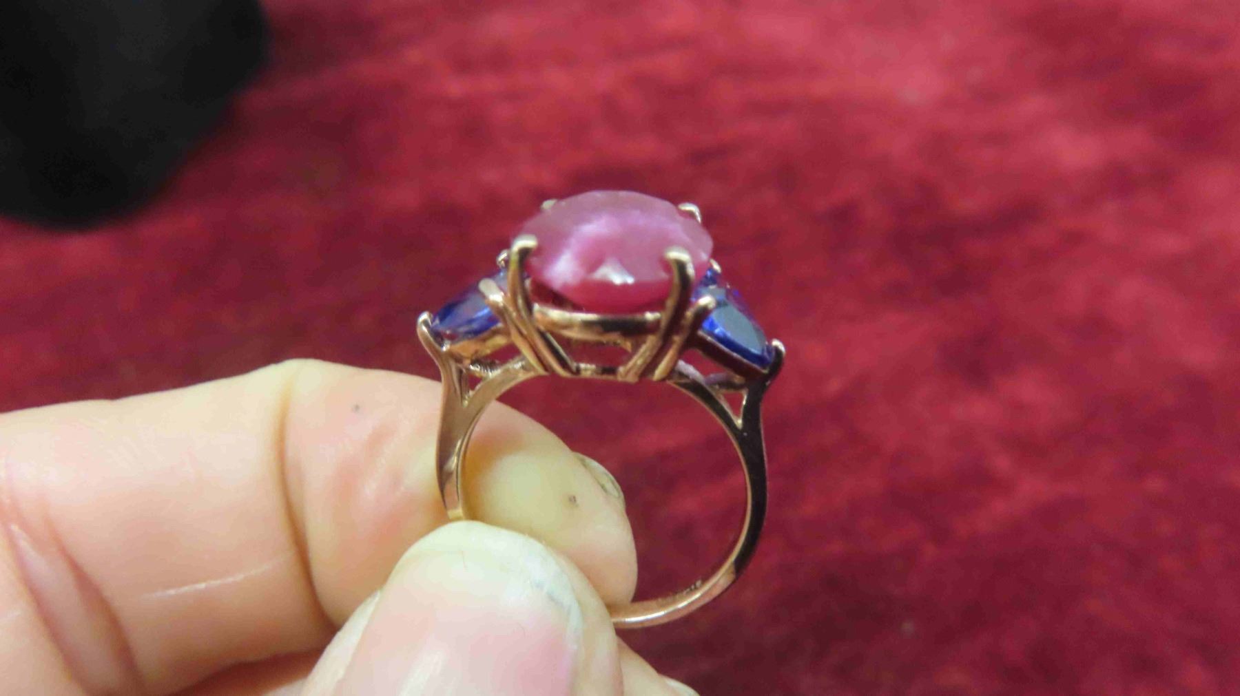 New 10kt Rose Gold Ring with Genuine Ruby + 2 Created Tanzanites , Total Carrot Weight 8.62 , Size 5 1/2-6 with Appraisal