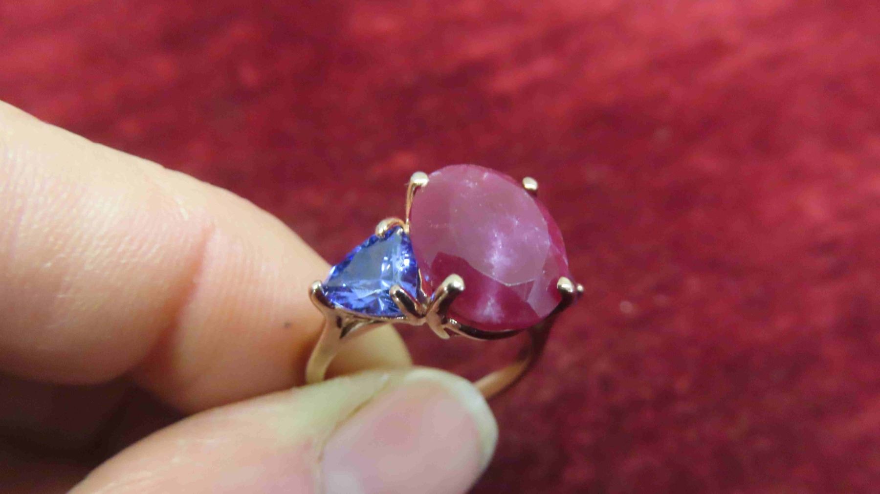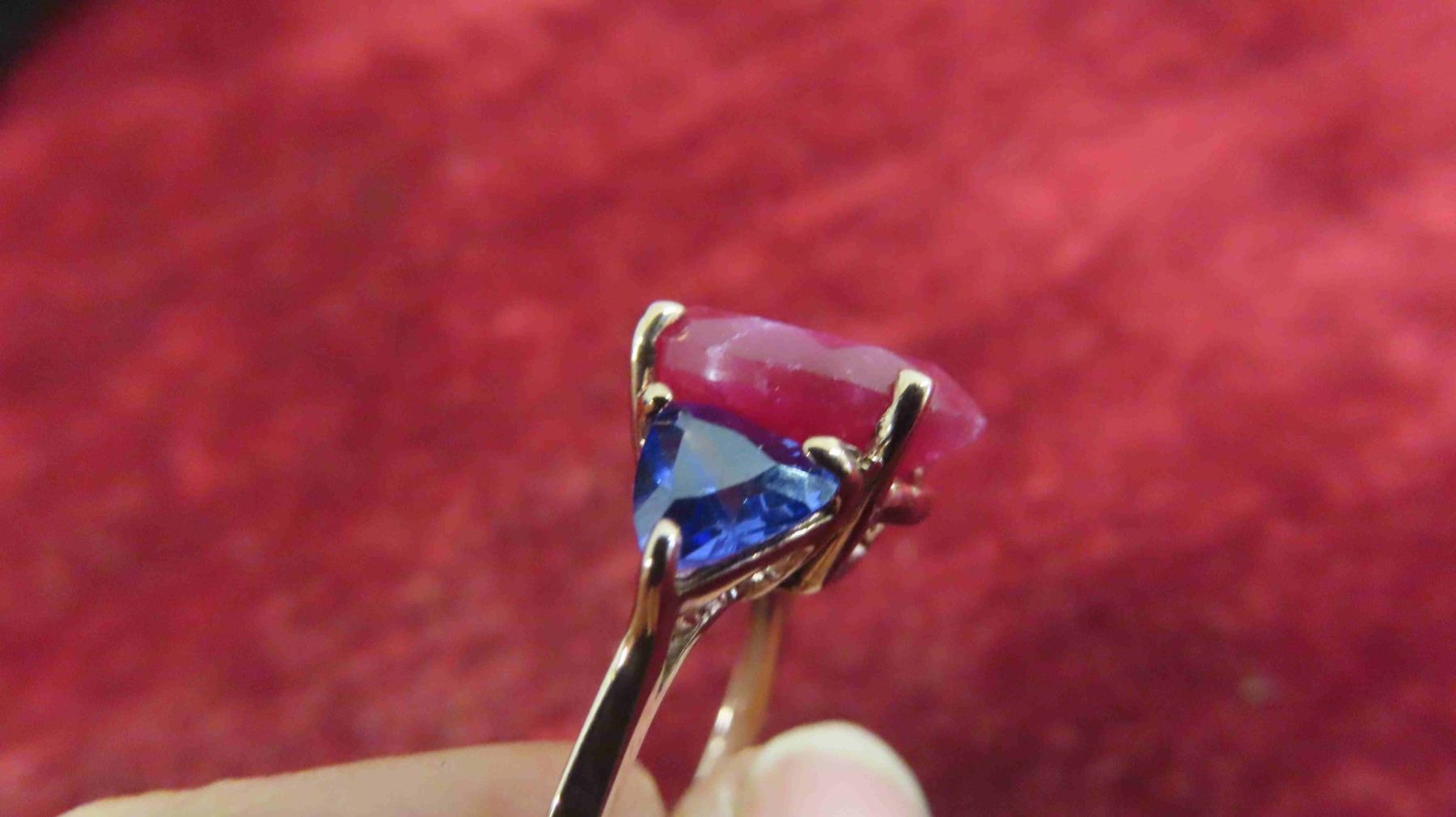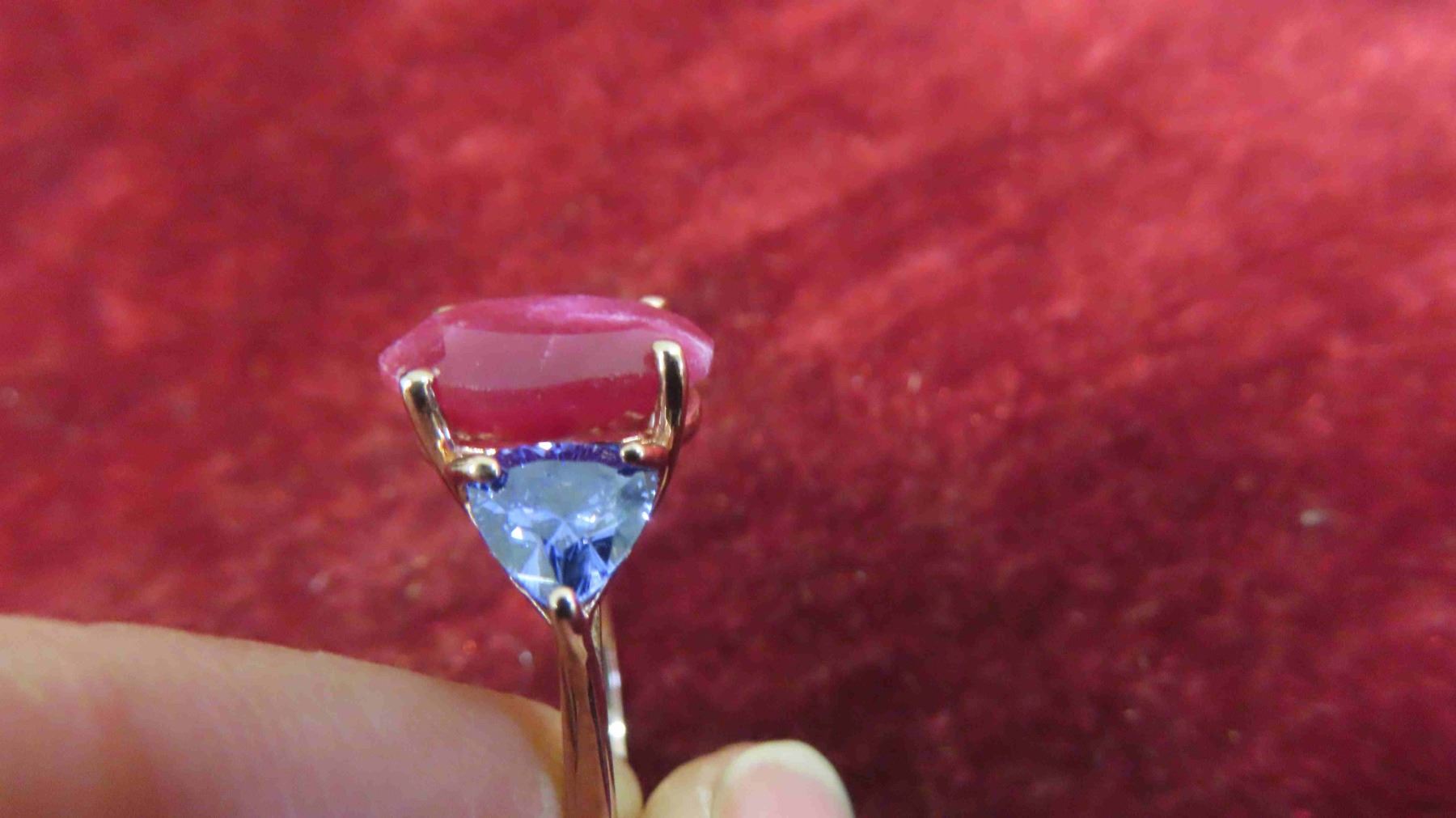 New 10kt Rose Gold Ring with Genuine Ruby + 2 Created Tanzanites , Total Carrot Weight 8.62 , Size 5 1/2-6 with Appraisal