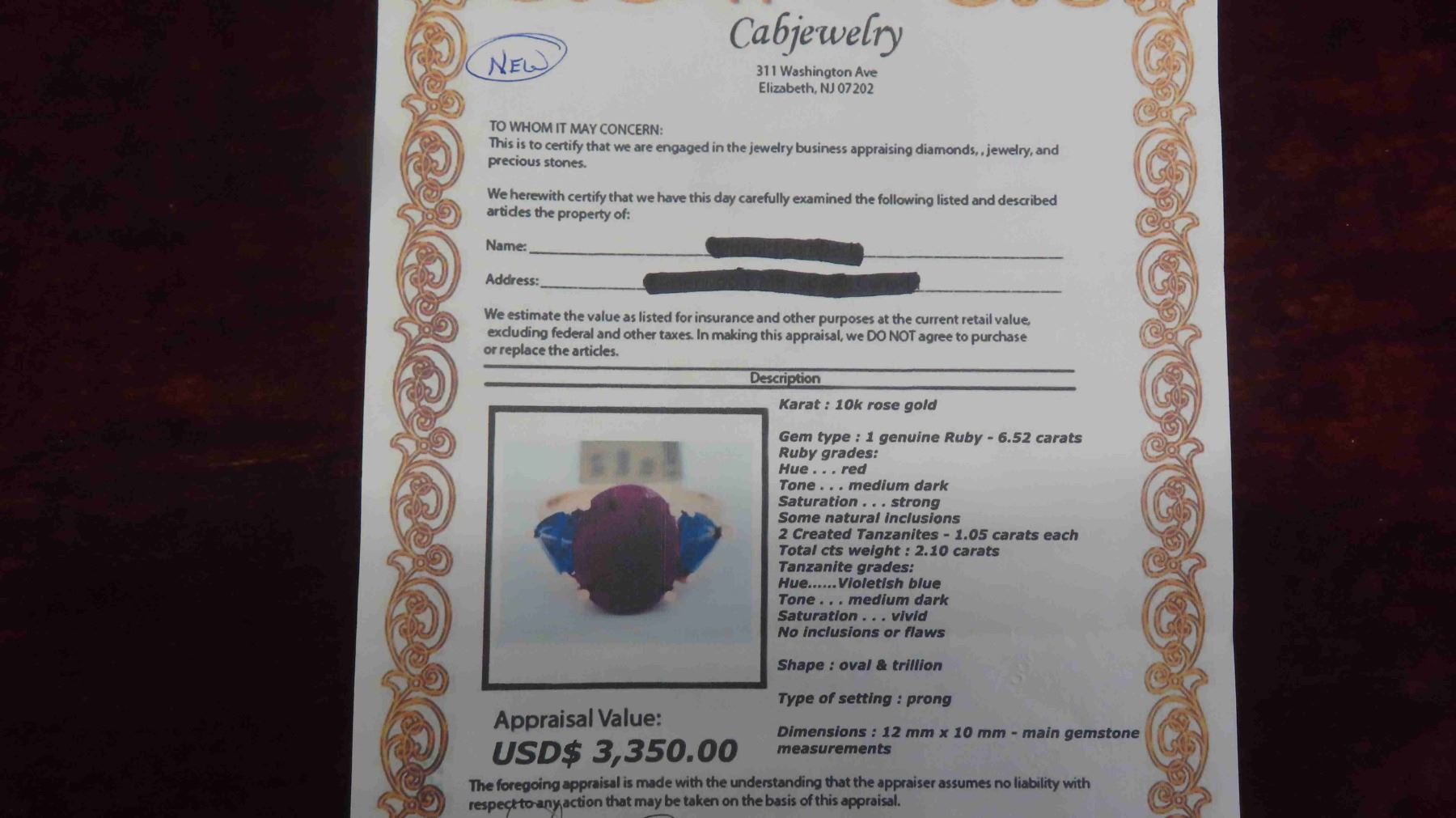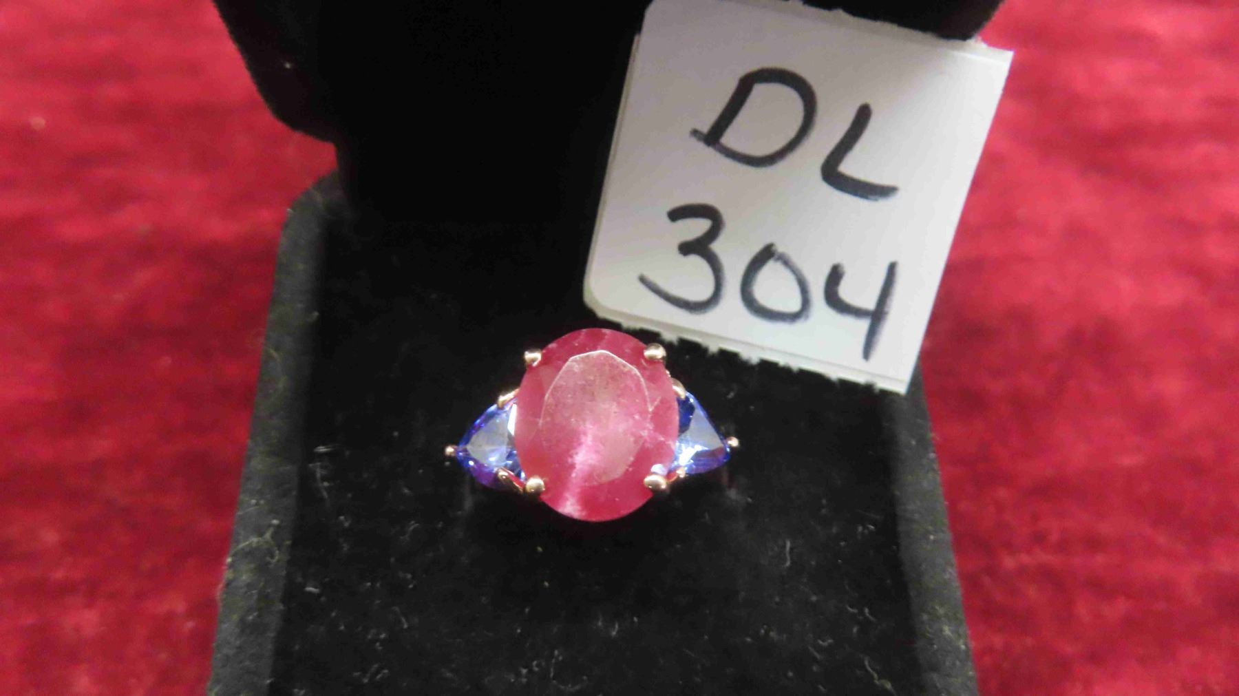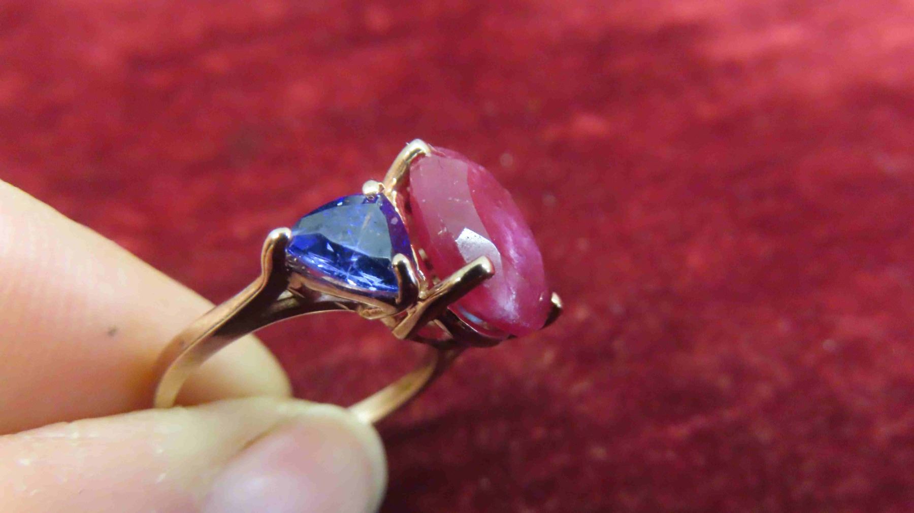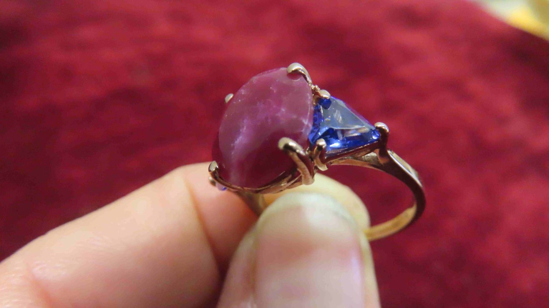 New 10kt Rose Gold Ring with Genuine Ruby + 2 Created Tanzanites , Total Carrot Weight 8.62 , Size 5 1/2-6 with Appraisal