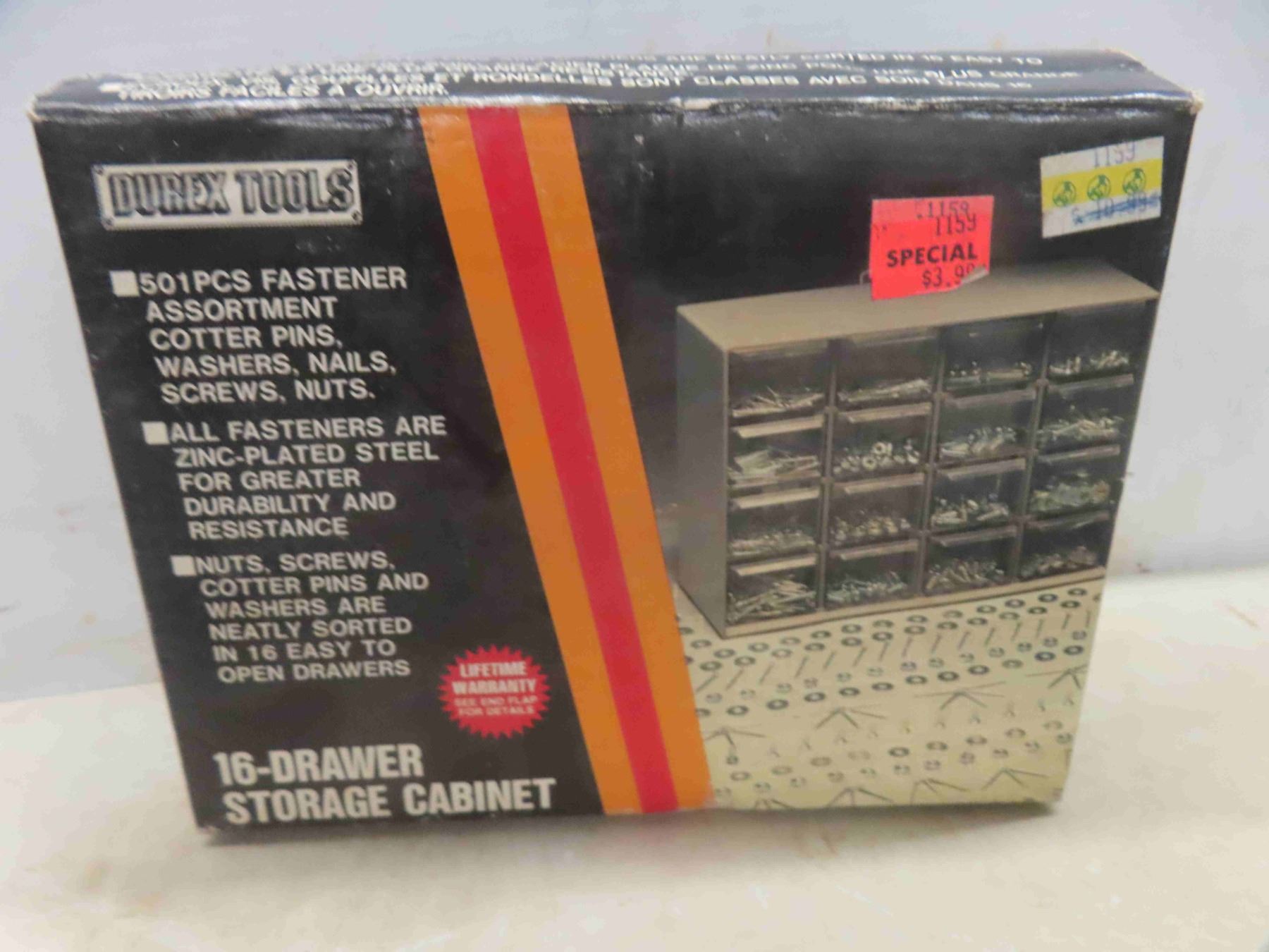 New 16 Drawer Plastic Fastener Cabinet , Power Bar , Snake, Weather Stripping , Window Screen & More