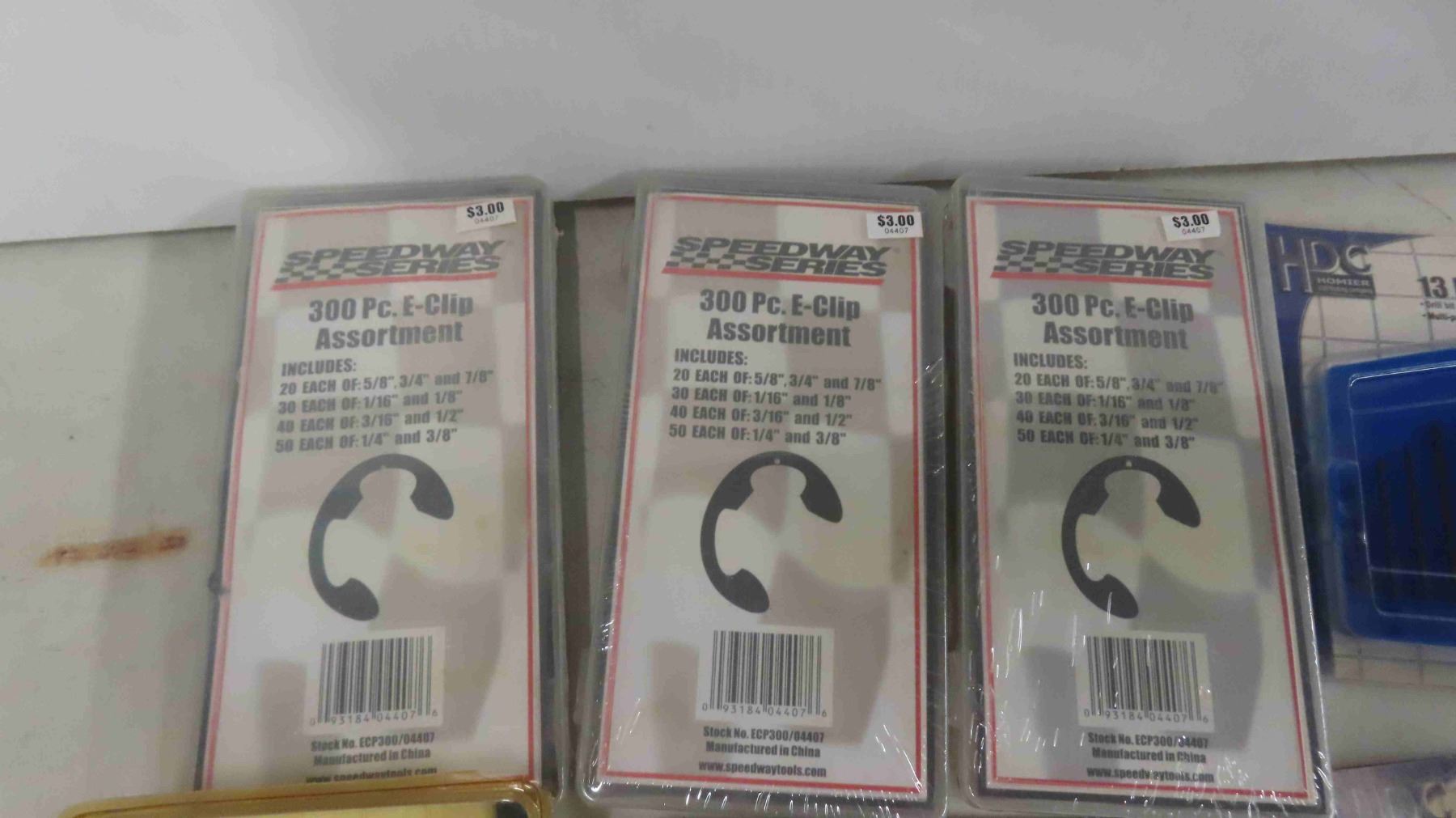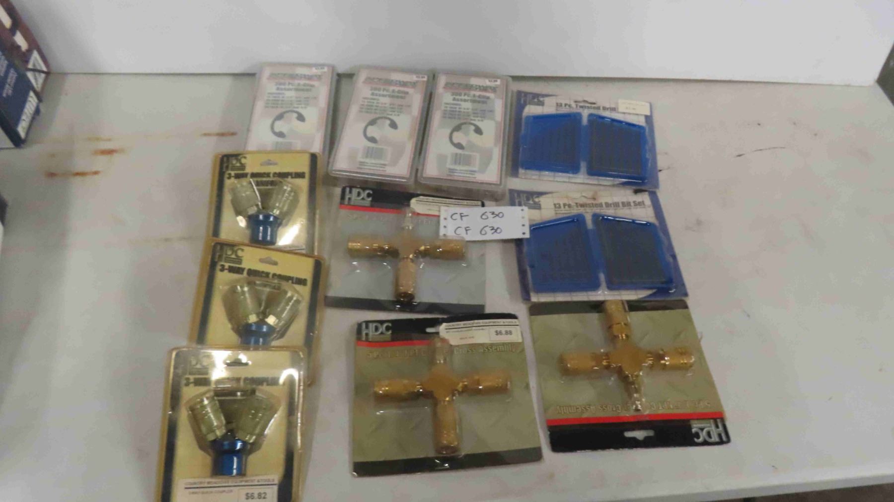 New (3) 300 Piece E-Clips Kit, New (3) 3 Way Air Coupling, New 5 Piece Coupling Assembly, New Drill Bits
