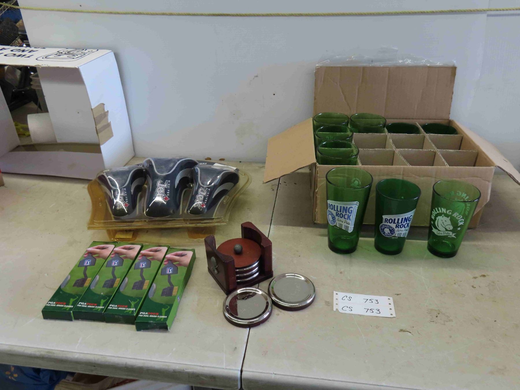 New 3 Pack Golf Club Head Covers, 4 PGA Tour Pro Dual Brush Cleaner, Golfers Coaster Set , 9 Vintage Rolling Rock Glasses