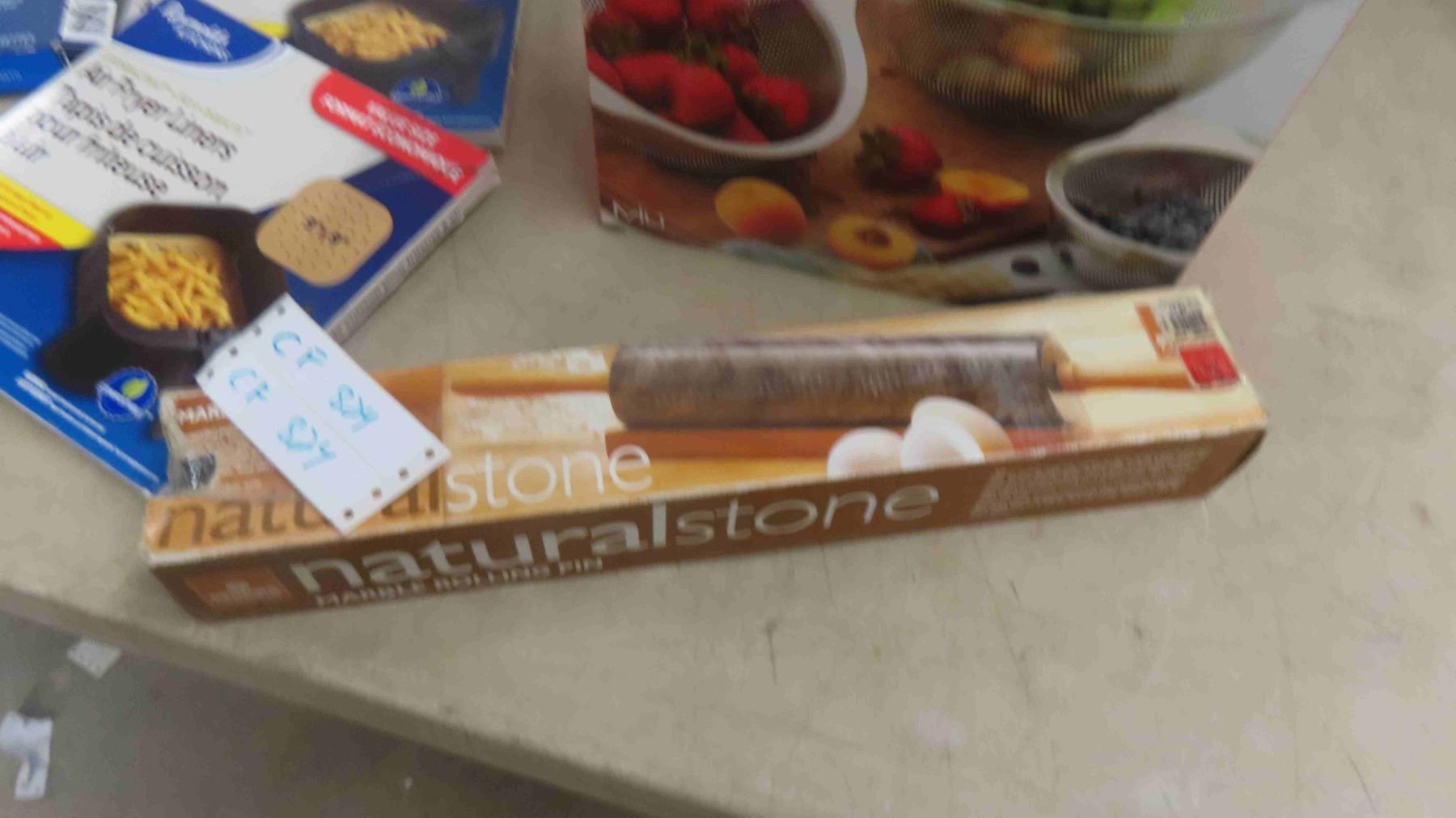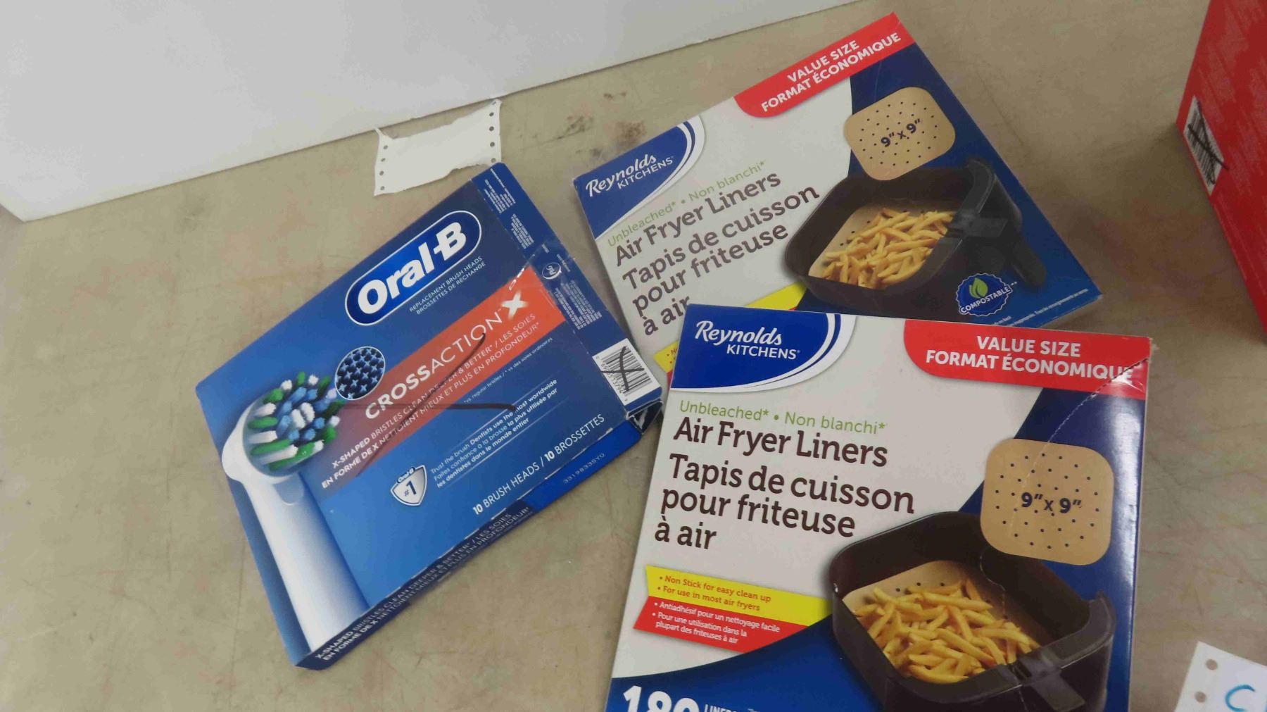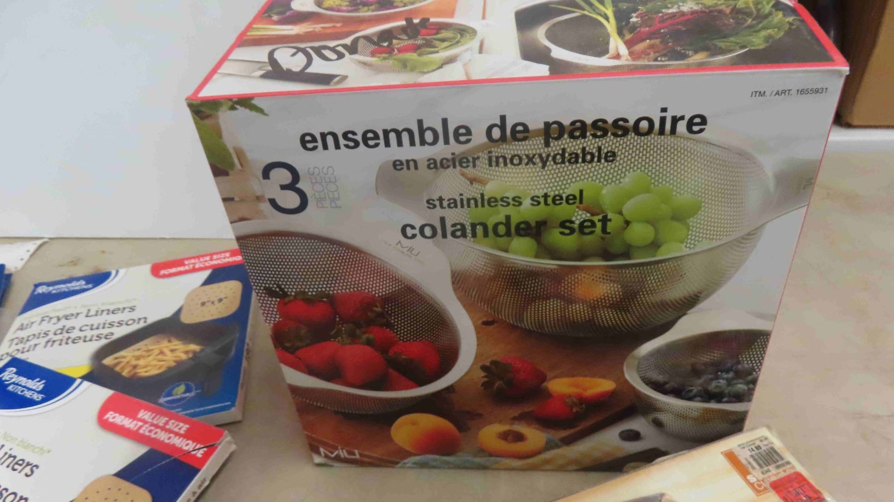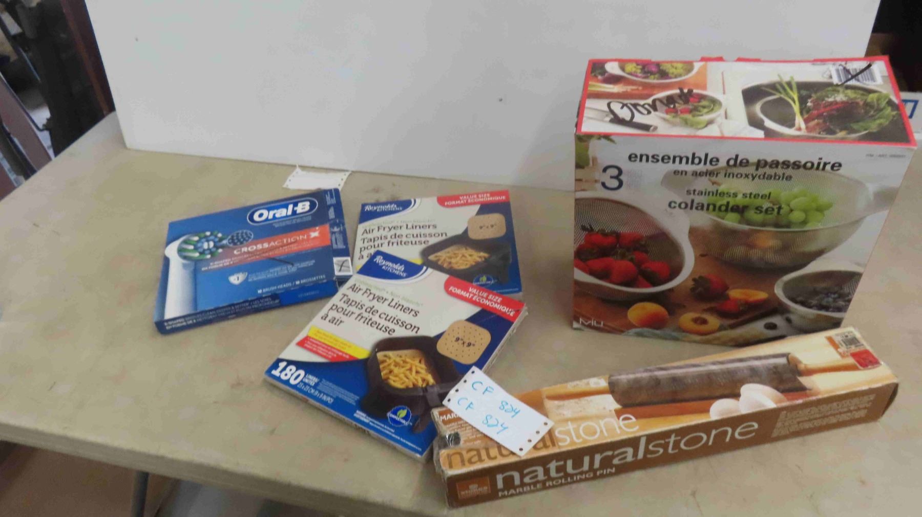 New 3 Piece Stainless Steel Collander Set, Marble Rolling Pin, Oral B Replacement Brush Heads, 2 Packages of Air Fryer Liners