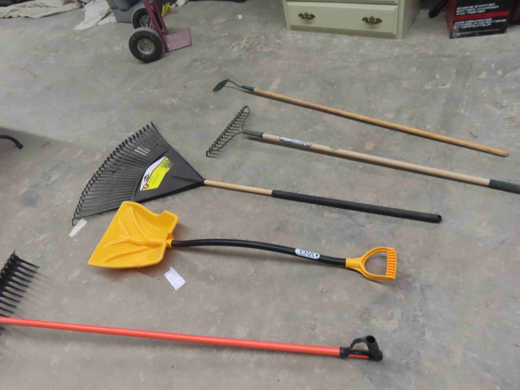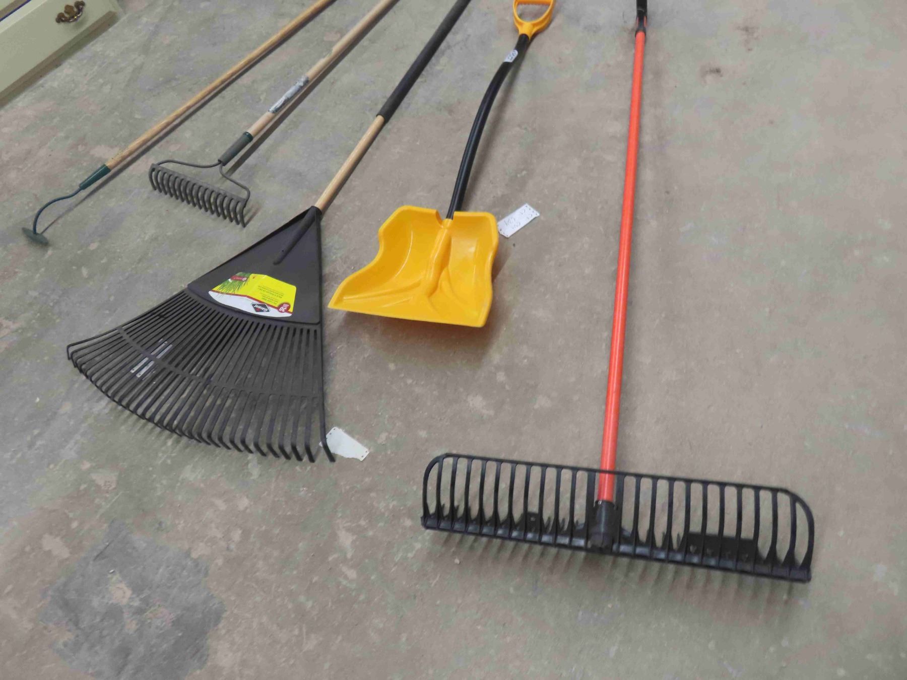 New 5 Hand Yard Tools : 3 Rakes All Different, Snow Shovel,
