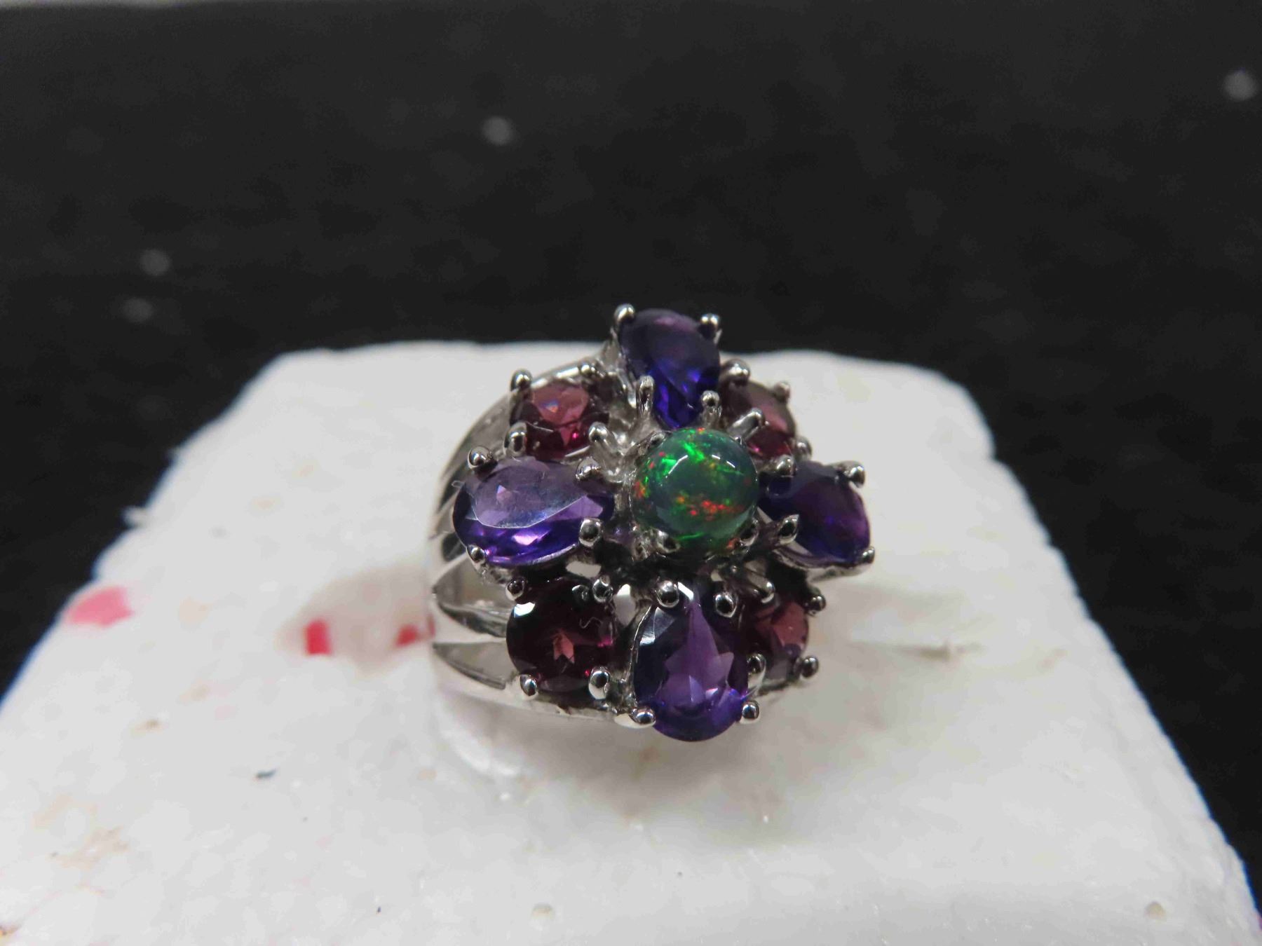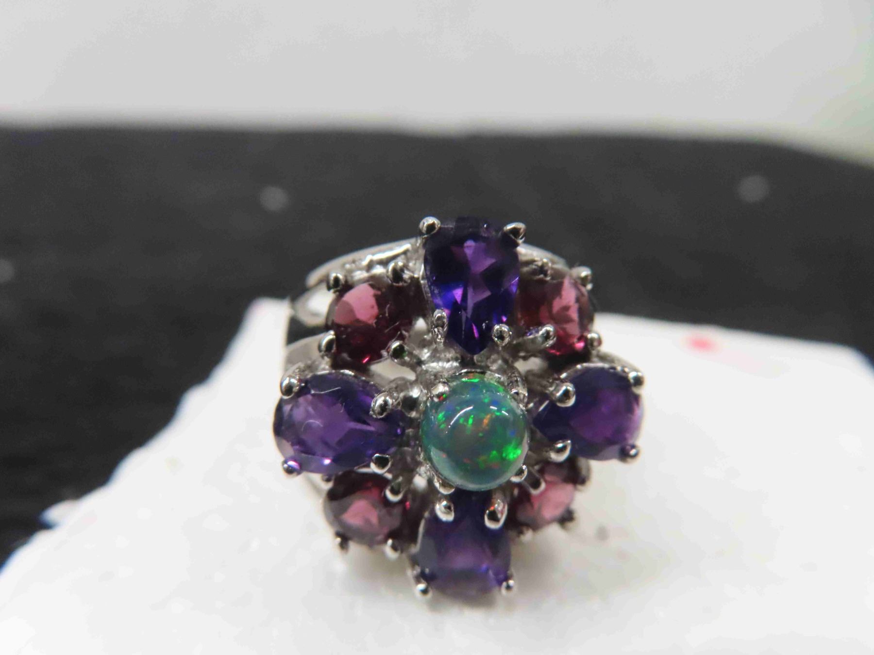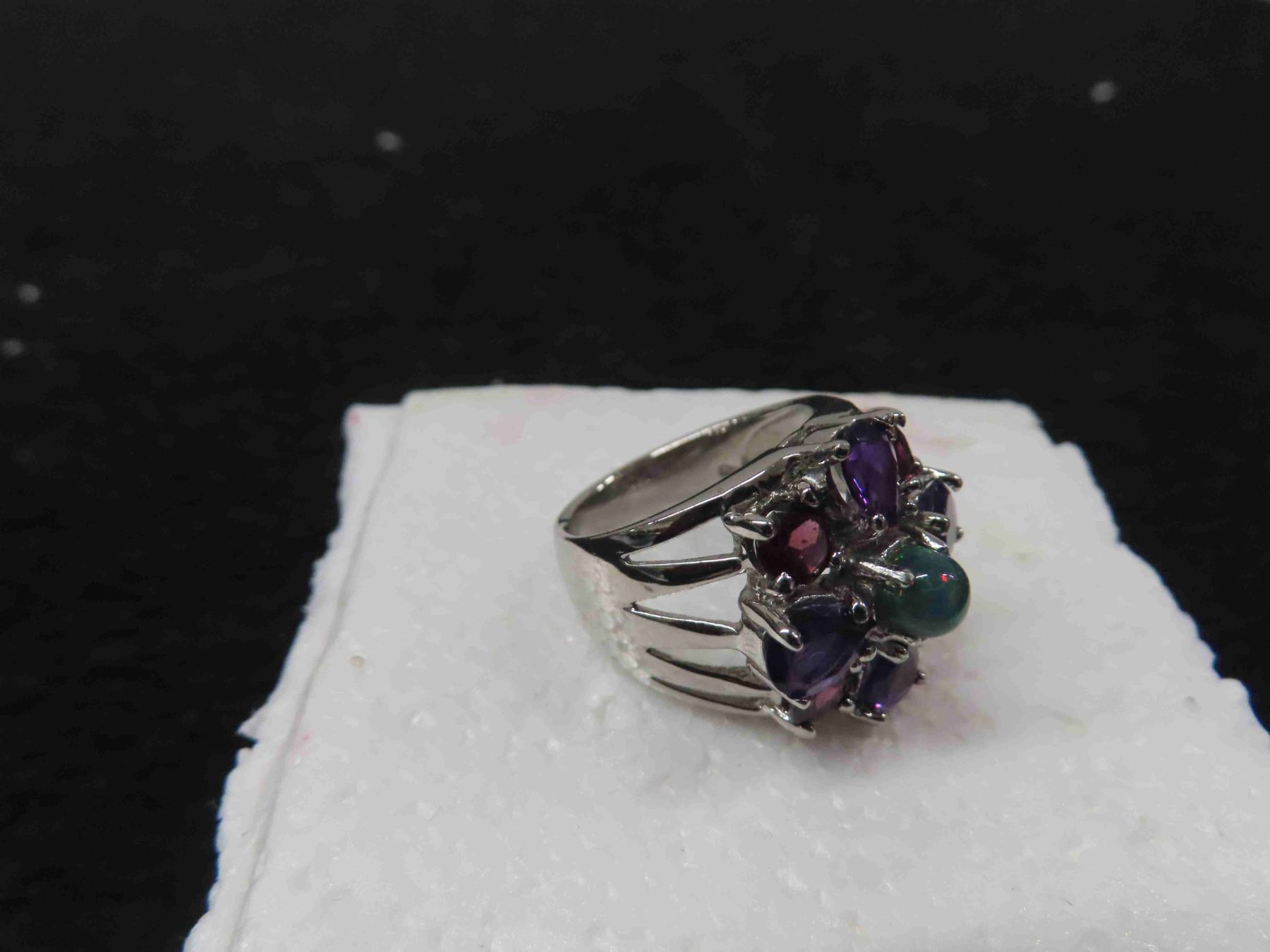 New Amethyst Garnet Opal Center 14K Gold Plated Sterling Silver : Weight 8.86 Grams , Size 7