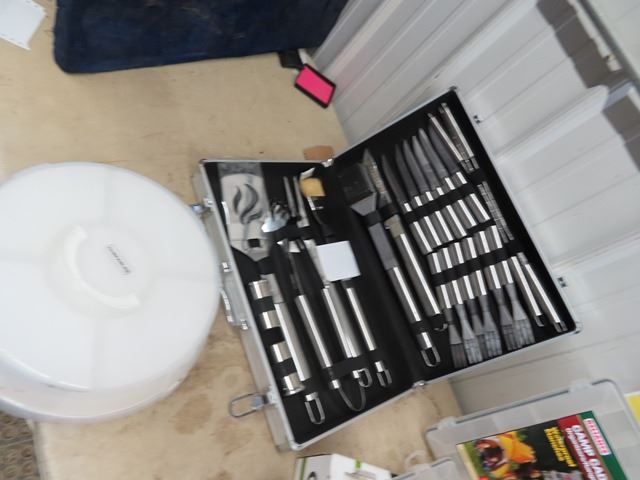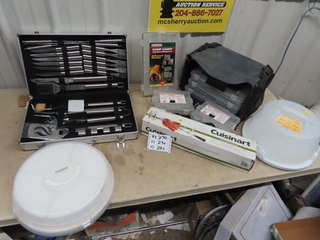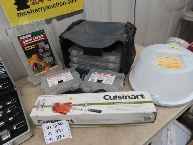 New BBQ Utensil Set w Case, New Camp Caddy Organizer, New Cuisinart Rotissiere , & New Cake Caddy