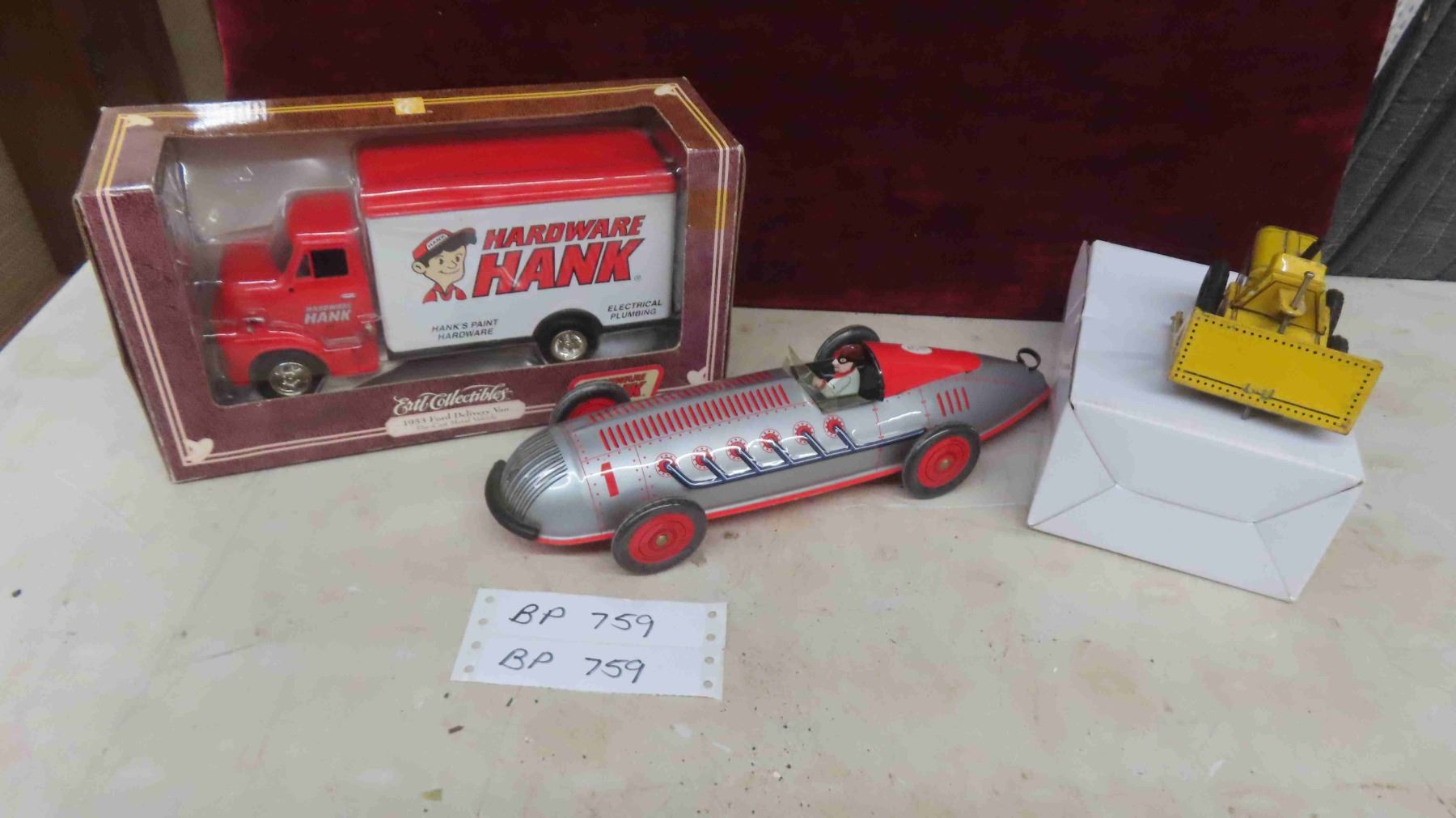 New Ertl Collectibles 1953 Ford Delivery Van with Hardware Hank Advertising , Schylling Tin Race Car