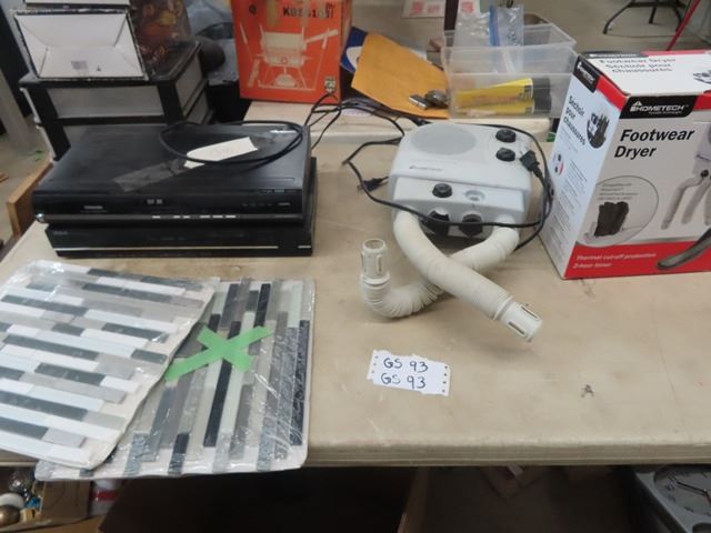 New Footwear Dryer, 1 used Footwear Dryer 1) Toshiba DVD PLayer 1) RCA DVD Player, 1 Tile